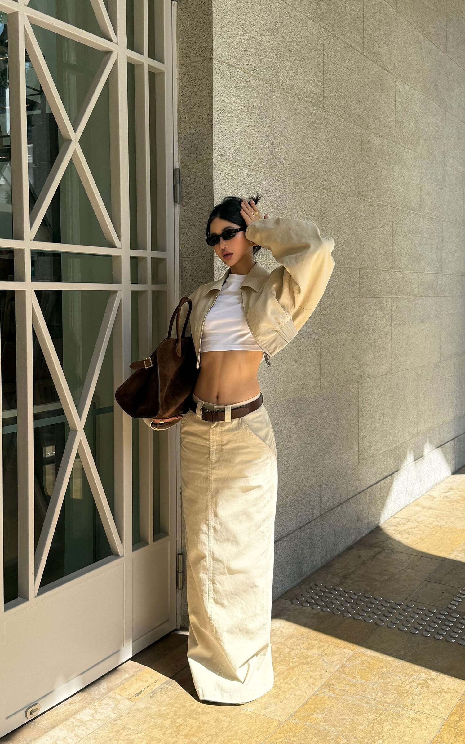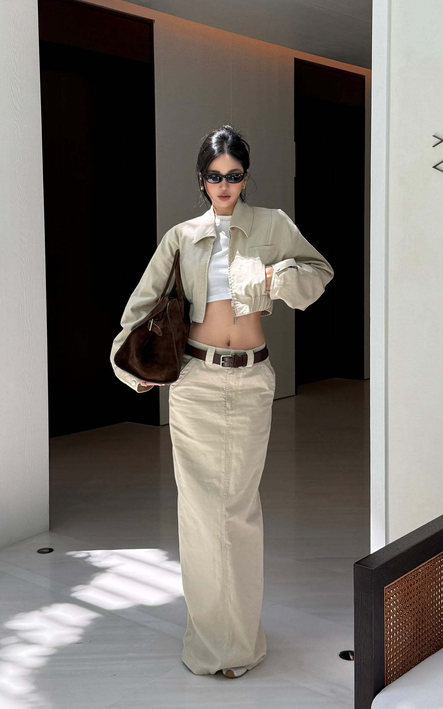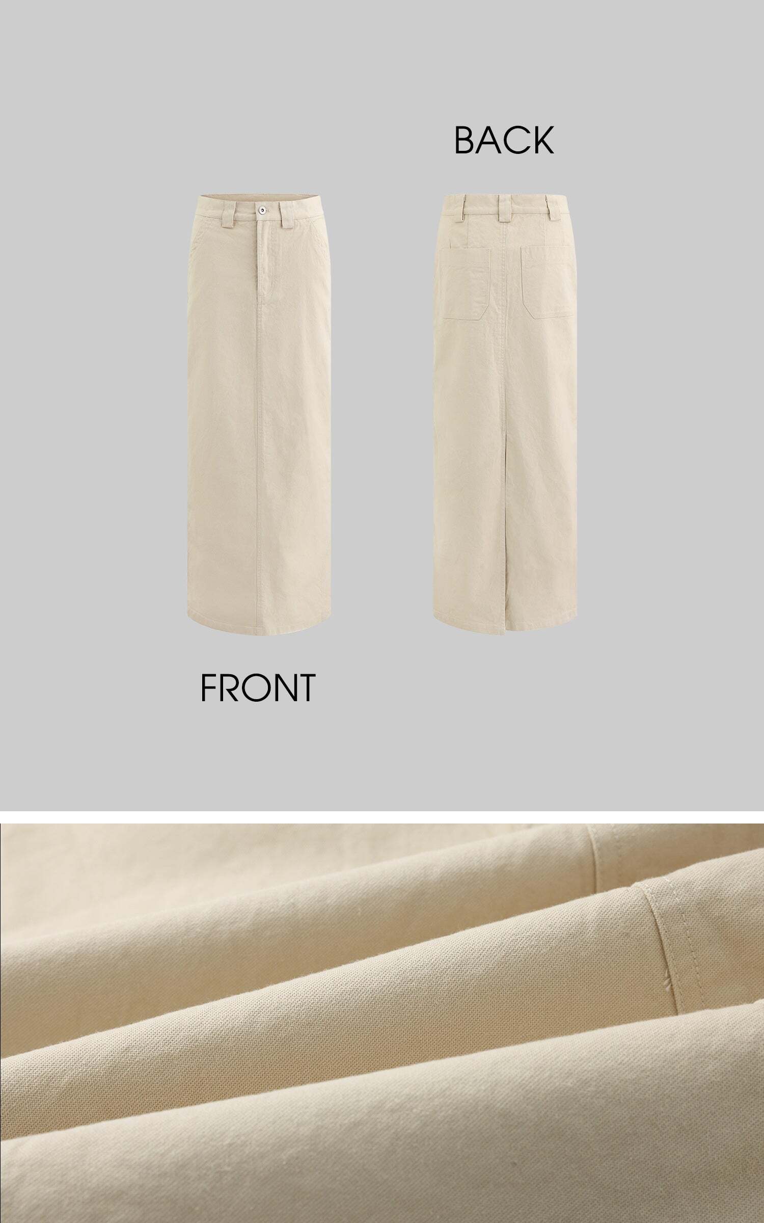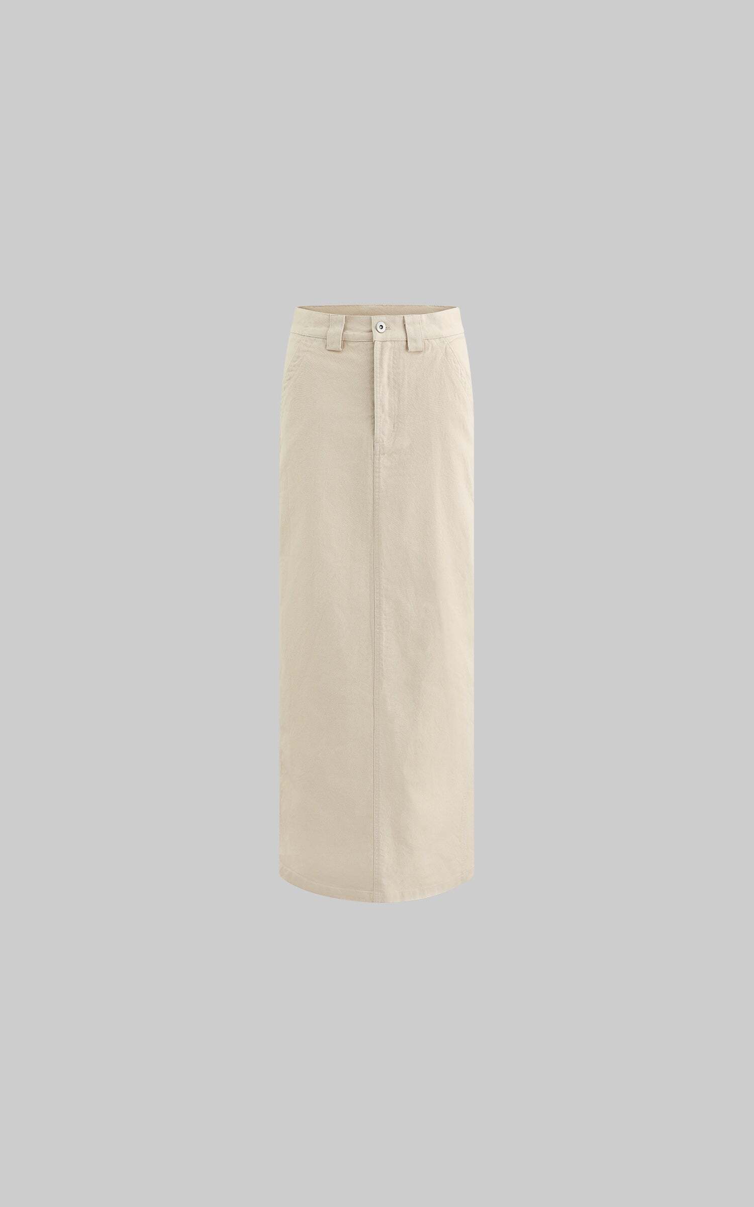 A modern staple reimagined with utilitarian edge—this high-waisted column skirt speaks the language of clean lines and cool confidence. Cut from a crisp cotton blend, it holds its shape while allowing natural movement through a subtle front slit. The soft beige hue offers endless styling potential, grounding even the most dramatic tops in understated elegance.Pair it with oversized shirting, barely-there sandals, or a structured crop for a look that says effortless authority.
