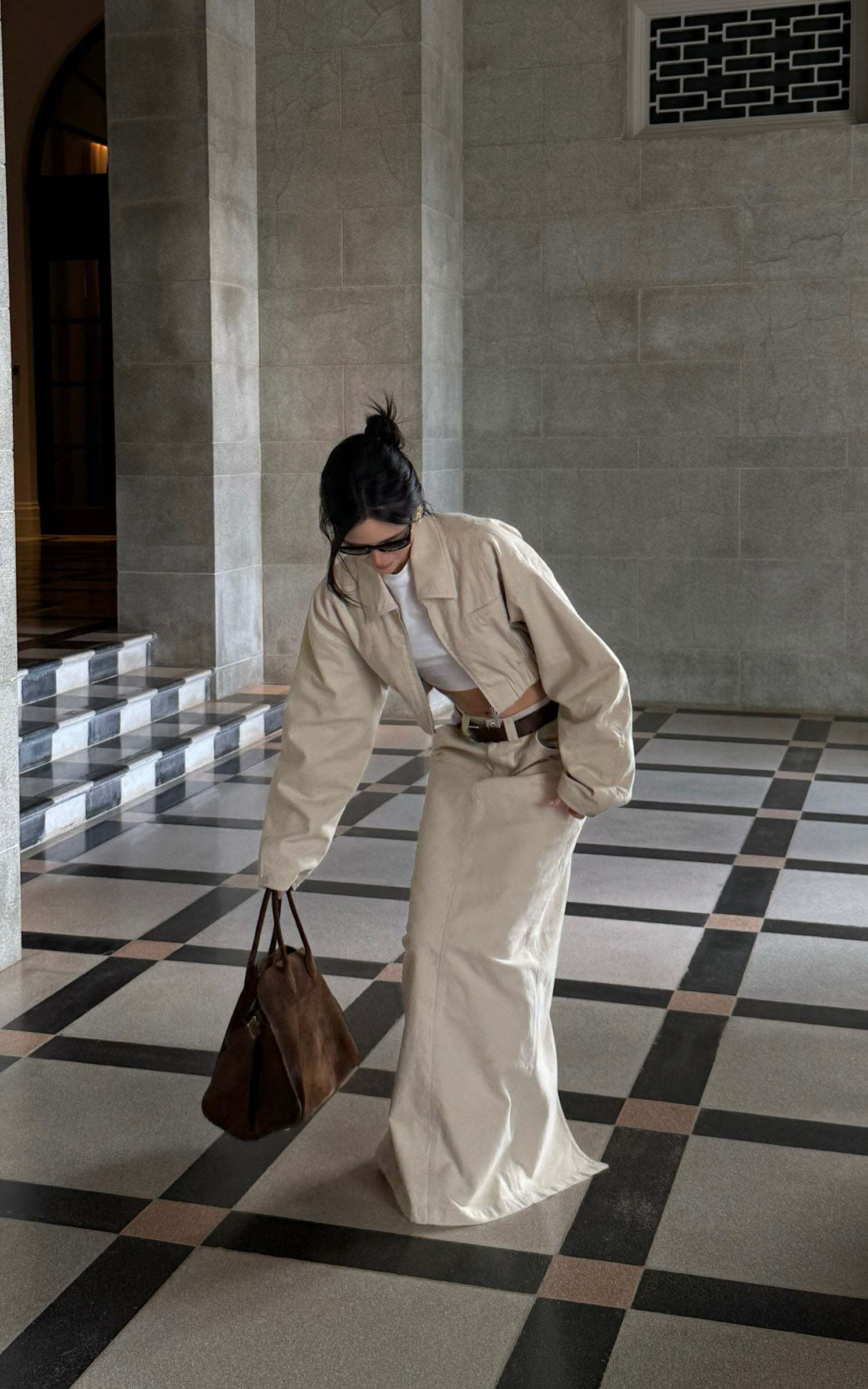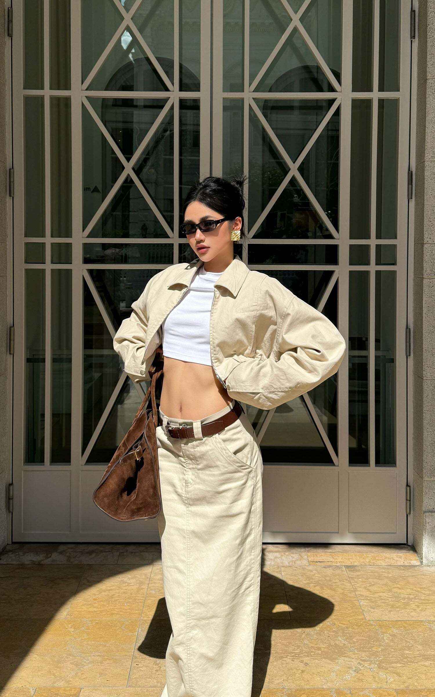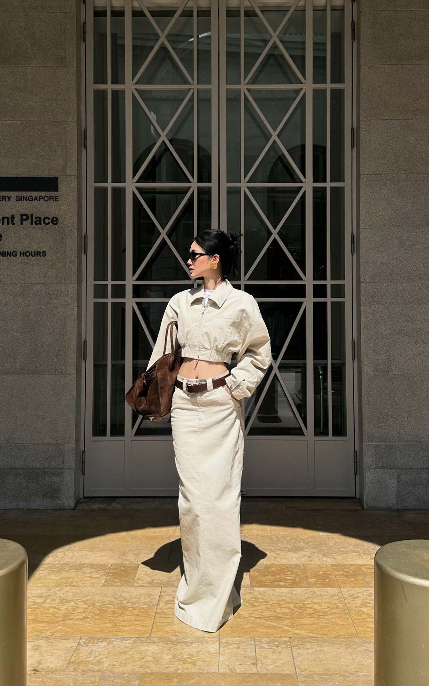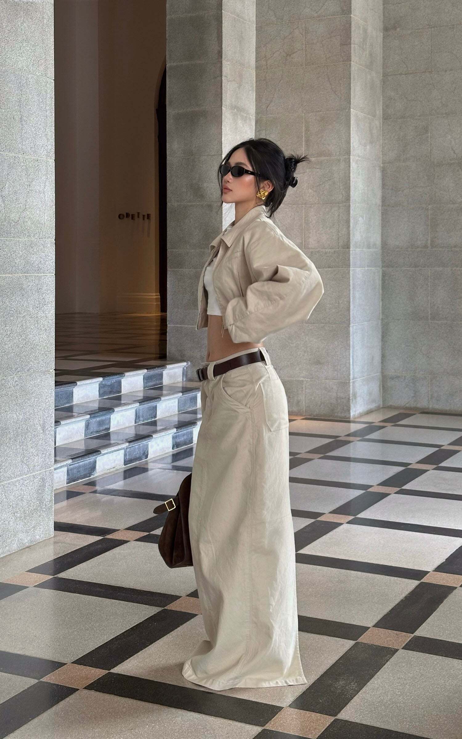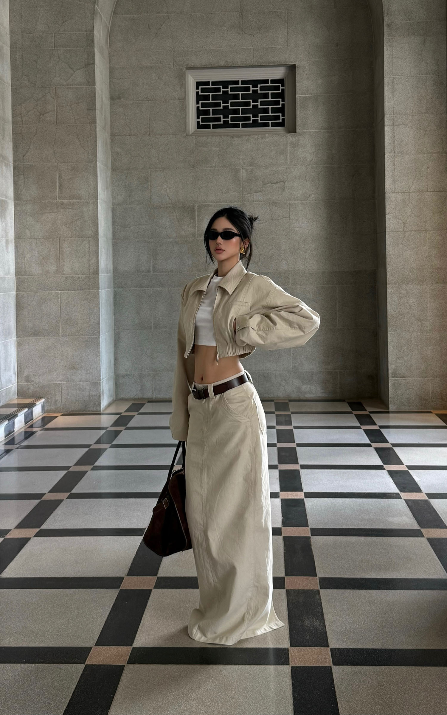 A modern staple reimagined with utilitarian edge—this high-waisted column skirt speaks the language of clean lines and cool confidence. Cut from a crisp cotton blend, it holds its shape while allowing natural movement through a subtle front slit. The soft beige hue offers endless styling potential, grounding even the most dramatic tops in understated elegance.Pair it with oversized shirting, barely-there sandals, or a structured crop for a look that says effortless authority.