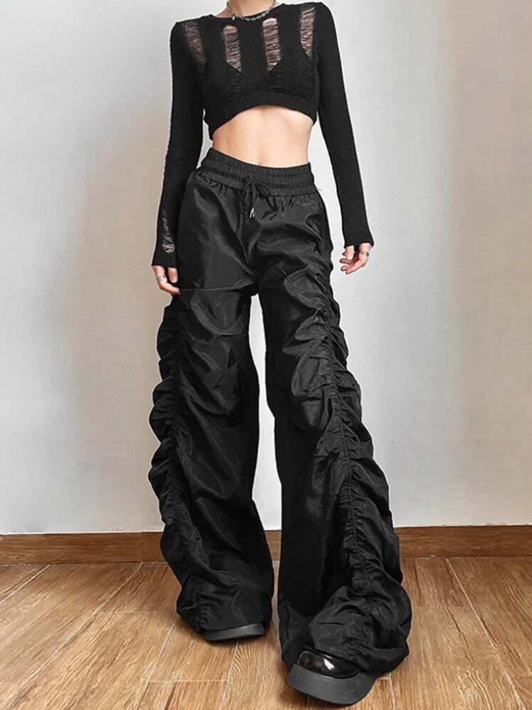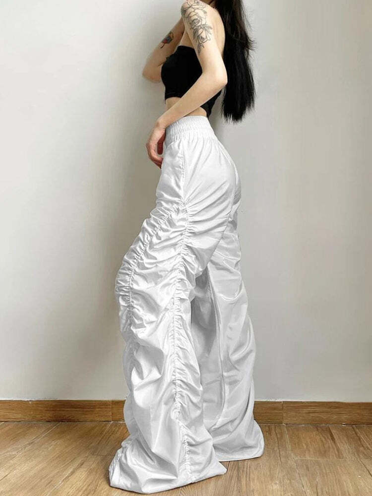 The Ruched Parachute Pants combine street style with high fashion, featuring exaggerated ruching for a bold look. Lightweight and versatile, they pair perfectly with crop tops, oversized shirts, or jackets.