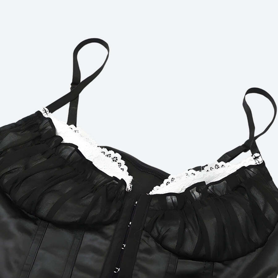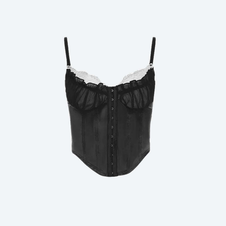 Turn up the flirt factor with this satin corset top. The glossy black finish and front hook detail sculpt your shape, while the white lace trim adds a romantic contrast. Adjustable straps offer a secure fit, making it a dreamy pick for coquette aesthetics, date nights, or layered streetwear looks.