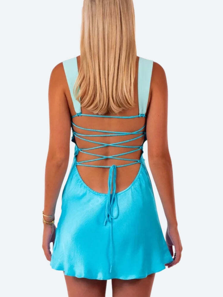 Make a shimmering entrance in this Satin Lace Up Backless Mini Dress. Featuring a soft aqua and sky blue color combo, this sultry silhouette is designed with a twist-front bodice, a curve-skimming satin skirt, and an eye-catching lace-up back that demands attention from every angle.