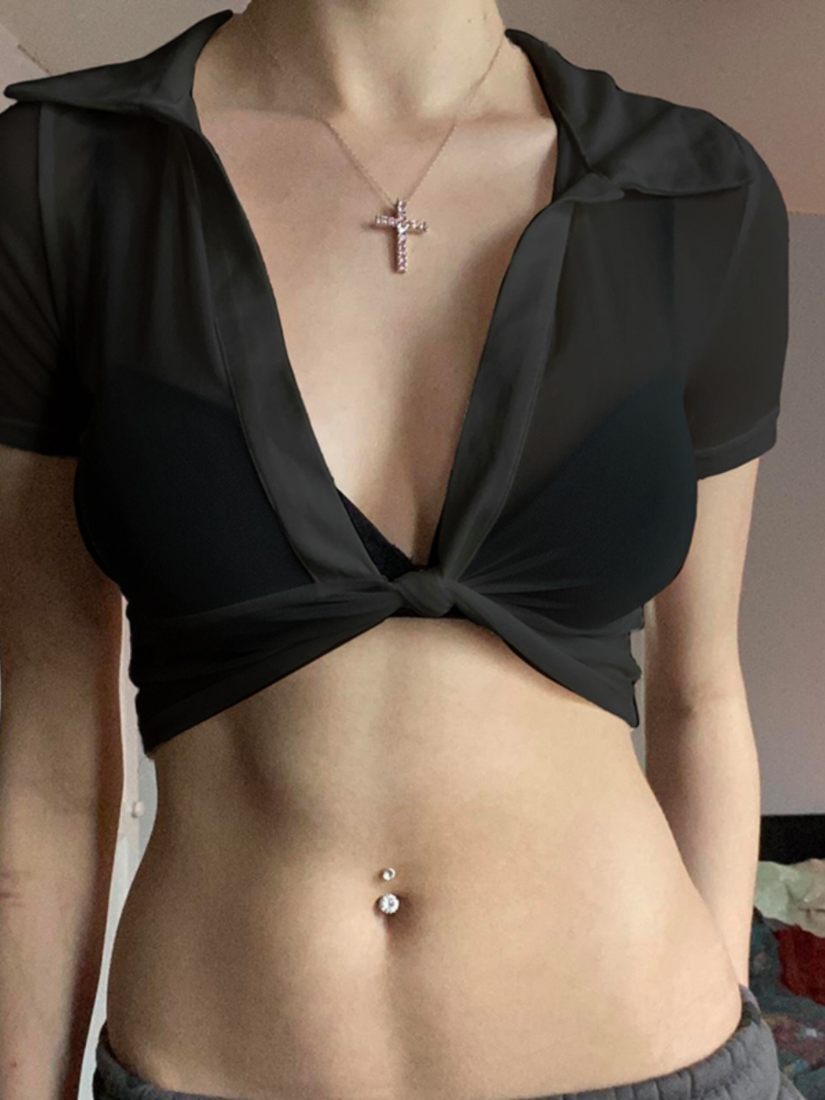 Elevate your night-out wardrobe with our Sexy Mesh Sheer Knotted Tie Deep V Short Top for Women, designed for the ultimate hot girl style. This trendy fashion piece features a daring deep V neckline and a playful knotted tie that accentuates your figure while providing a subtle allure. Perfect for pairing with high-waisted jeans or a sleek skirt, this top is your go-to for making a statement. Don’t miss out add this must-have item to your cart and turn heads wherever you go!