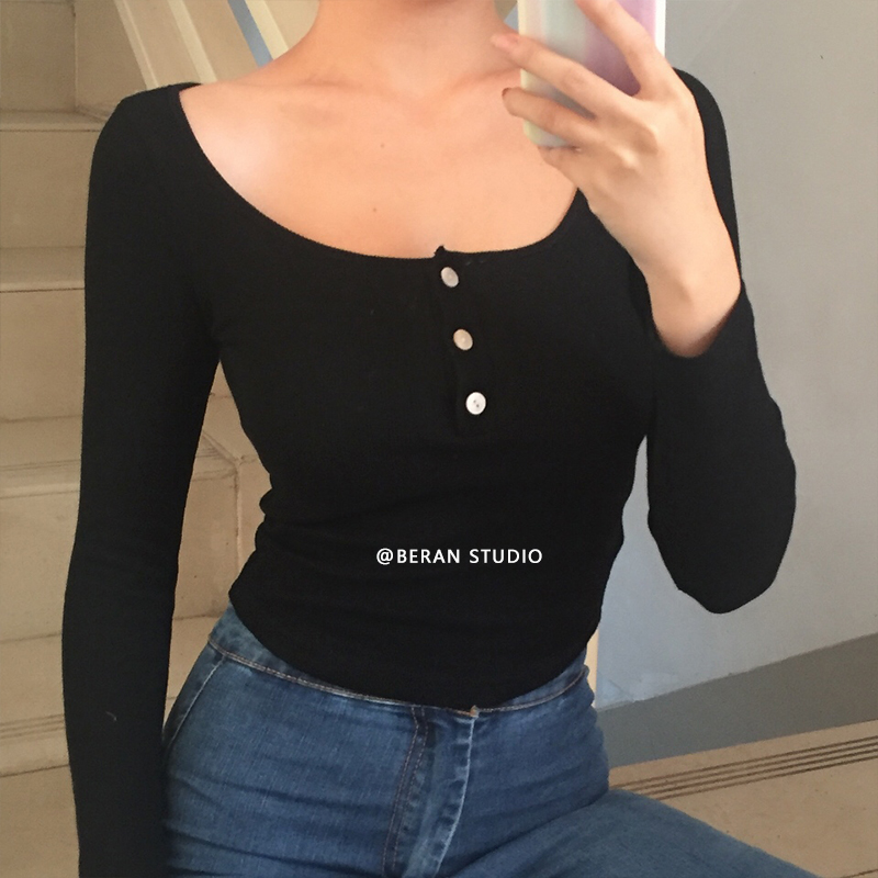 Elevate your wardrobe with our Sexy Slim-Fit Ribbed Long Sleeve T-Shirt, designed with a flattering large round neck and a chic three-button detail that adds a touch of sophistication. The curved hem enhances your silhouette, making it perfect for both casual outings and stylish layering. Experience the perfect blend of European and American style add this essential piece to your collection today and enjoy effortless elegance. Shop now!