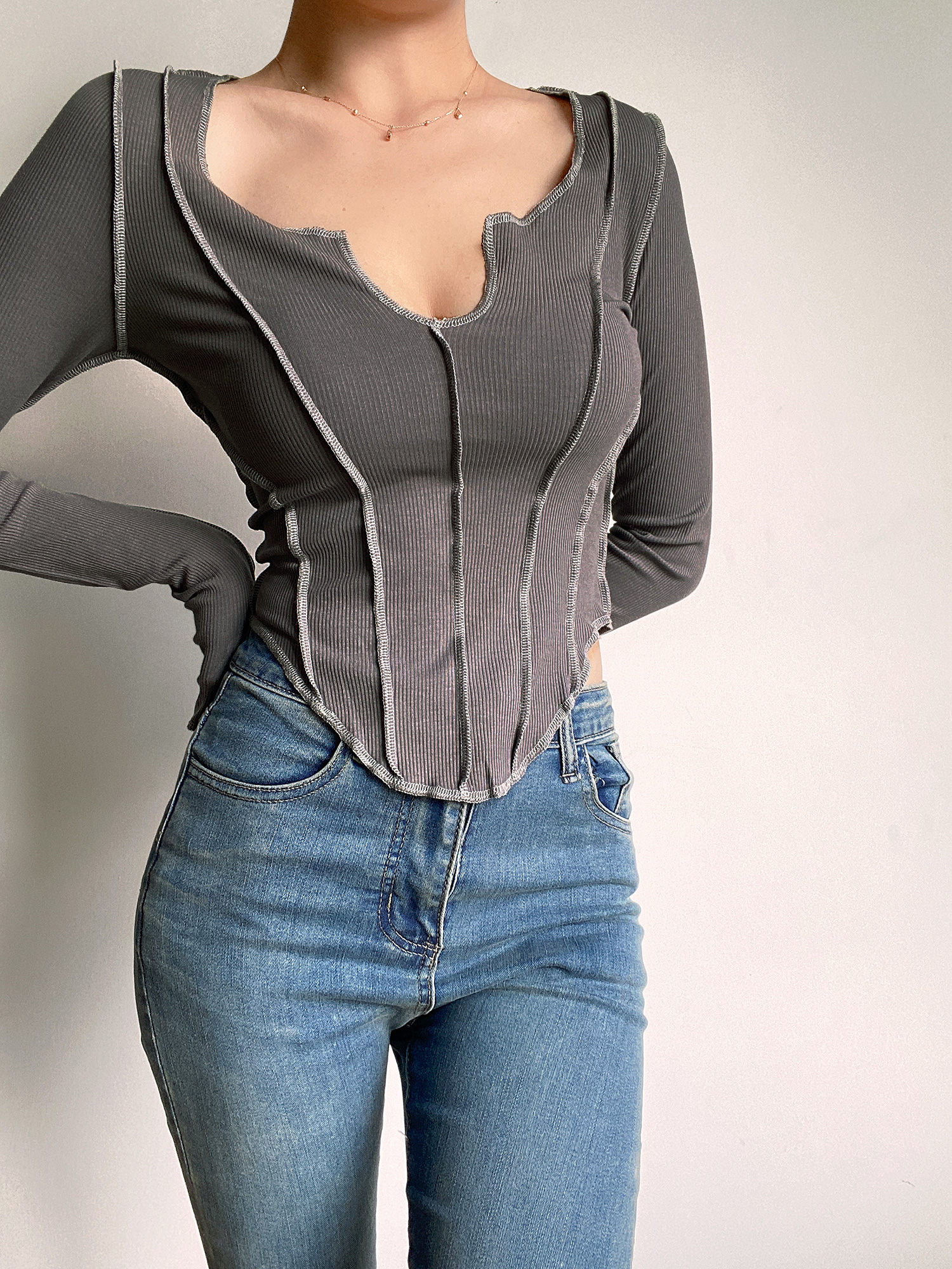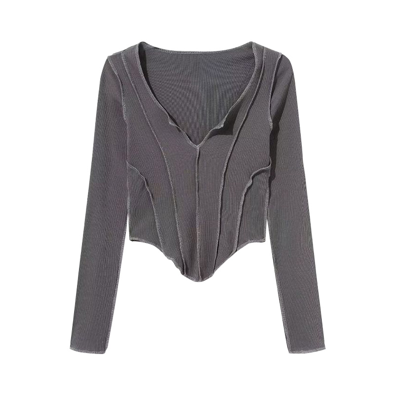 V- Neck Long Sleeve Curved Hem, High Waisted Slim Fit, Solid European – Outfit Inspo