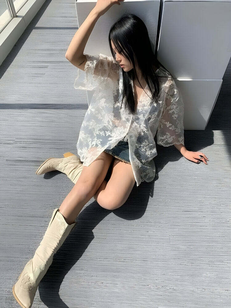 Sheer Floral Lace Shirt High-quality product featuring outfit inspo, spring outfit, 90s fashion and more. Modern design that fits the latest trends. Premium materials ensure durability and comfort. Order now for special offers! Product designed with attention to every detail. Suitable for all occasions and personal styles.