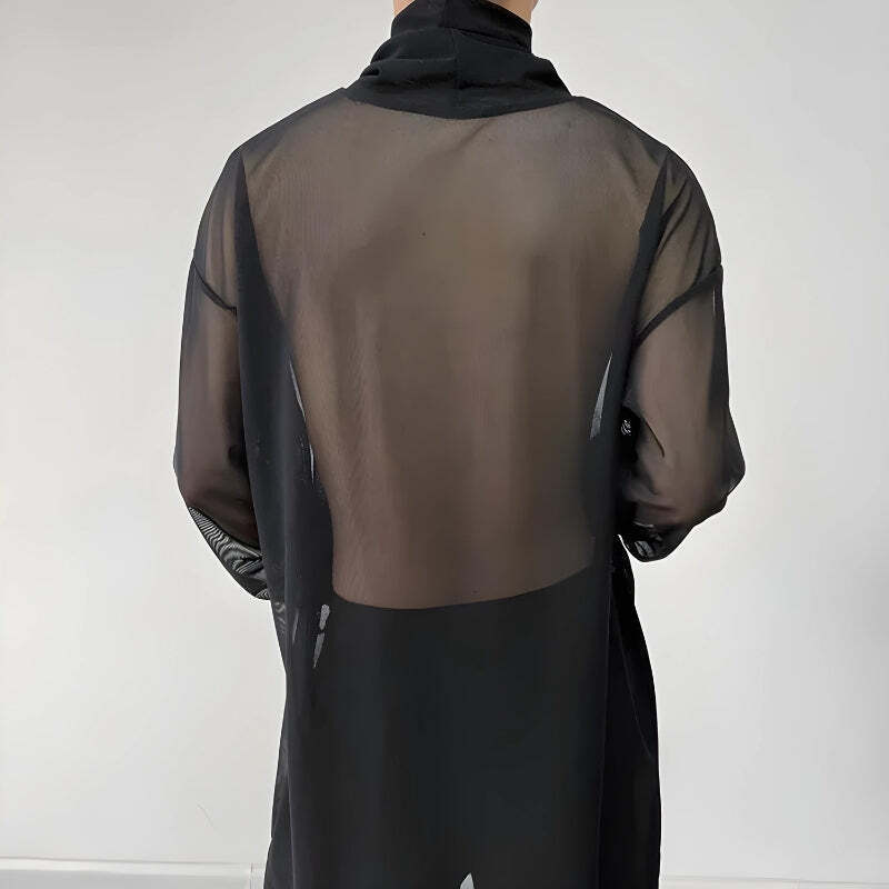Capture a bold, contemporary look with this sheer mesh turtleneck top. Its high collar and long sleeves offer a sleek silhouette, while the transparent fabric adds an edge of sophistication. Ideal for layering under a blazer, this top is perfect for evening outings or adding a modern twist to daytime wear. Pair it with tailored trousers to complete the ensemble.