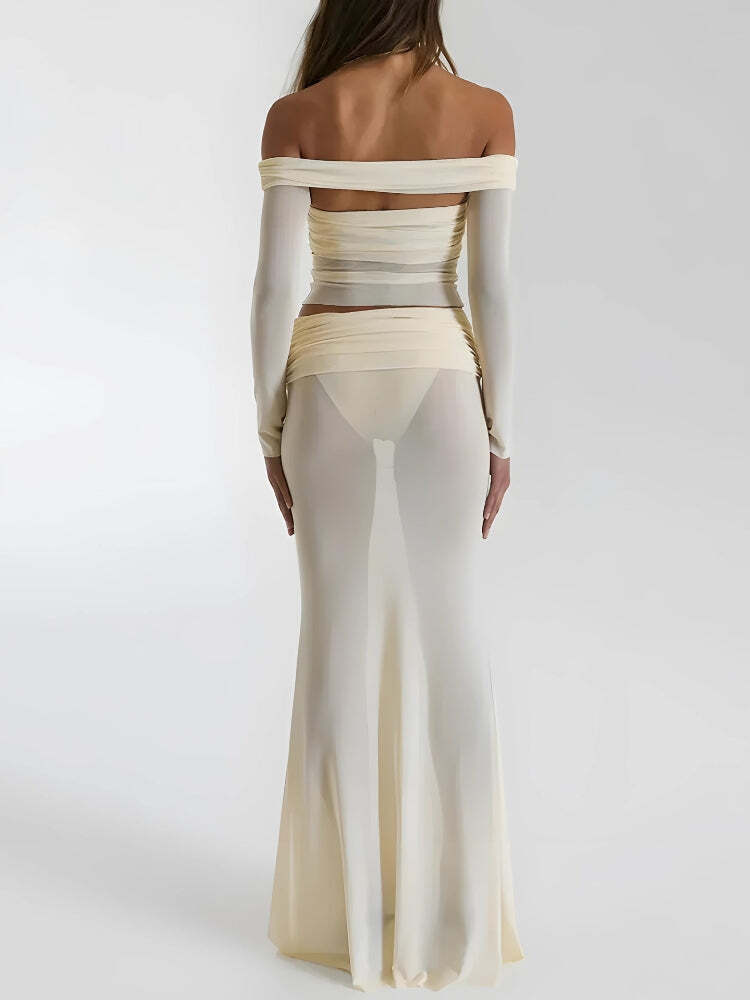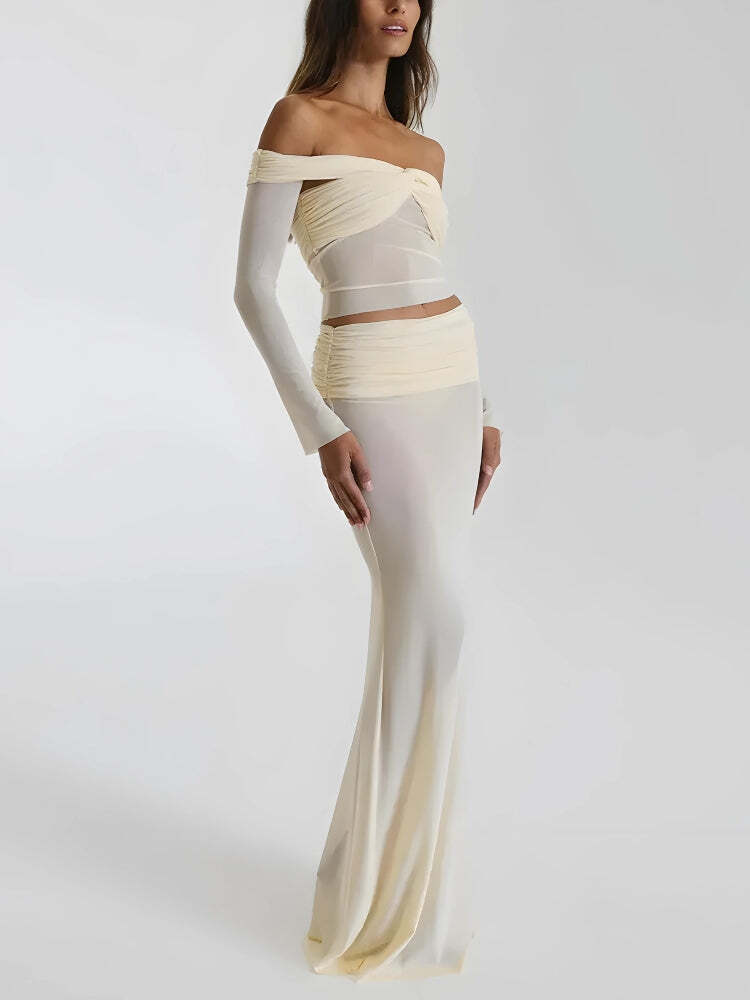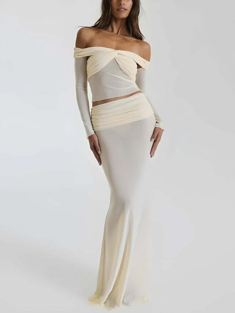 This elegant two-piece set includes a sheer off-shoulder top paired with a matching maxi skirt. The top is designed with a flattering off-shoulder neckline and long sleeves, creating a sophisticated and delicate look. The maxi skirt complements the top, offering a graceful and flowing appearance. Ideal for special occasions, this set exudes timeless beauty and effortless style.