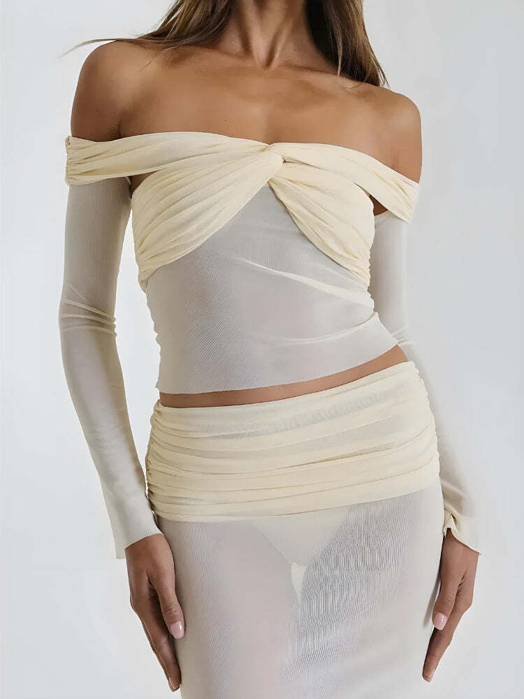 Sheer Off Shoulder Top & Maxi Skirt Two Piece Set High-quality product featuring pretty outfits, fashion outfits, outfit ideas and more. Modern design that fits the latest trends. Premium materials ensure durability and comfort. Order now for special offers! Product designed with attention to every detail. Suitable for all occasions and personal styles.