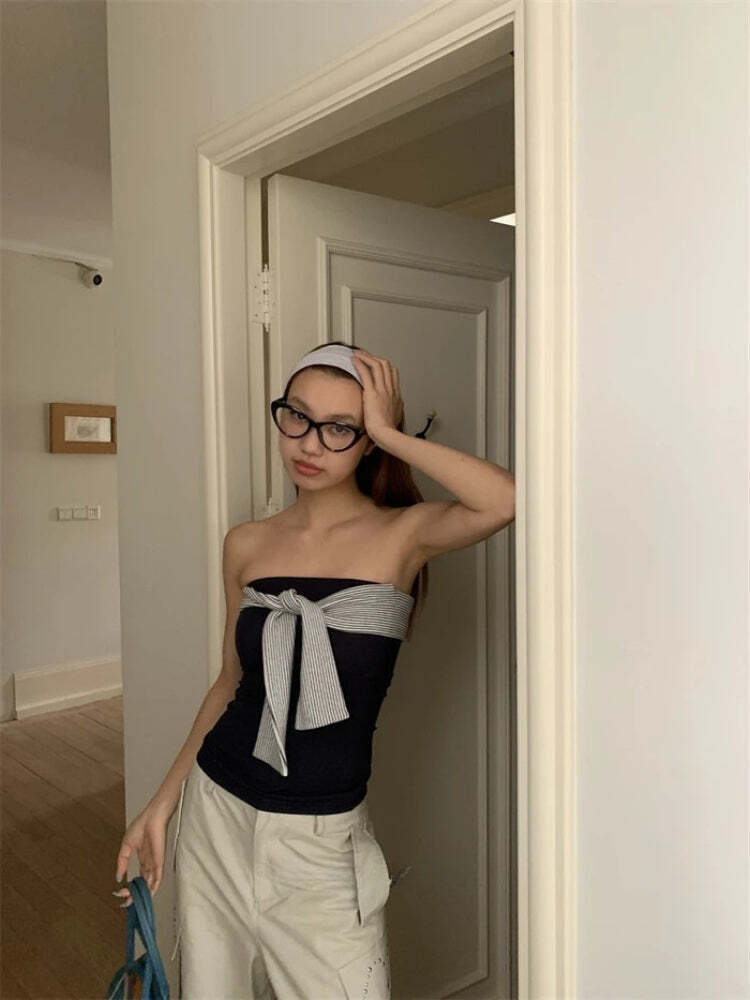 Strapless top with striped shirt tie detail. A chic Light Academia look that pairs perfectly with loose trousers or skirts for everyday soft-edgy vibes.