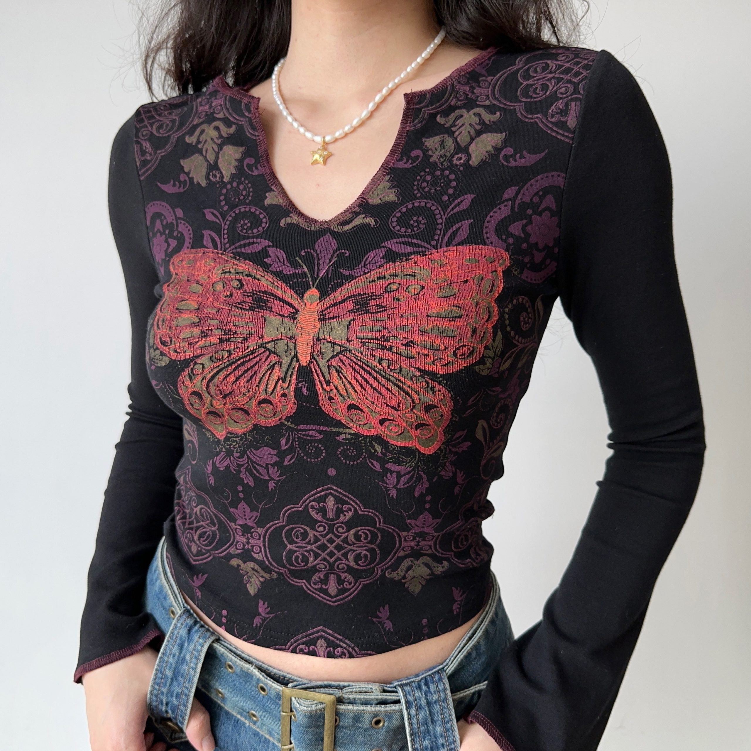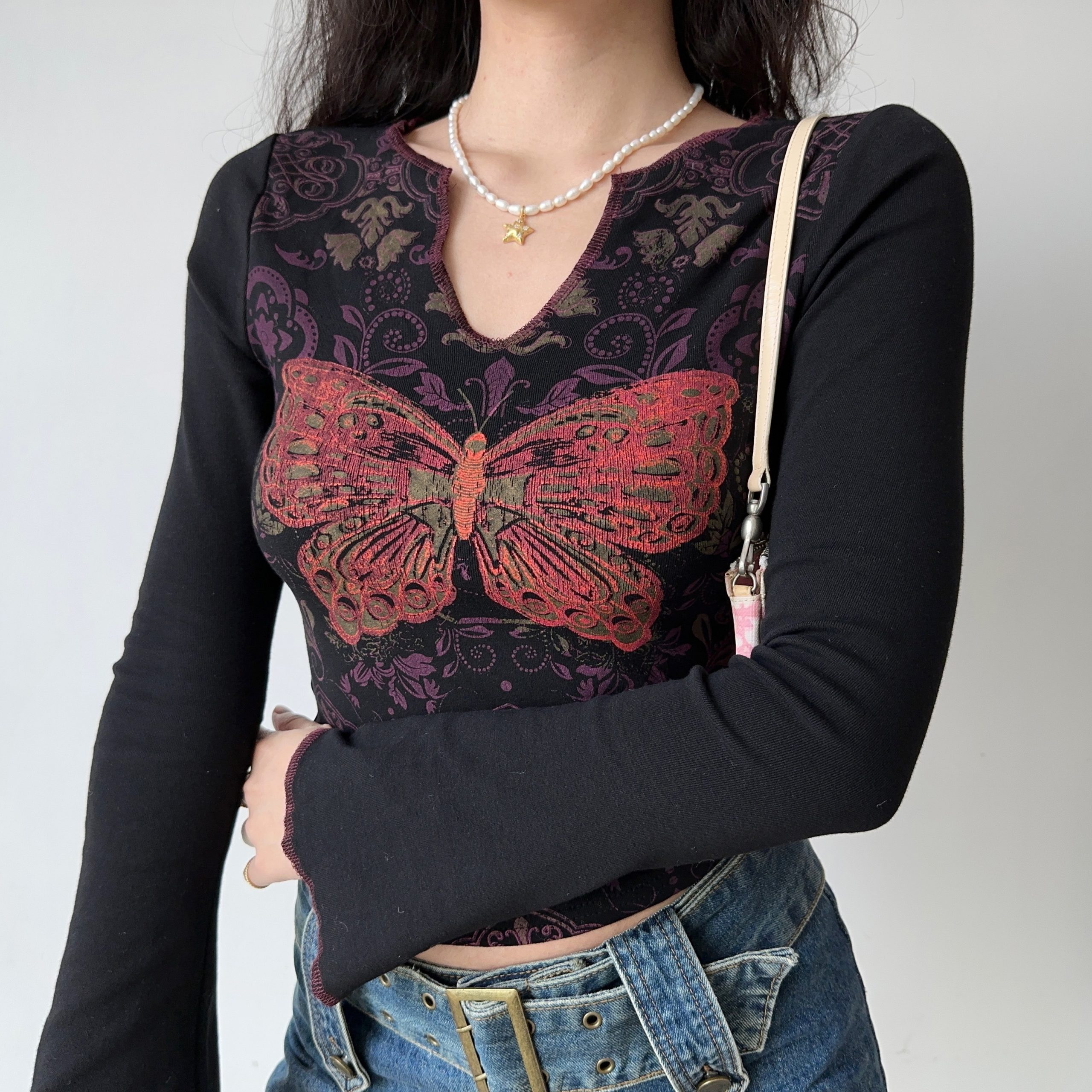 Elevate your wardrobe with our Slim Fit V-Neck Long Sleeve T-Shirt featuring an exquisite butterfly print, perfect for those who appreciate retro European and American styles. This chic women’s top combines a flattering slim fit with soft, breathable fabric, ensuring you stay comfortable and stylish all day long. Ideal for casual outings or layered under your favorite jacket, this versatile piece is a must-have addition to your collection. Don’t miss out add to your cart today!