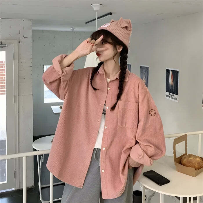 Smiley Embroidered Corduroy Shirt – Funny Thanksgiving Shirts