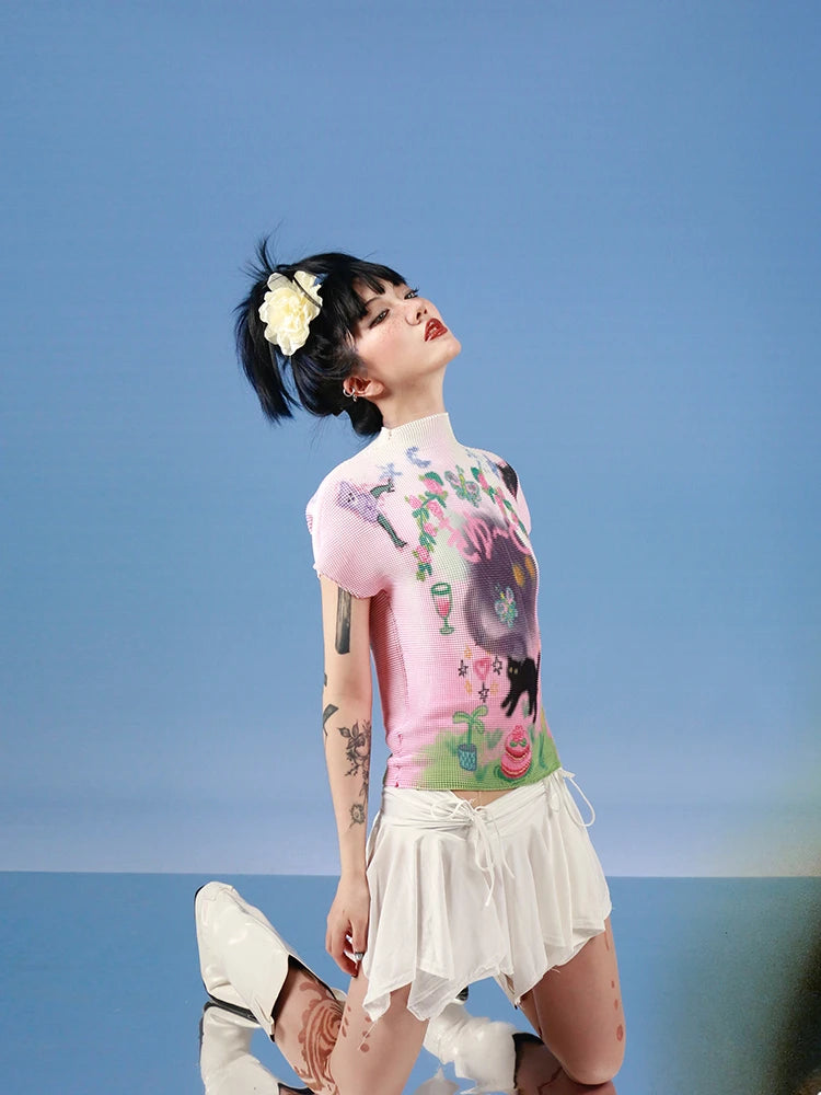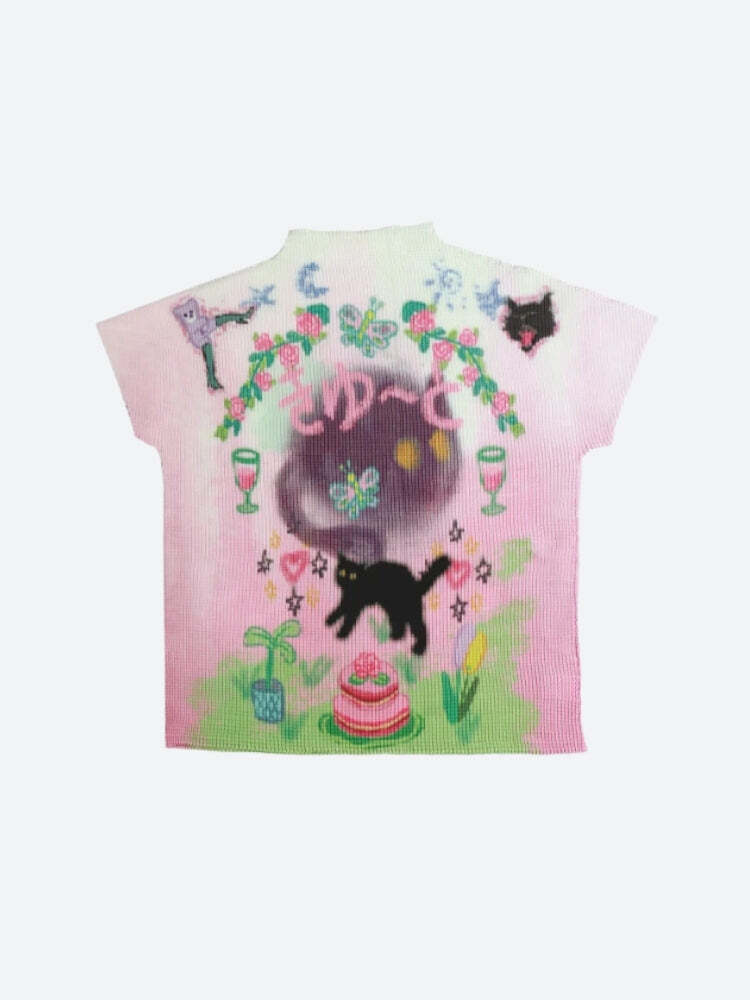 This soft girl-inspired top features an adorable black cat graphic with dreamy pastel details. The ribbed texture and high neckline give a vintage feel, while the fitted silhouette makes it easy to pair with skirts or cargo pants for a Y2K-meets-kawaii aesthetic.