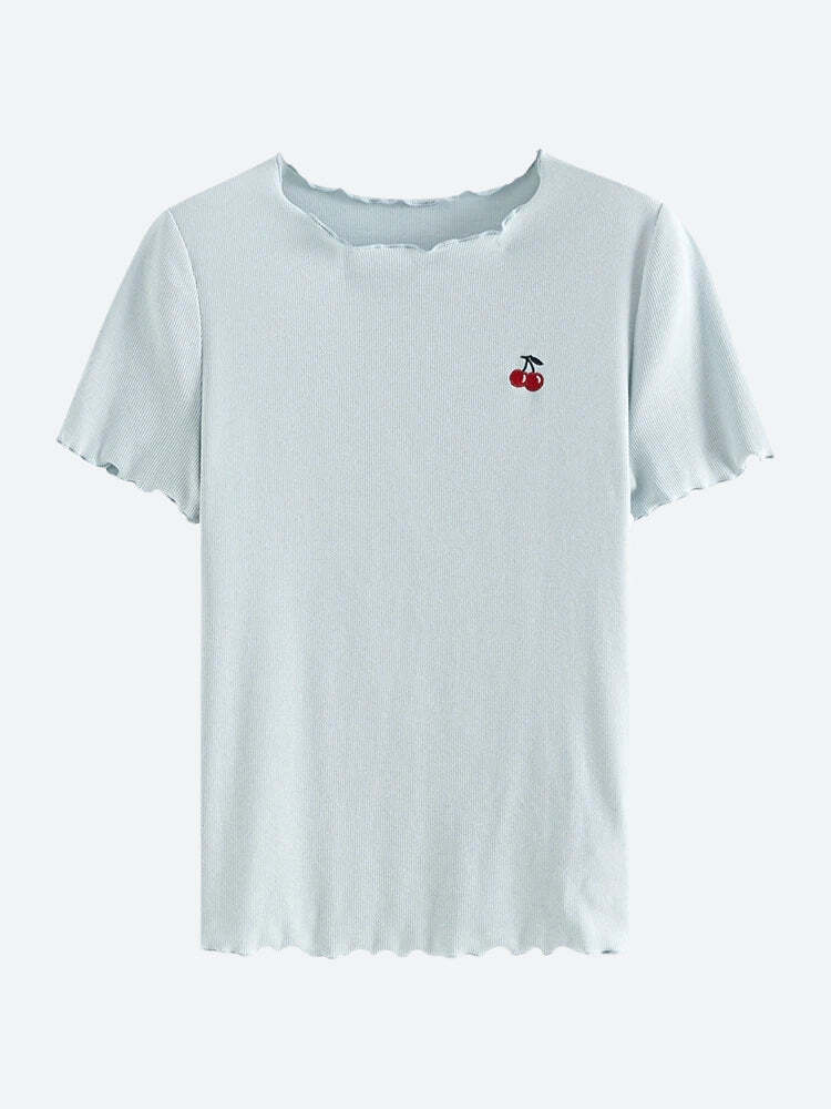 This Soft Girl Cherry Lettuce Edge Tee brings a sweet and subtle charm to your casual wardrobe. Crafted with soft, breathable fabric, it features a delicate cherry embroidery on the chest and lettuce edges for a playful finish. Perfect for pairing with jeans or a skirt, this tee offers a relaxed fit that’s both cute and comfortable, ideal for everyday wear.