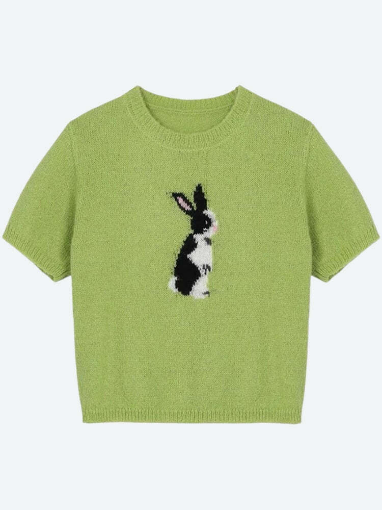 This delightful knitted top in a vibrant green hue features an adorable rabbit motif, bringing a playful touch to your wardrobe. The soft material ensures comfort, while the short sleeves make it perfect for layering or wearing on its own. Ideal for creating a cute and casual look, this top pairs beautifully with jeans or skirts, making it a versatile addition to your collection.