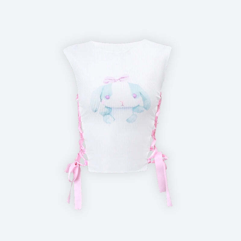 Major kawaii alert. This soft girl top is giving all the dreamy vibes with its 3D plush bunny patch and lace-up ribbon sides. The cropped fit and baby pink satin ties bring flirty Y2K energy, while the ribbed fabric keeps it comfy for everyday slay.