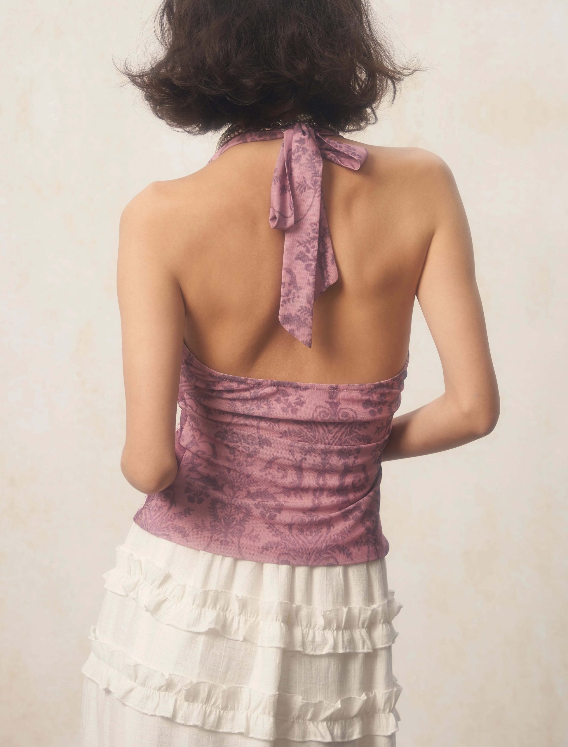 This rose halter top embodies romantic charm with its soft pink hues and intricate floral print. The lightweight fabric and stylish halter rings make it a versatile pick for summer or casual outings.
