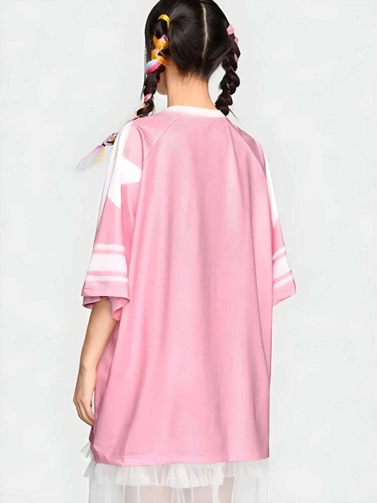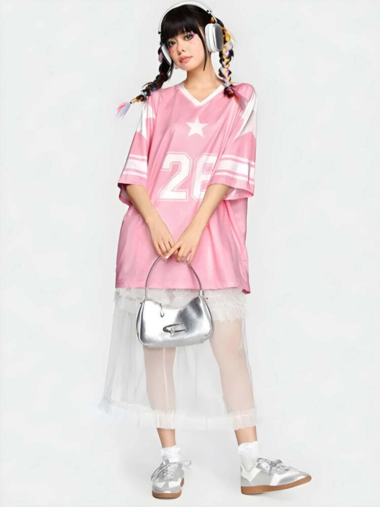 Channel sporty vibes with this oversized jersey top, featuring a bold ’26’ and star design. The soft pink hue and relaxed fit make it perfect for casual days or layering over playful outfits. Embrace a laid-back yet stylish look with this trendy piece.