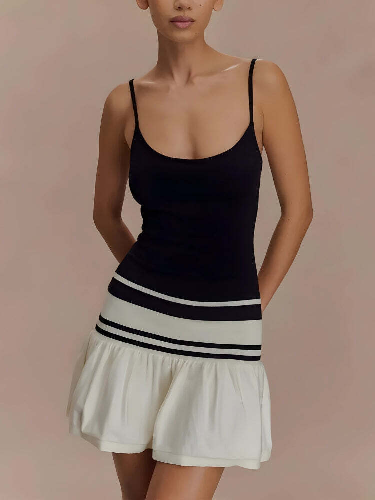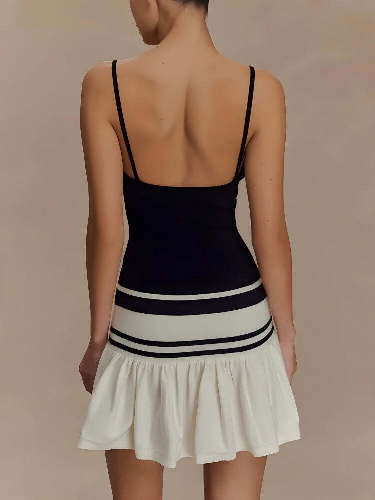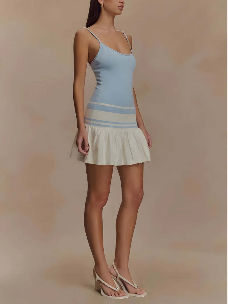 Serve sporty elegance with this two-tone mini dress. The fitted pastel blue bodice and striped waist contour the shape, while the soft ruffle hem adds playful balance. Whether it’s a tennis-core day or a summer date fit, this piece scores style points with ease.