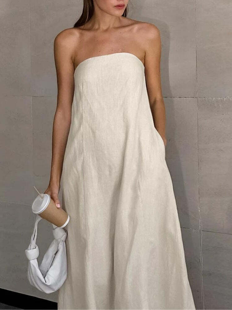 Achieve minimalist elegance with this strapless dress. The clean design and natural linen fabric offer a chic, effortless look perfect for warm days. Pair with sandals for casual outings or accessorize for a sophisticated vibe.