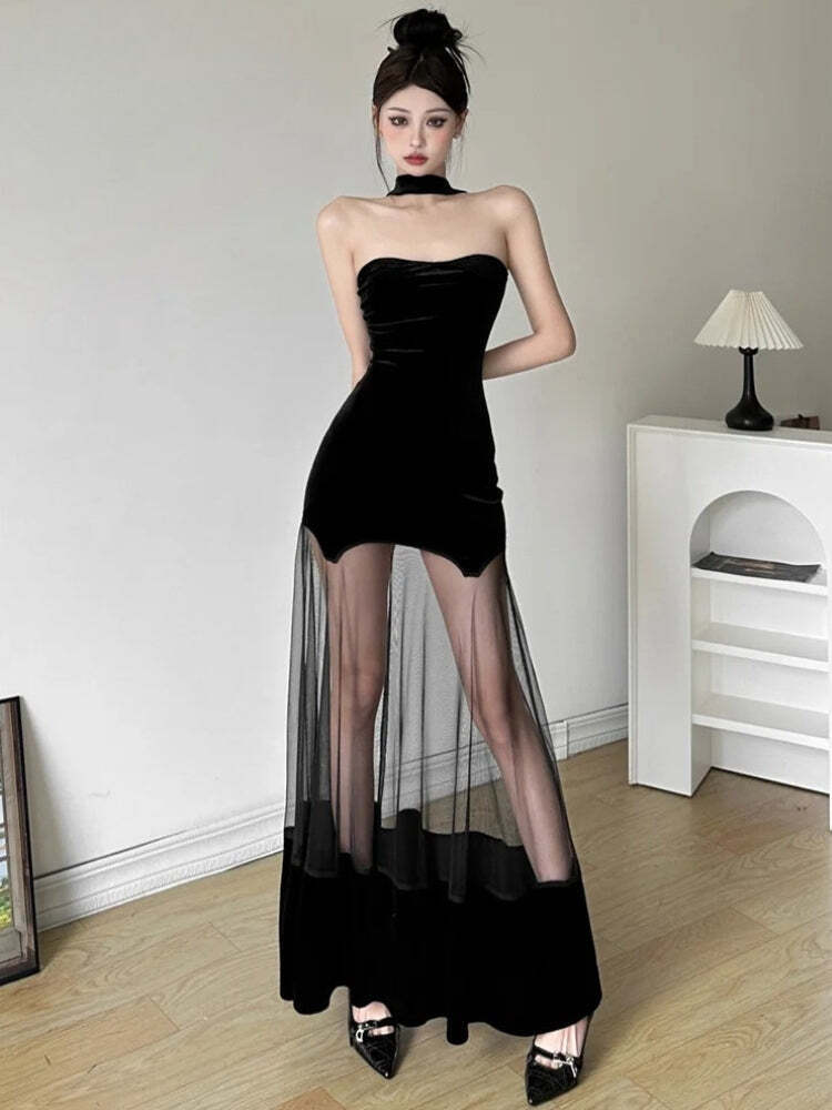 Dare to go bold in this strapless sheer maxi dress. A soft velvet mini base adds structure, while the flowing mesh overlay keeps it flirty and fresh. With its figure-hugging fit and dramatic see-through skirt, it’s made for party nights, club looks, or statement street style.