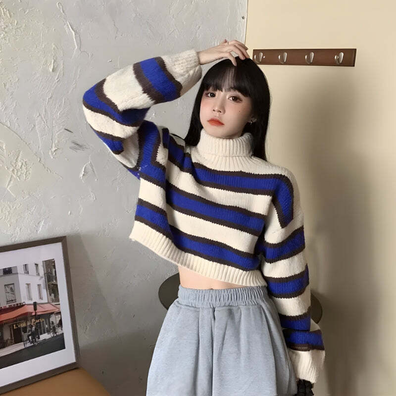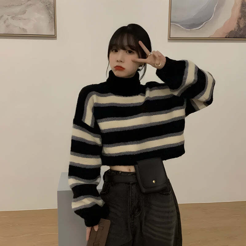 Stay cozy and stylish with this striped turtleneck cropped sweater. Featuring bold stripes and a flattering cropped fit, it’s a must-have for casual outfits. Pair it with high-waisted bottoms for a laid-back, trendy look.