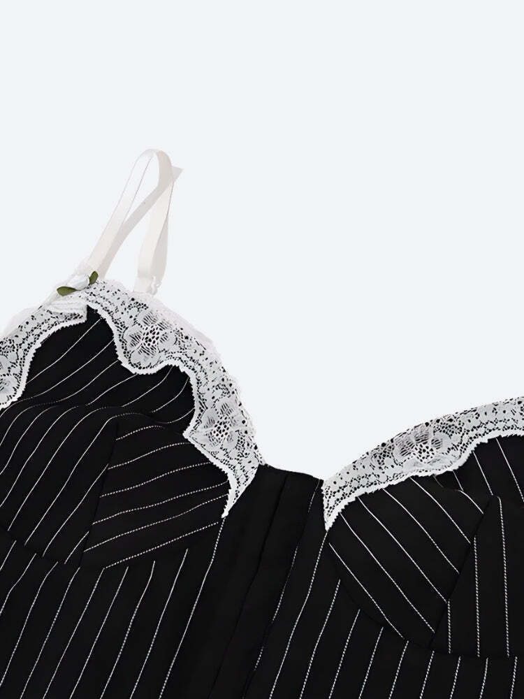 A power move in pinstripes. This striped lace trim corset top mixes business-core with soft-girl glam. The structured silhouette and adjustable straps make it ultra-flattering, while the delicate white lace adds a flirty finish.