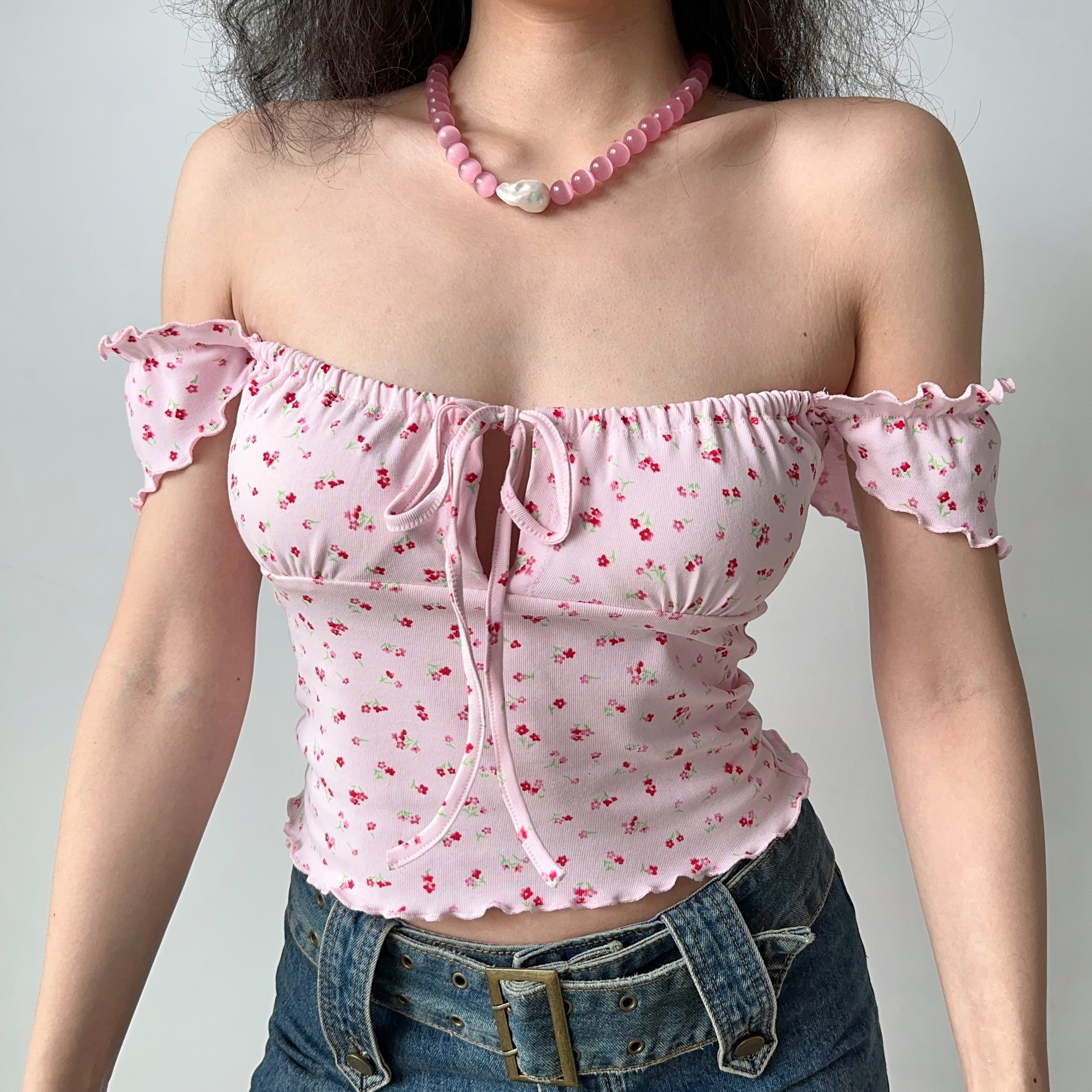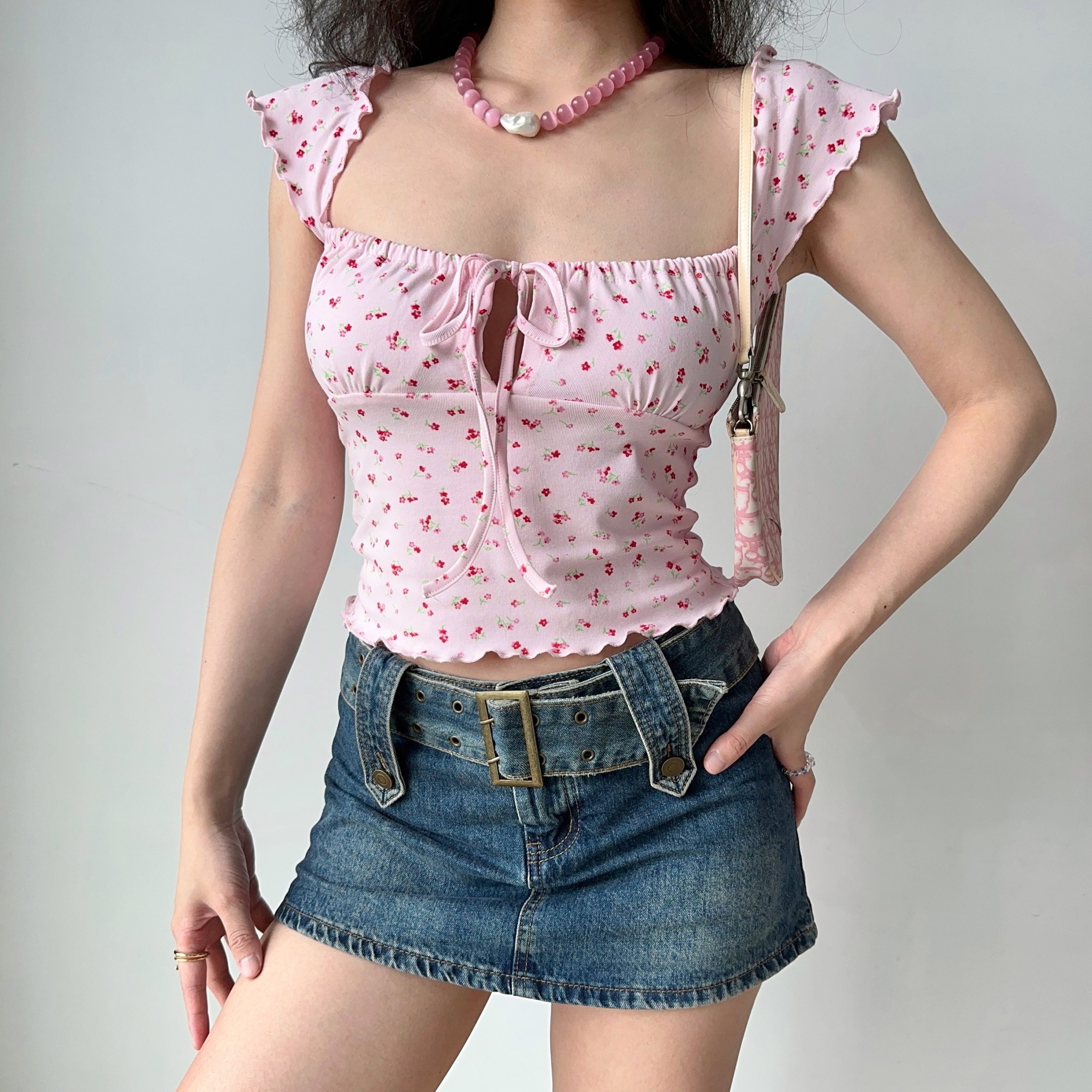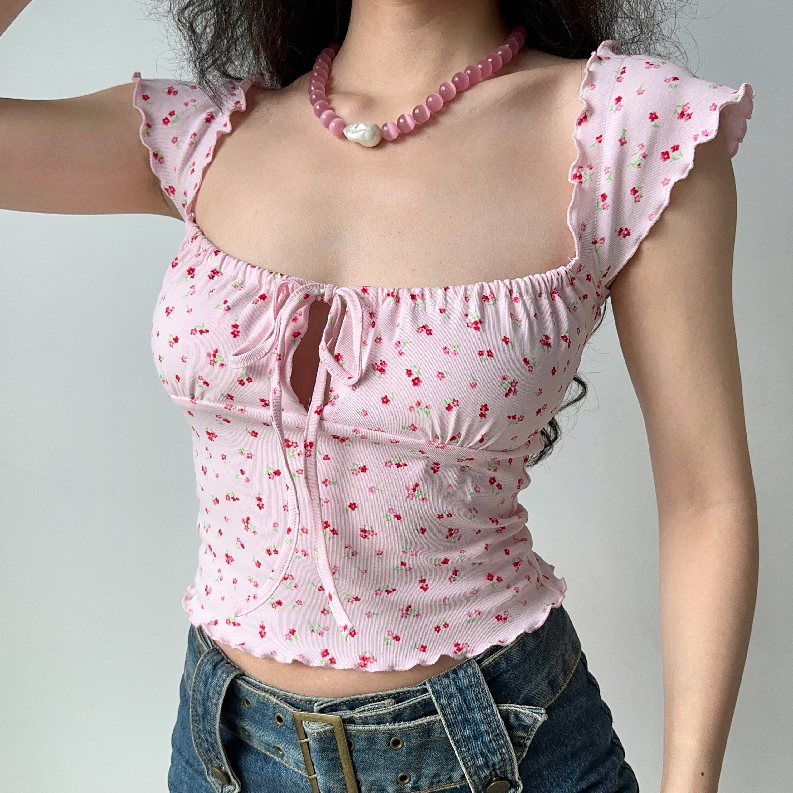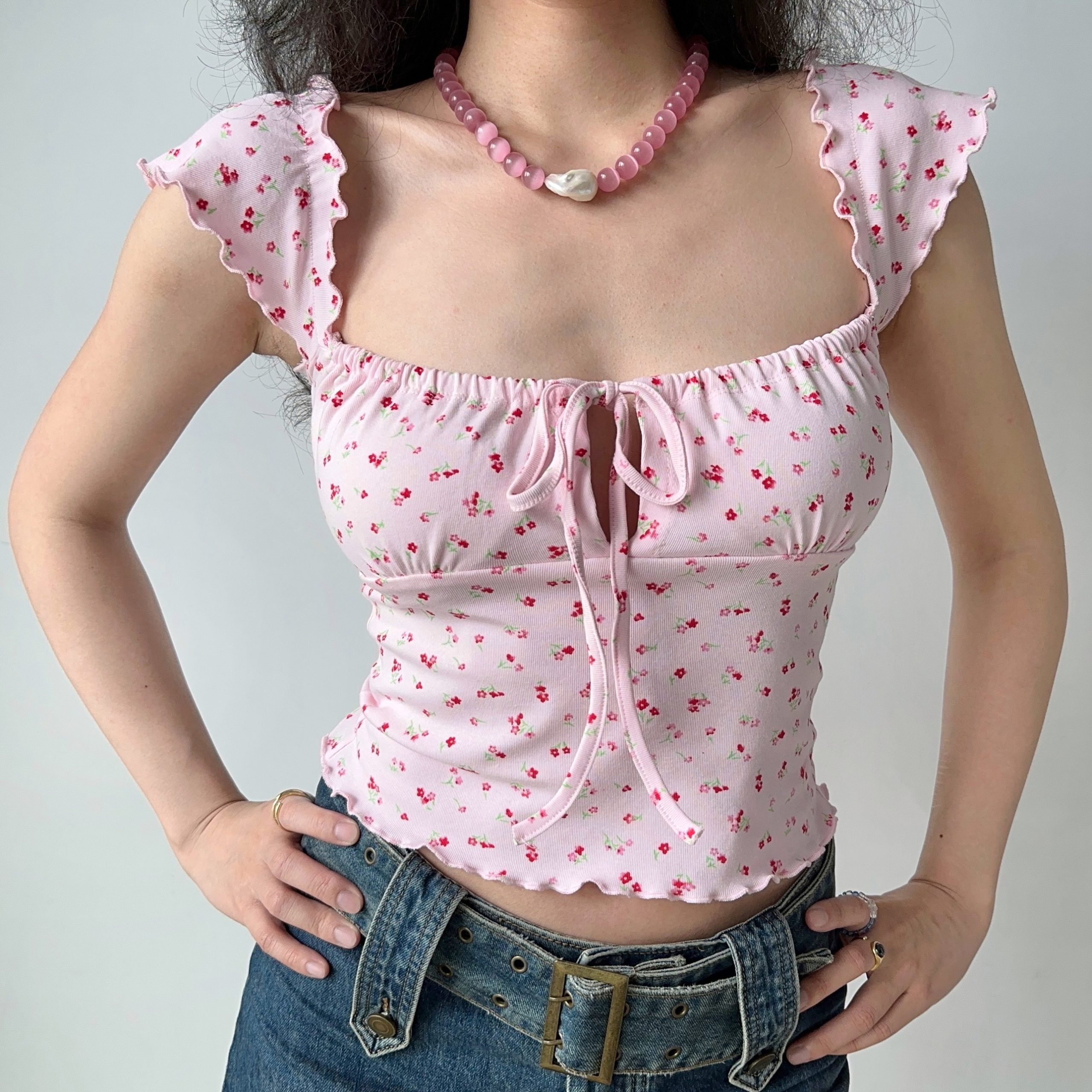 Sweet Pink Floral Square Neck Short Sleeve Women Slim Fit Y2k Summer to – Y2k Outfits