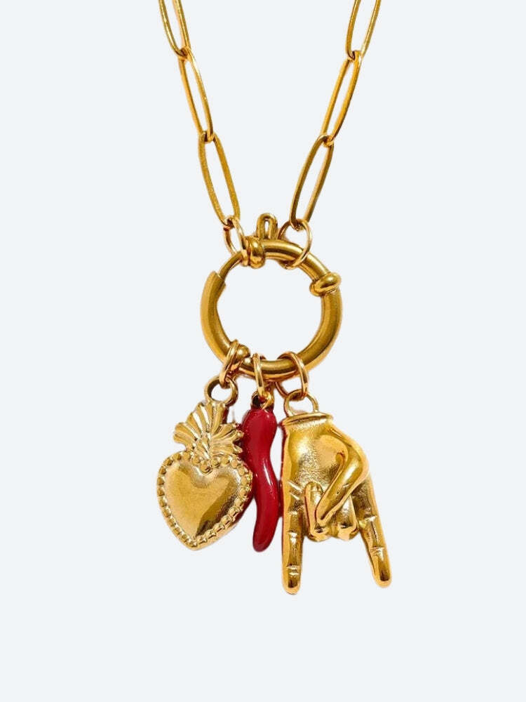 Gold chain adorned with three unique charms, offering a versatile accessory that adds an element of interest to any look. The distinct combination of charms provides a fashionable touch, perfect for enhancing your everyday style. A great gift for those who love stylish and meaningful jewelry.