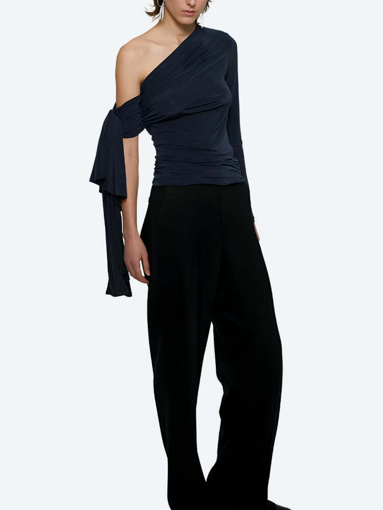 This tie-shoulder top is a statement piece with a bold asymmetrical design. The ruched fabric contours the body, while the extended tie detail adds a touch of drama. Perfect for an evening out or a chic streetwear look when paired with wide-leg trousers or a sleek skirt.