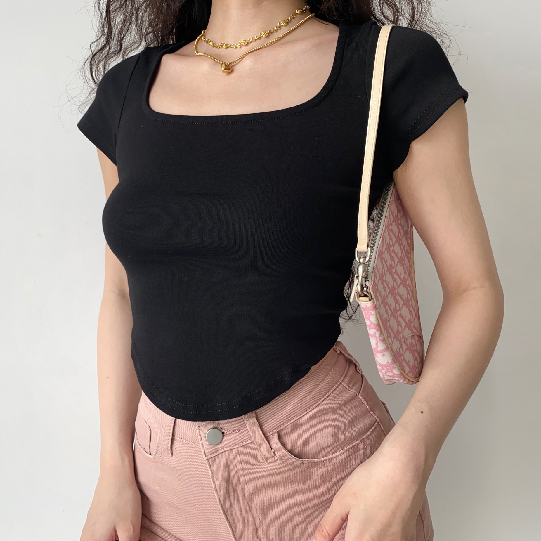 Basic Curved Hem Square Neck Fitted Short Sleeve Women Summer Casual Top, Y2K High-quality product featuring casual summer outfits, y2k outfits, fall fits and more. Modern design that fits the latest trends. Premium materials ensure durability and comfort. Order now for special offers! Product designed with attention to every detail. Suitable for all occasions and personal styles.