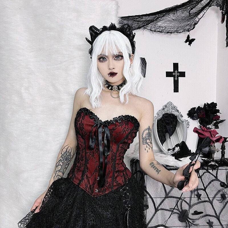 Victorian Goth Ribbon Detailed Corset Top High-quality product featuring vampire costume aesthetic, white corset halloween costume, coquette outfit and more. Modern design that fits the latest trends. Premium materials ensure durability and comfort. Order now for special offers! Product designed with attention to every detail. Suitable for all occasions and personal styles.