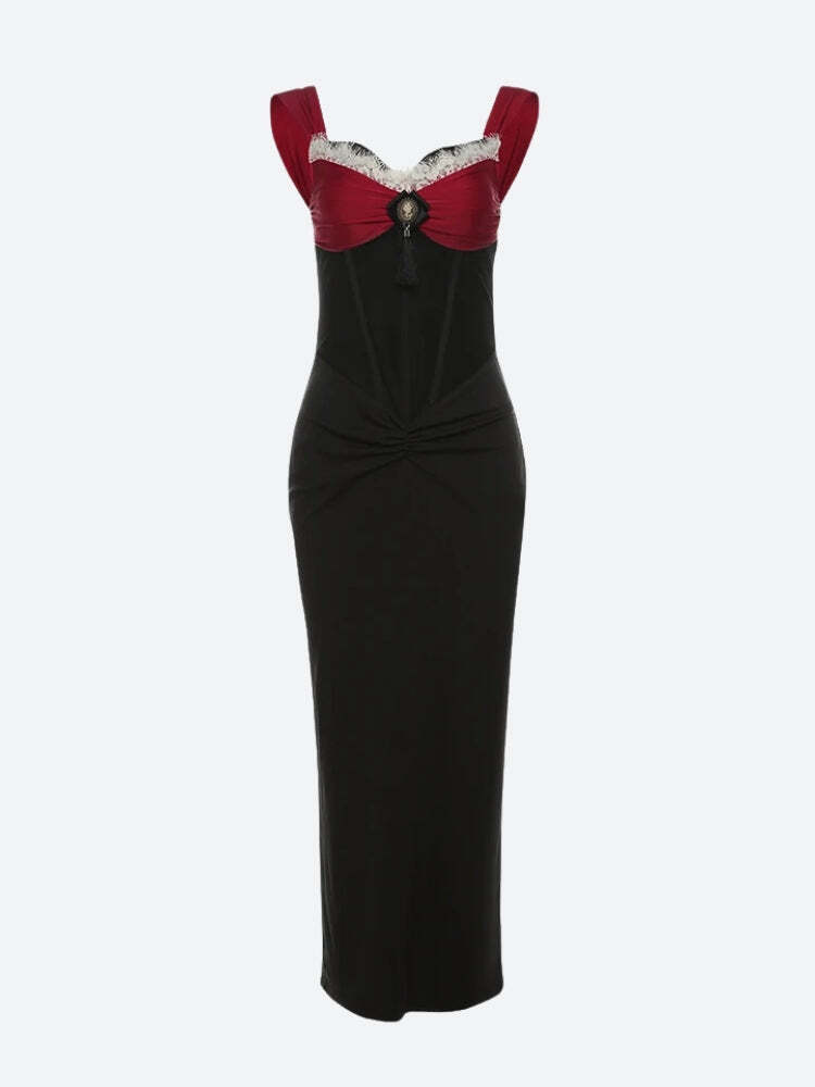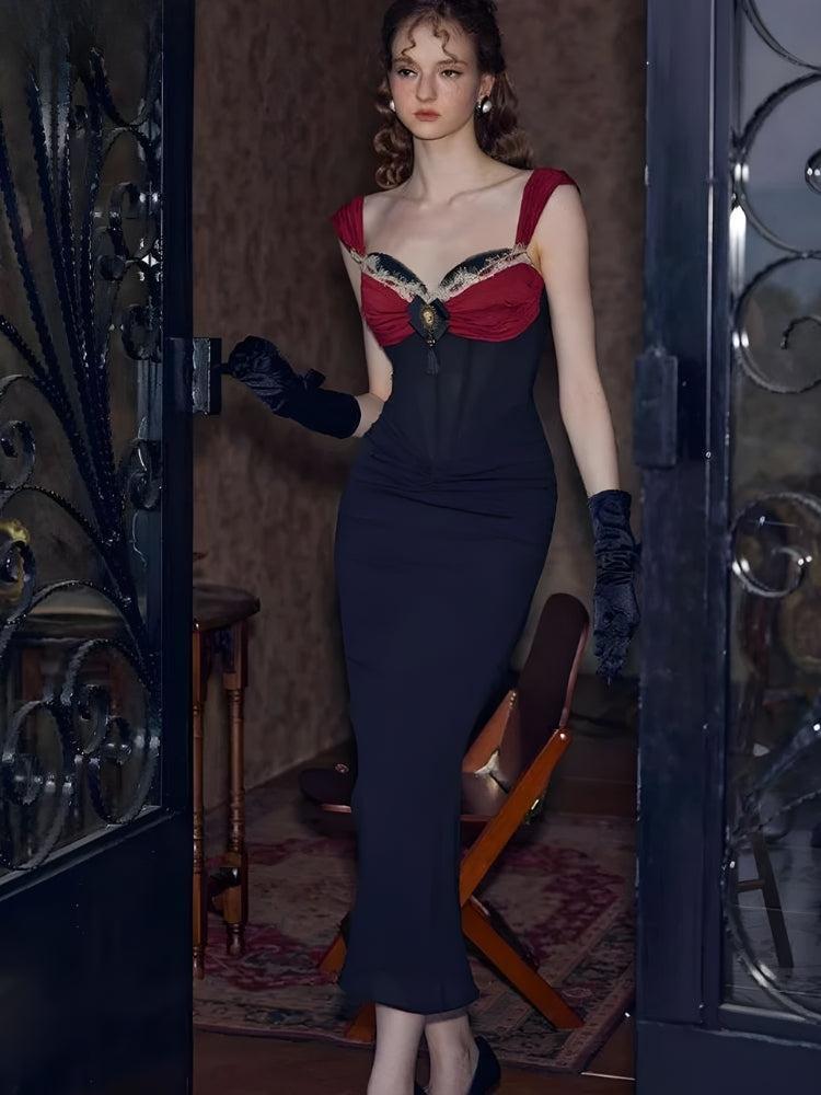 This vintage corset bodycon maxi dress brings a glamorous old-Hollywood vibe. The color-block bust and structured waist create a sultry silhouette for date nights or formal events.