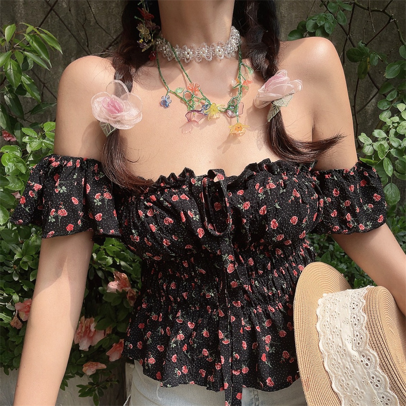 Vintage Floral Square Neck Flutter Sleeve Drawstring Blo Top in – Spring Outfit