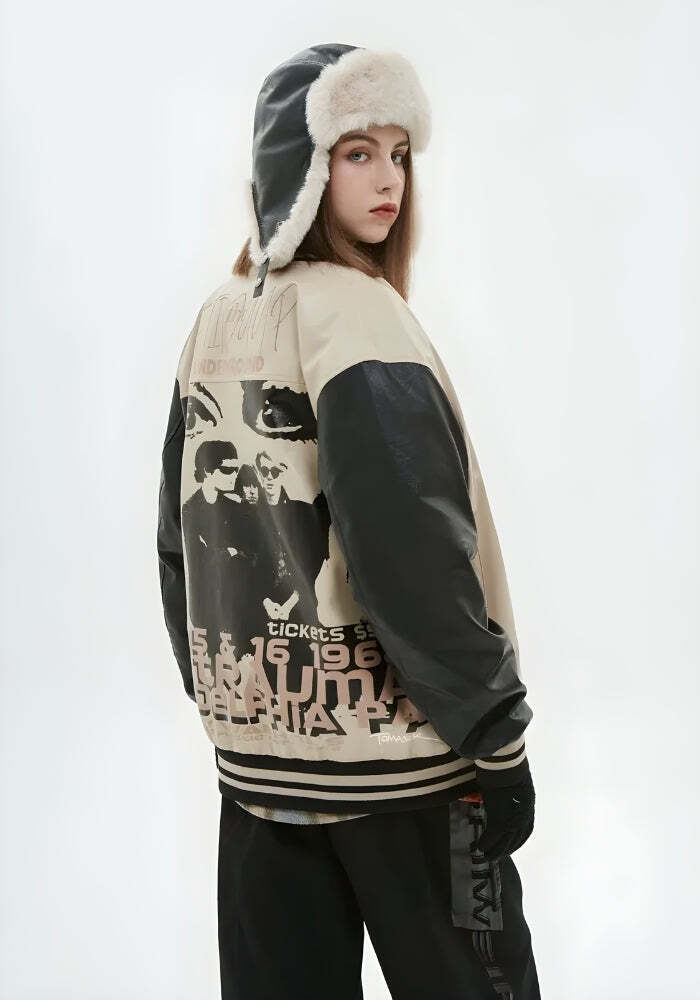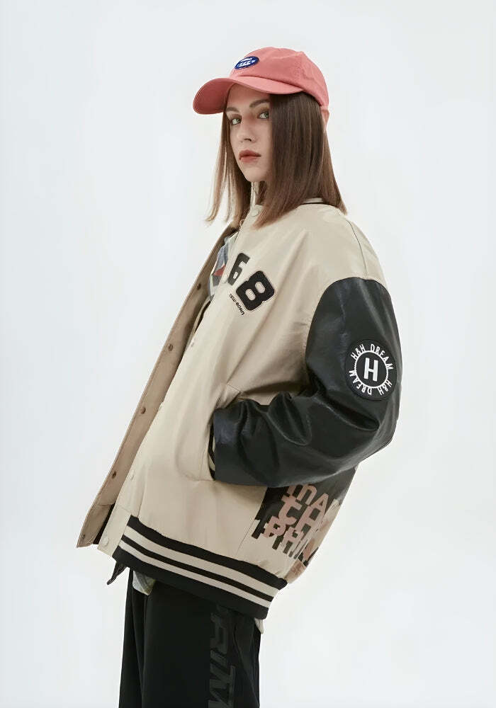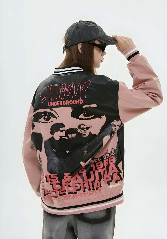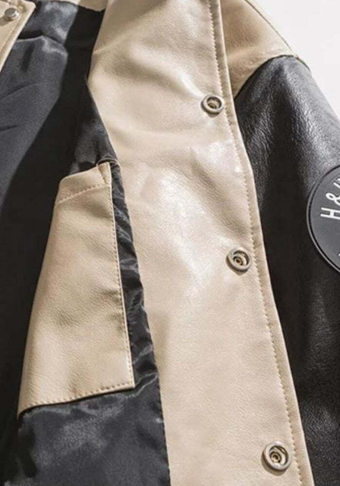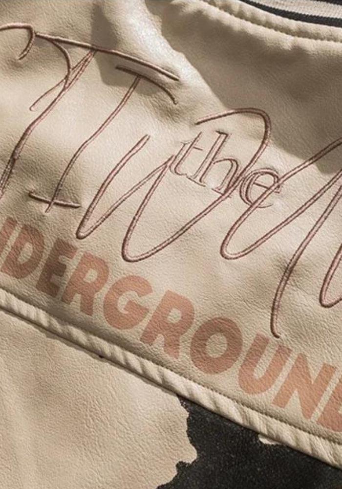 This unisex faux leather varsity jacket exudes a vintage vibe with intricate embroidery at the front and print and text detail at the back. It features invisible pockets, double front pockets, button fastening, and a silicone round label on the sleeve, making it perfect for biker, punk, or streetwear enthusiasts.