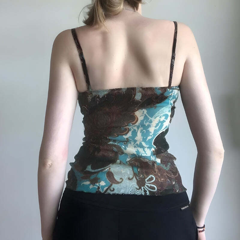 Bring on the sultry nostalgia with this vintage-inspired mesh top. Featuring a baroque floral print in moody tones of chocolate brown, teal, and crimson, it’s trimmed with delicate lace for that Y2K romantic feel. The fitted silhouette and V-neckline add just the right amount of edge—wear it solo or layered for that soft grunge vibe.