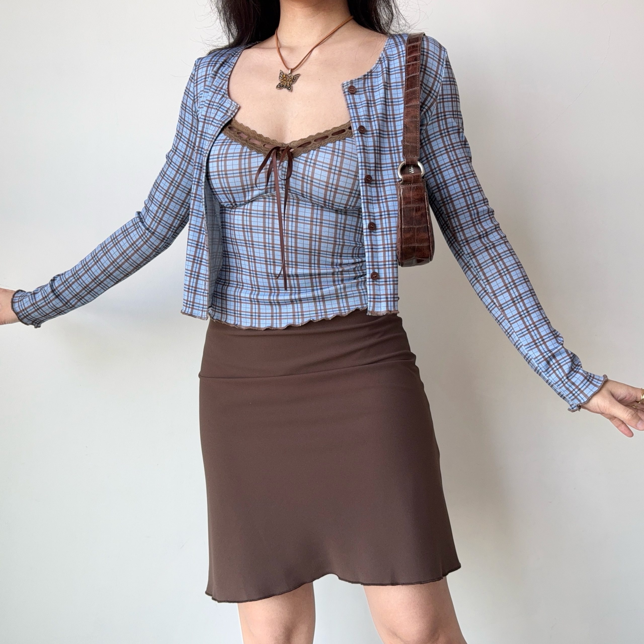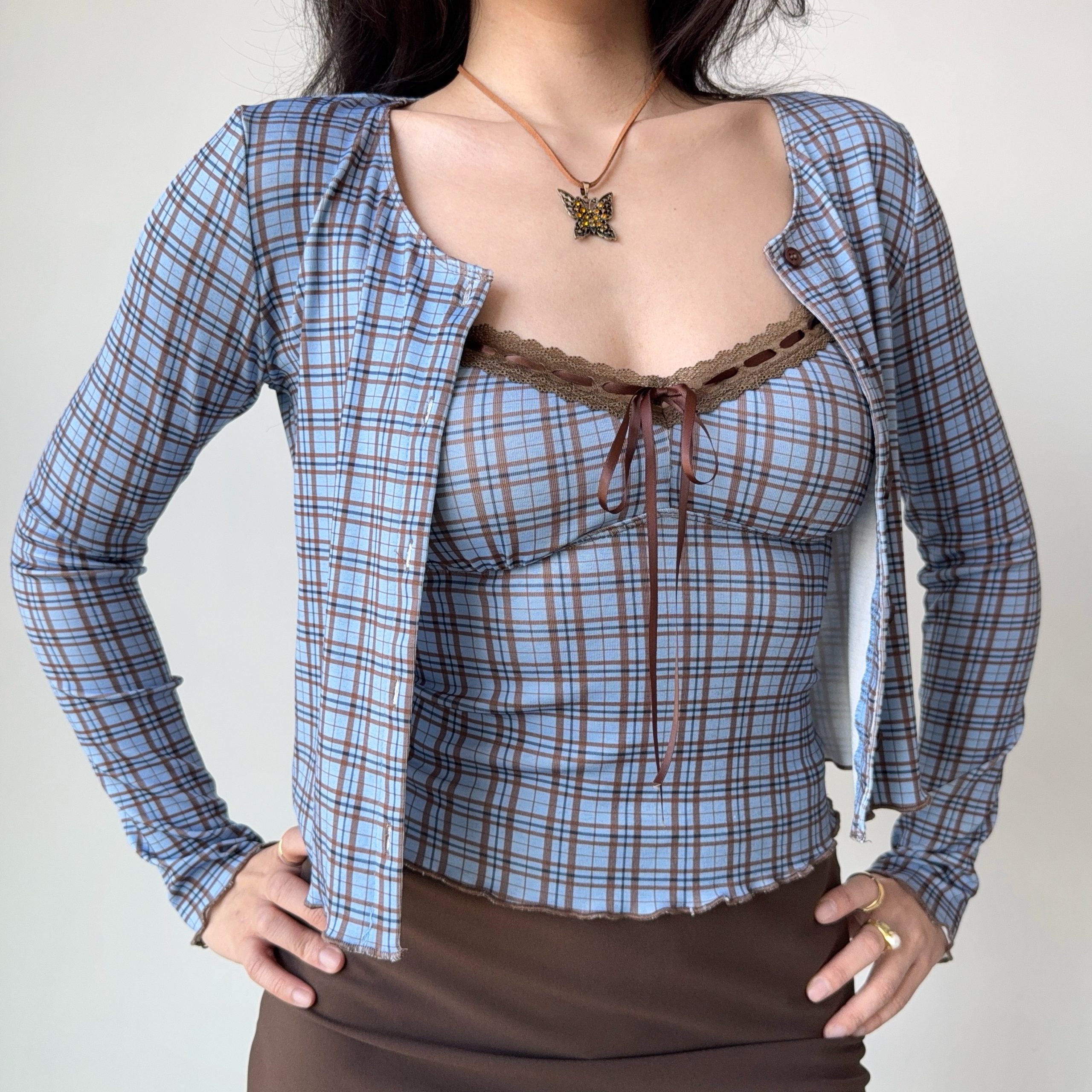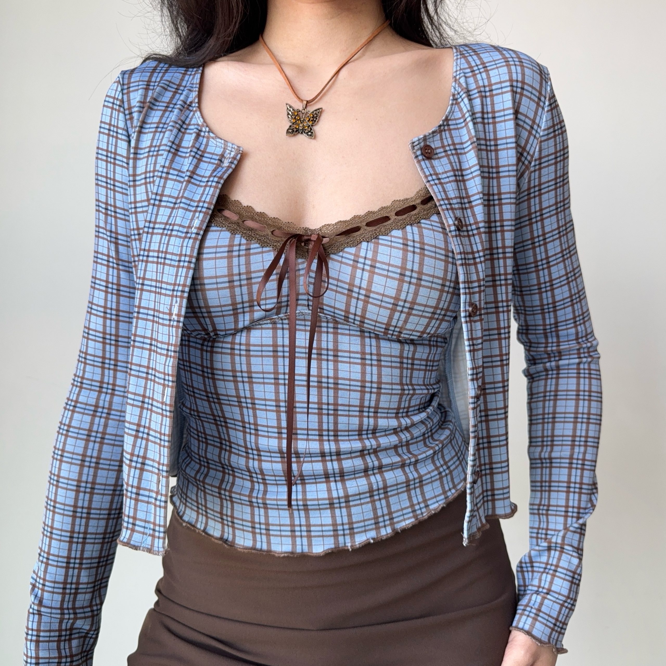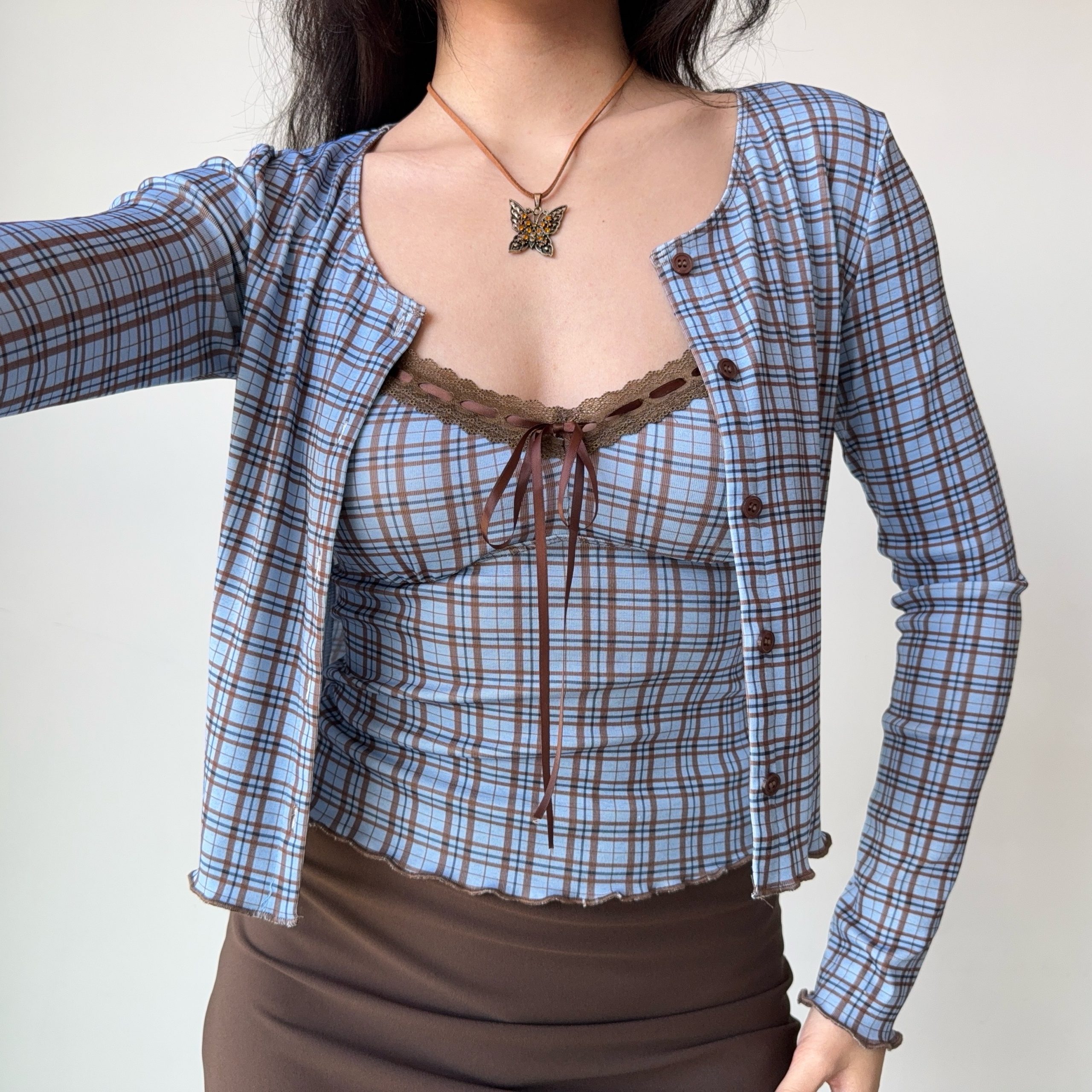 Step into the spotlight with our Vintage Plaid Camisole Cardigan Two-Piece Set, a must-have for every fashion-forward woman. This Y2K inspired ensemble features a slim fit short crop top that flatters your silhouette, while the chic cardigan adds a layer of sophistication. Perfect for layering or wearing solo, this set is versatile for any occasion. Elevate your wardrobe and embrace the retro vibe add to your cart today!