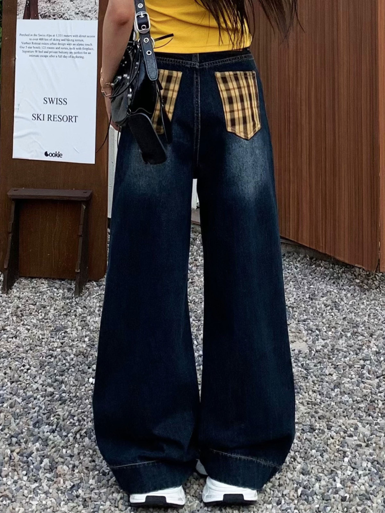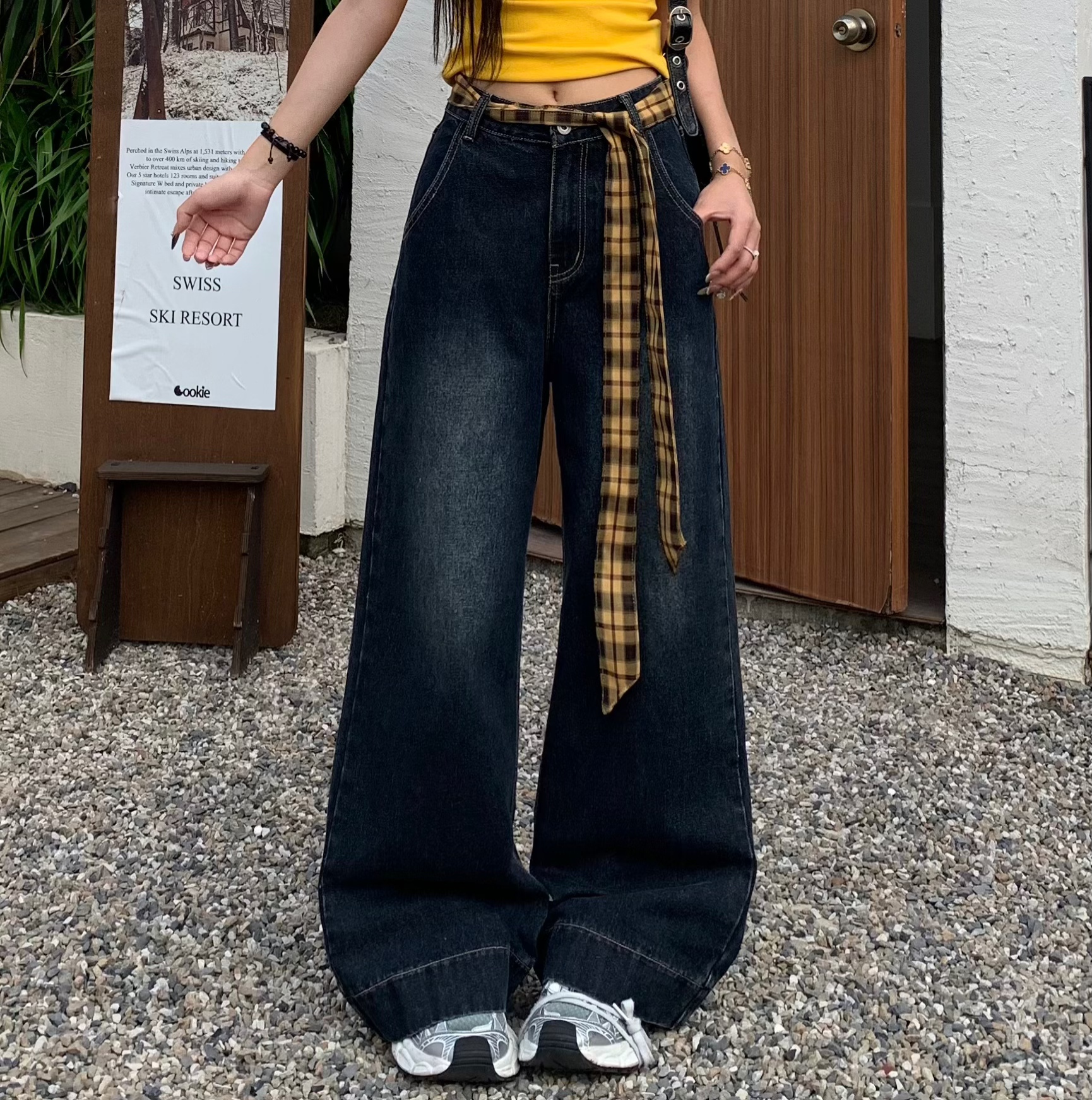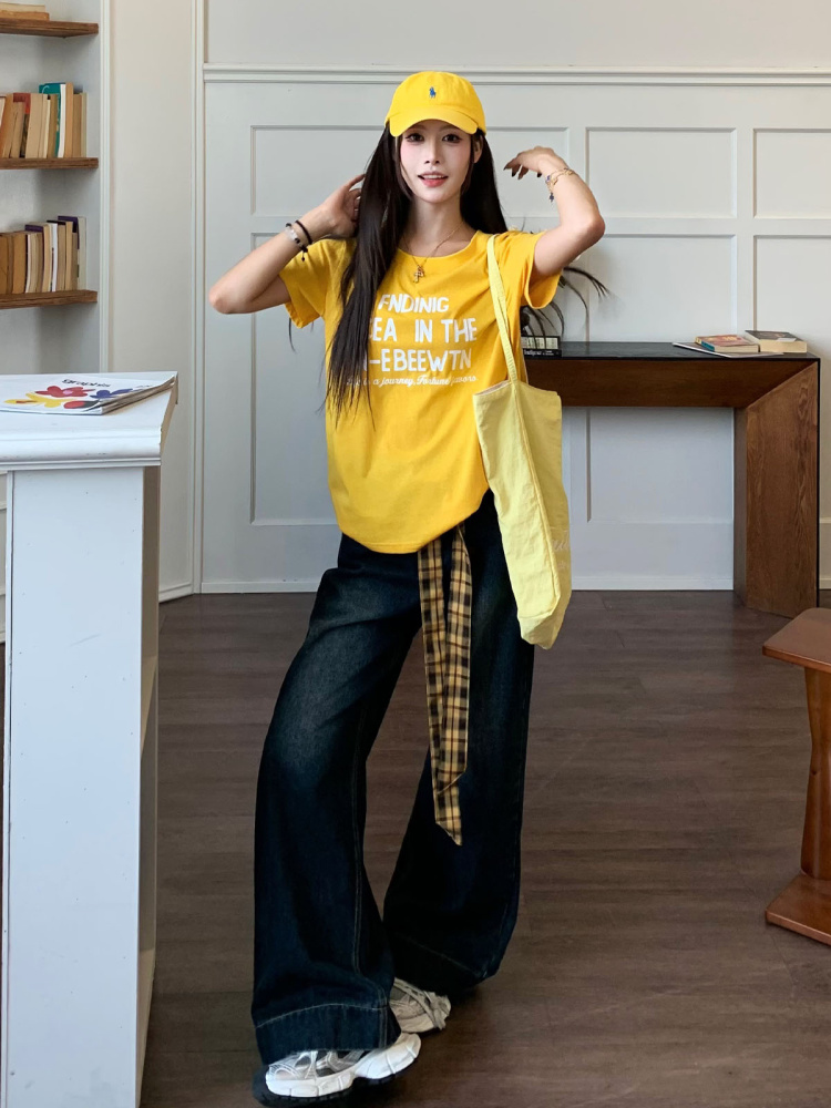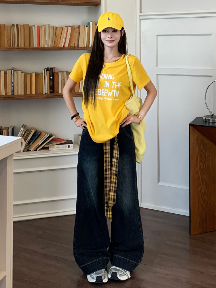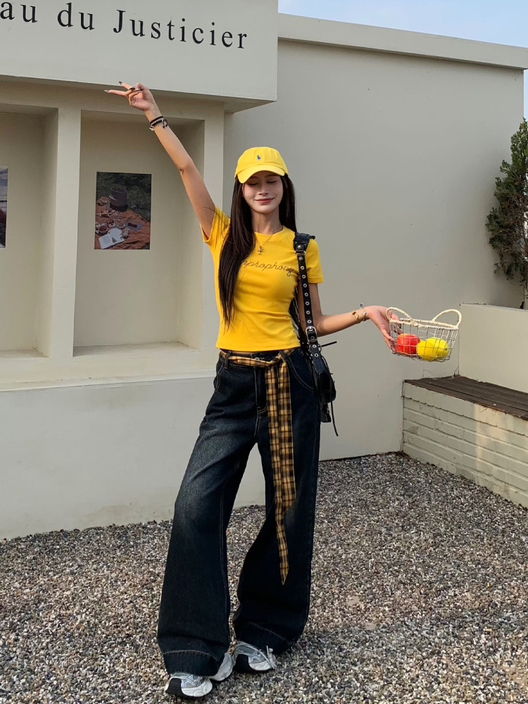 Vintage Wide Leg Floor Length Jeans Women Yellow Waistb, Blue Gray Stra – Summer Fits