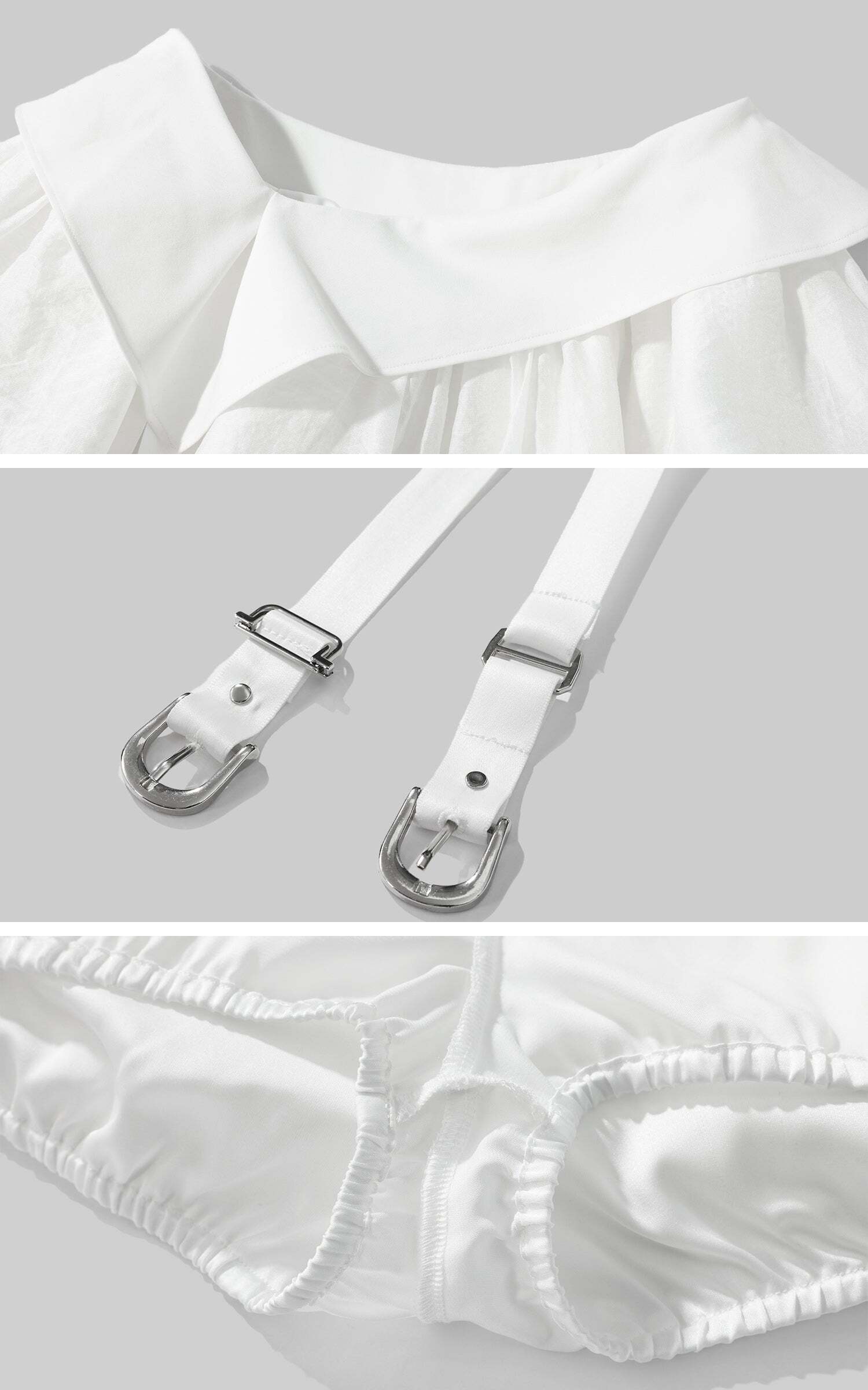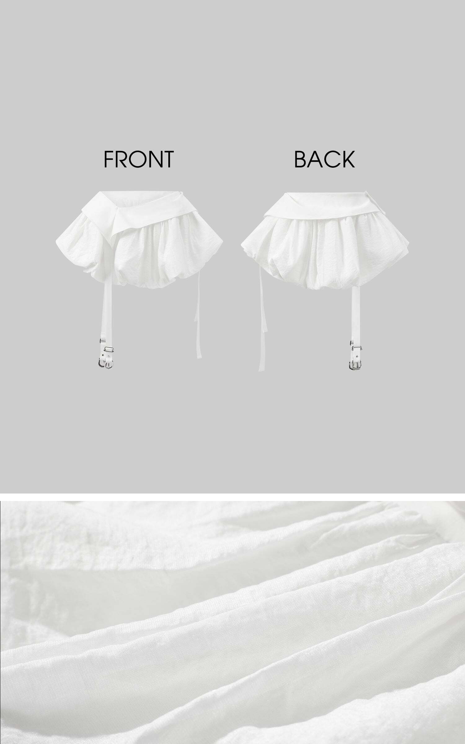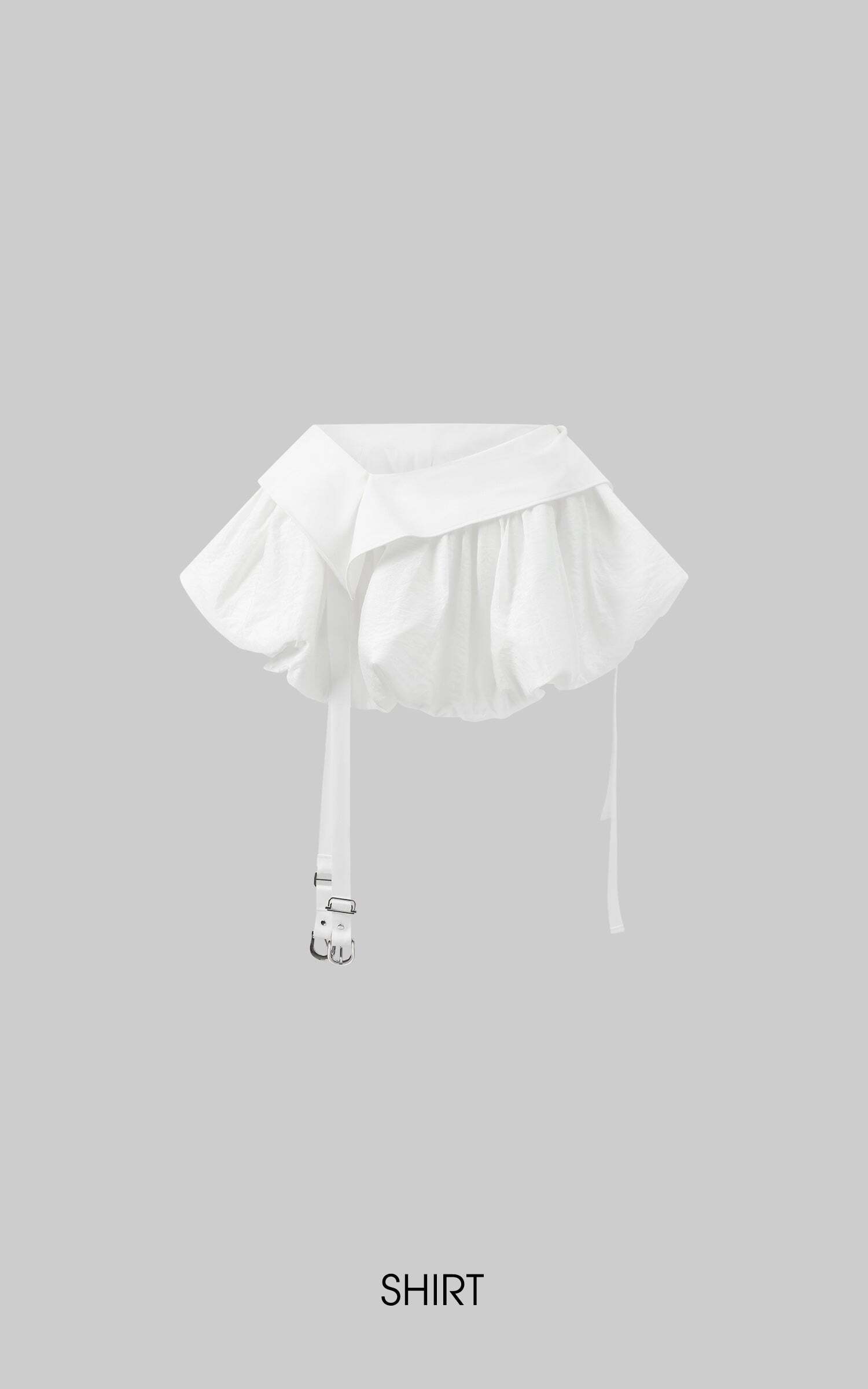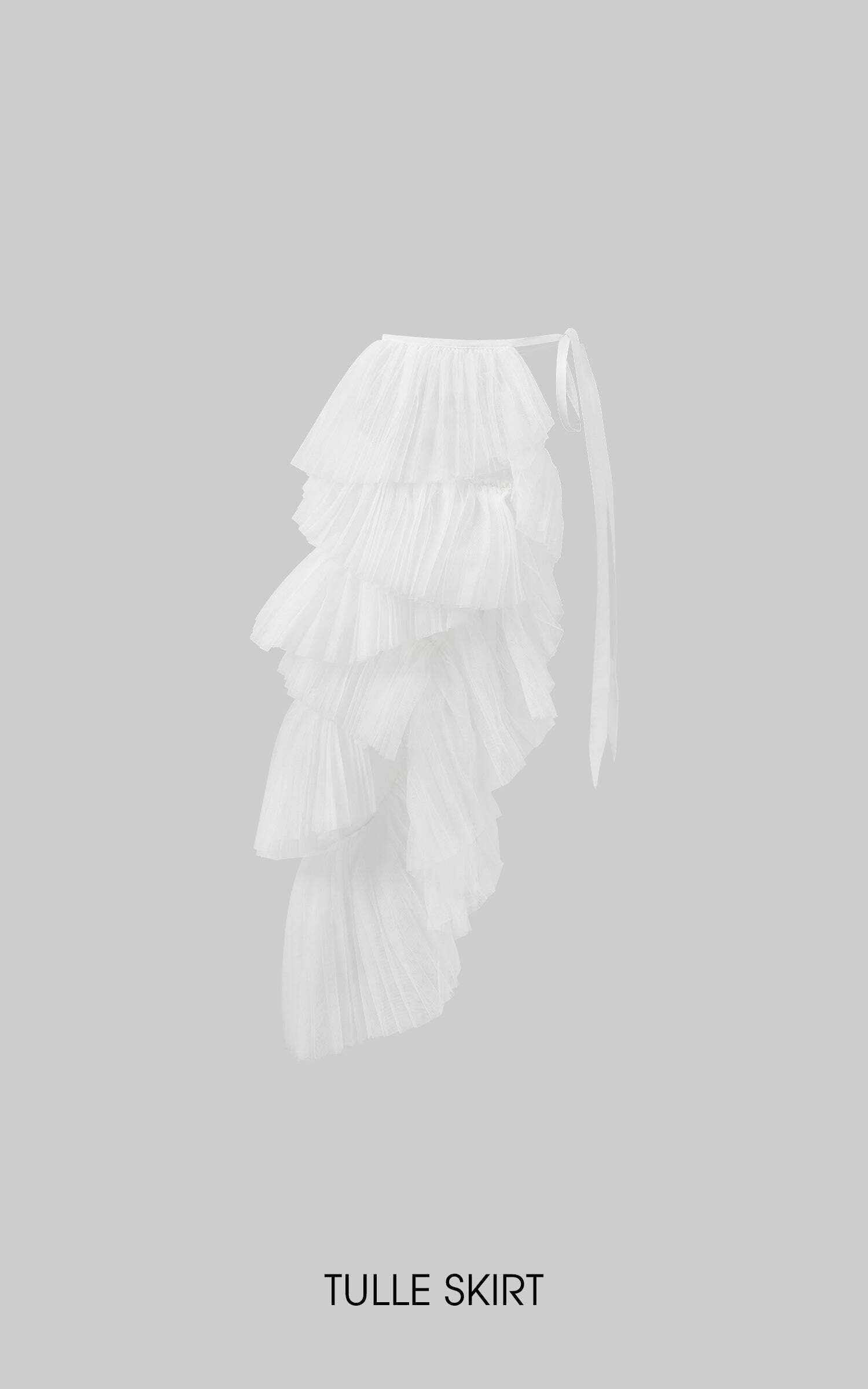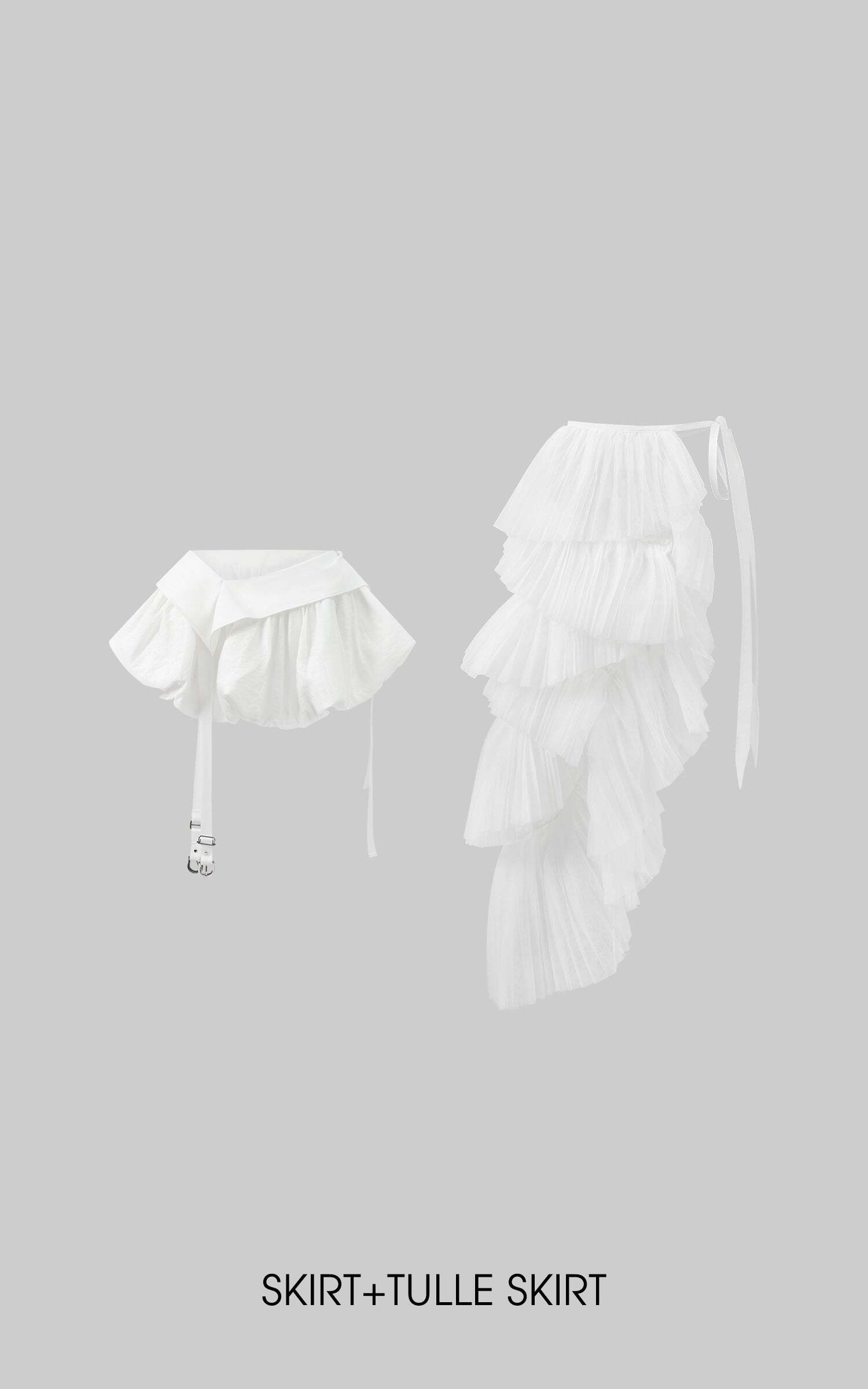 This layered skirt set features a bubble hem mini skirt topped with a sharply tailored collar and adjustable belt straps, paired with a cascading tulle train that moves with defiance. Designed to be worn together or apart, the set redefines silhouette and proportion. Raw textures, asymmetry, and movement—this is controlled disarray made wearable.