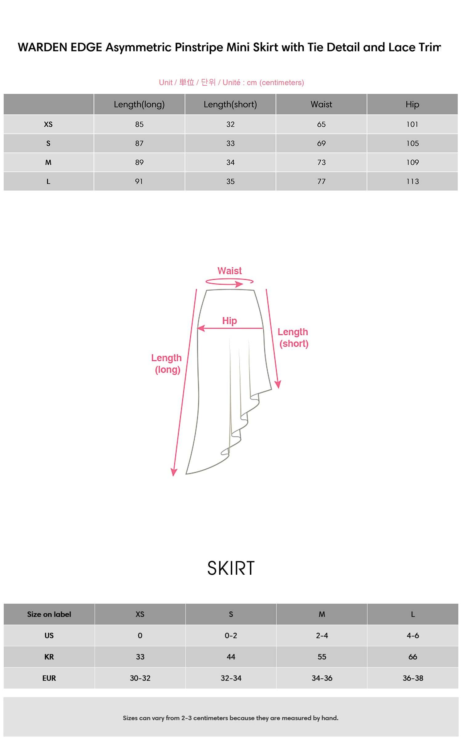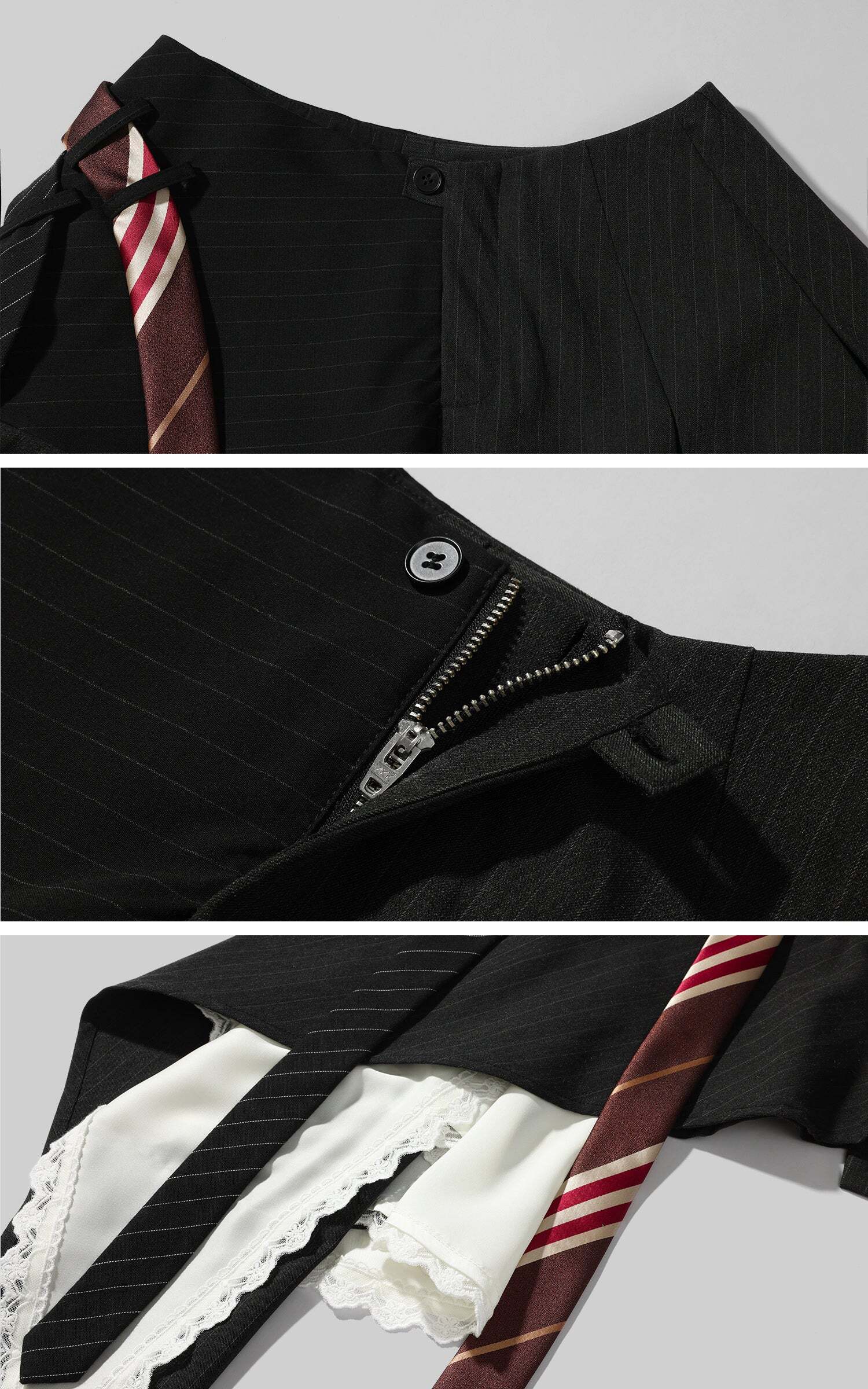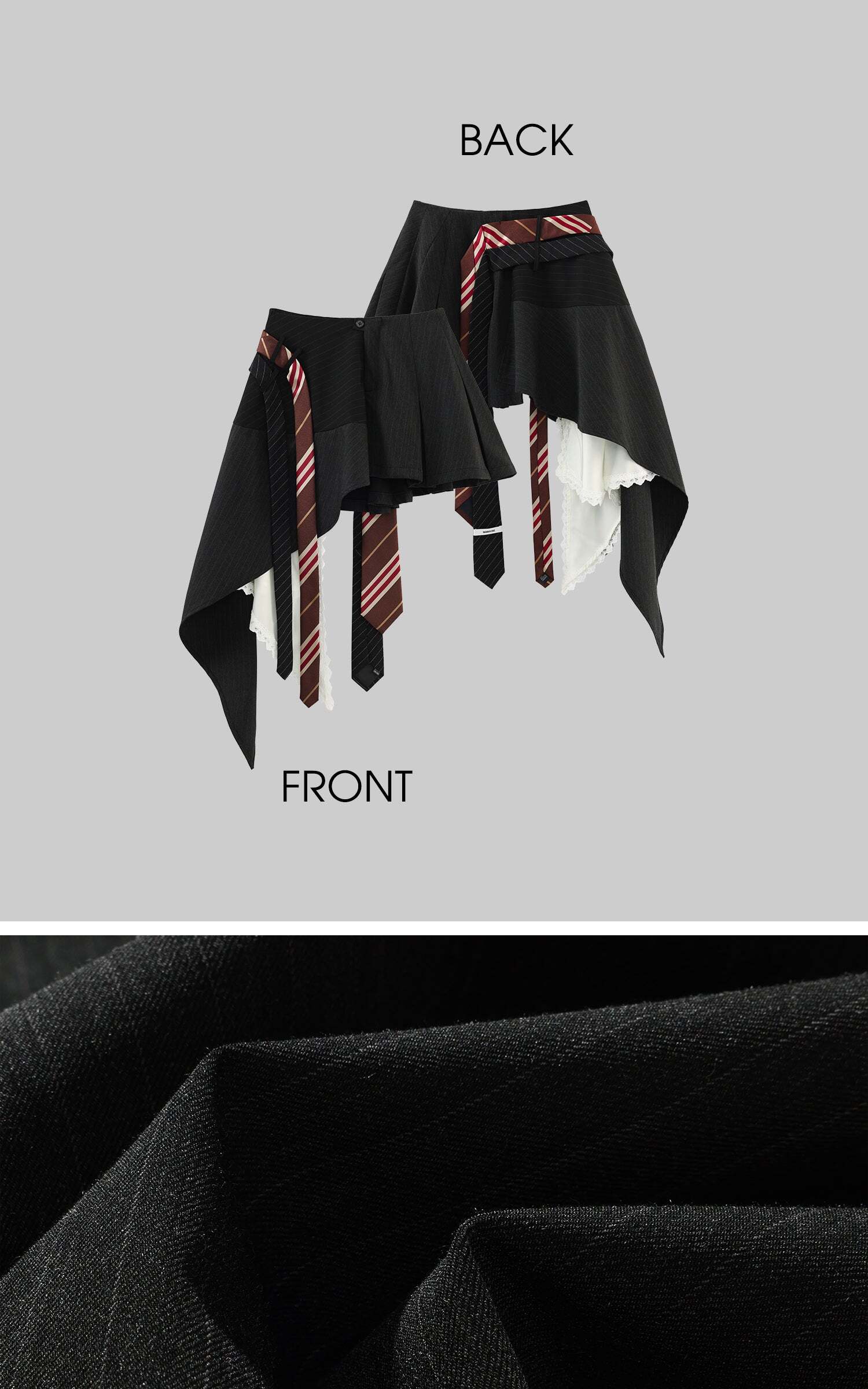 An elevated twist on tailoring—this asymmetric pinstripe mini skirt merges deconstructed suiting with street-inflected attitude. Cut in a draped silhouette, it features layered panels with raw-cut edges, striped tie accents that sway with movement, and delicate lace peeks from beneath. A side zipper and button closure secure the fit, while the flowing, uneven hemline adds directional energy. Pair it with oversized knits or graphic tees for a sharp contrast between structure and ease.
