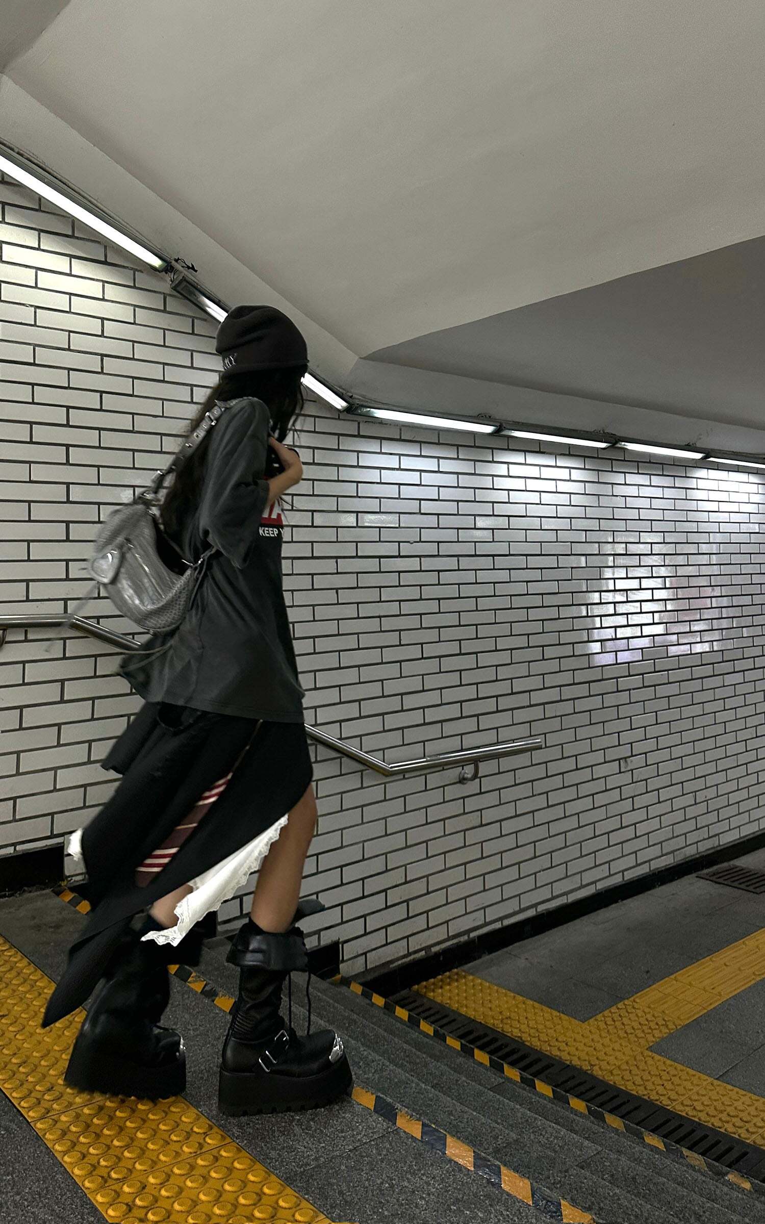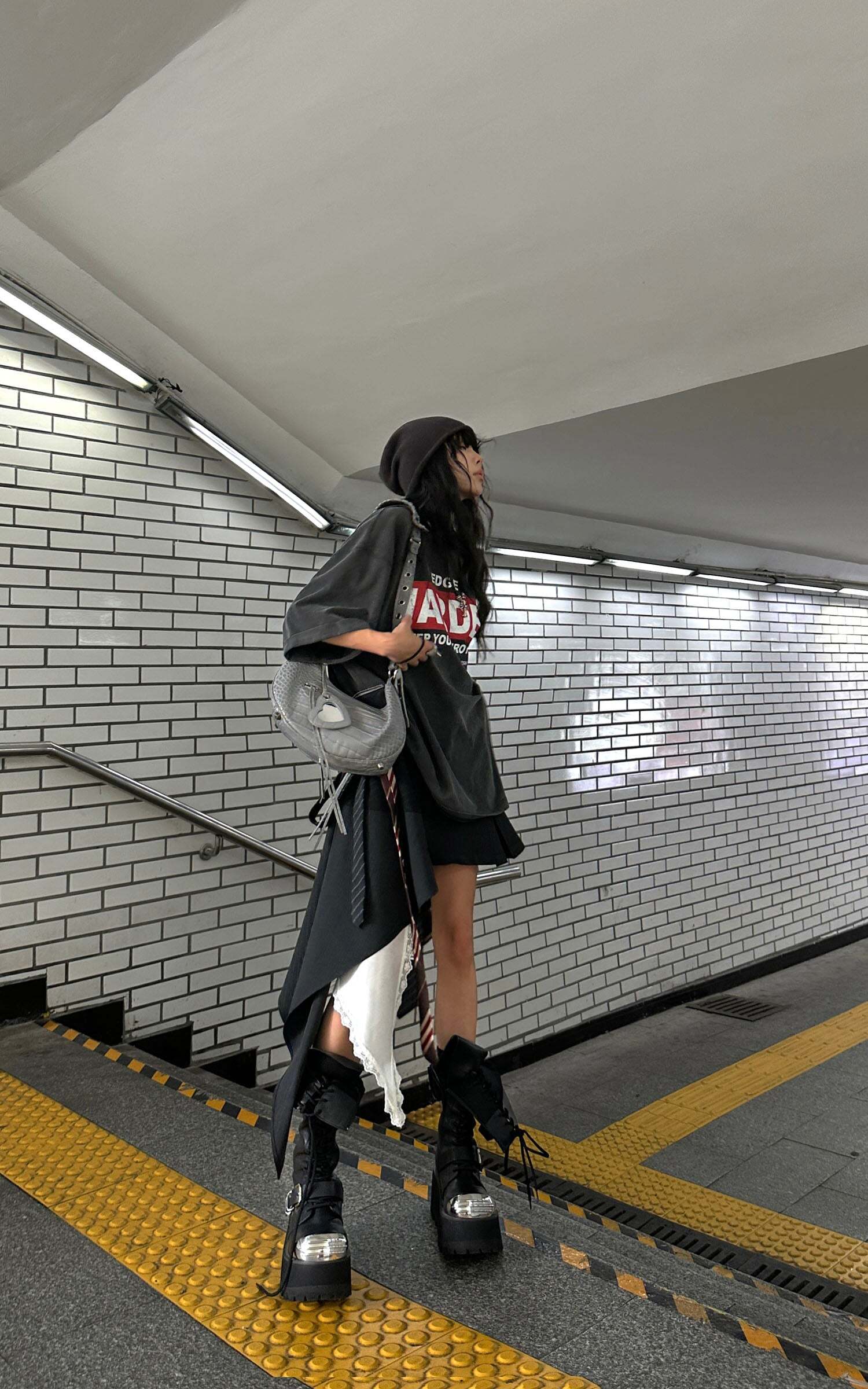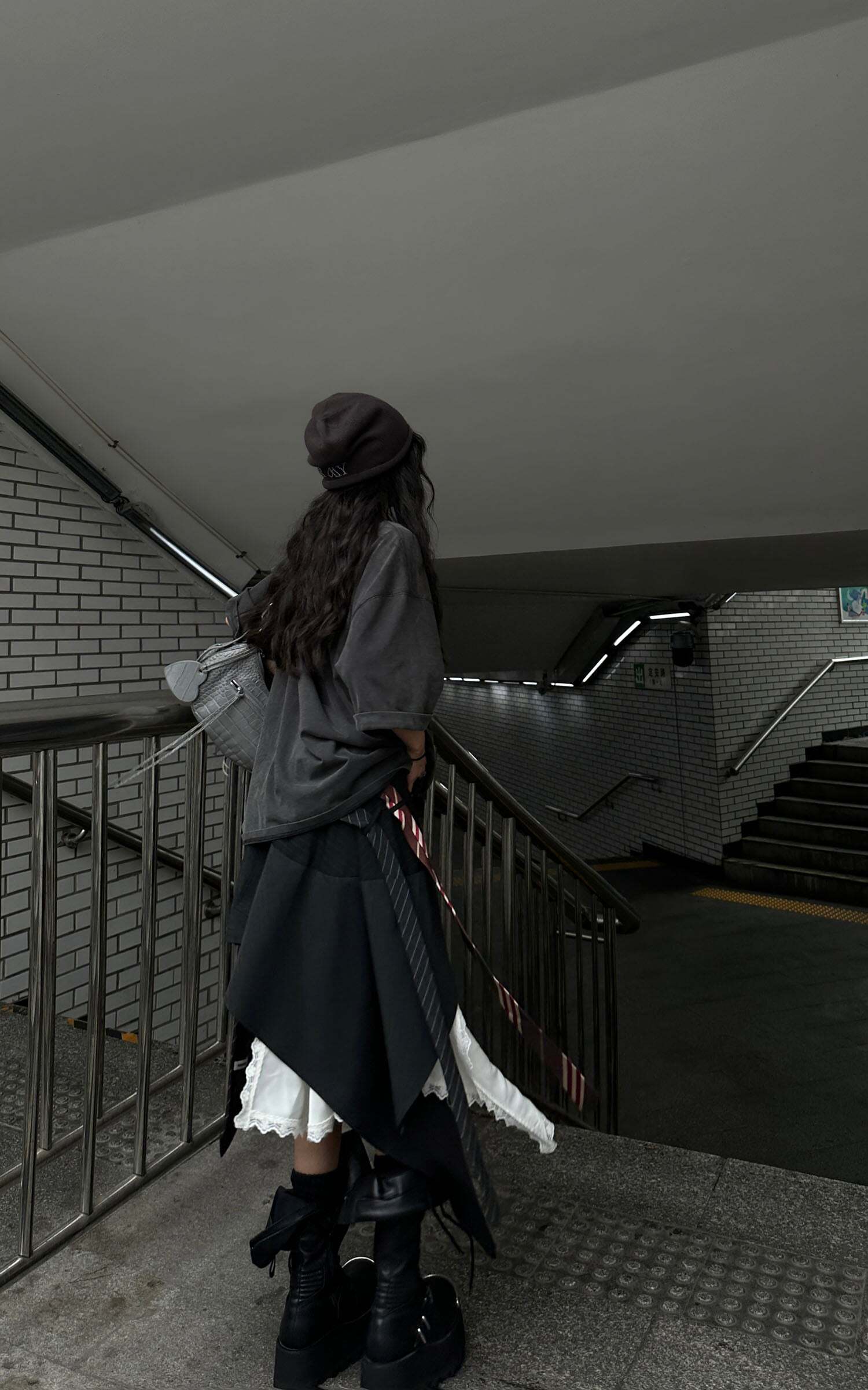 An elevated twist on tailoring—this asymmetric pinstripe mini skirt merges deconstructed suiting with street-inflected attitude. Cut in a draped silhouette, it features layered panels with raw-cut edges, striped tie accents that sway with movement, and delicate lace peeks from beneath. A side zipper and button closure secure the fit, while the flowing, uneven hemline adds directional energy. Pair it with oversized knits or graphic tees for a sharp contrast between structure and ease.