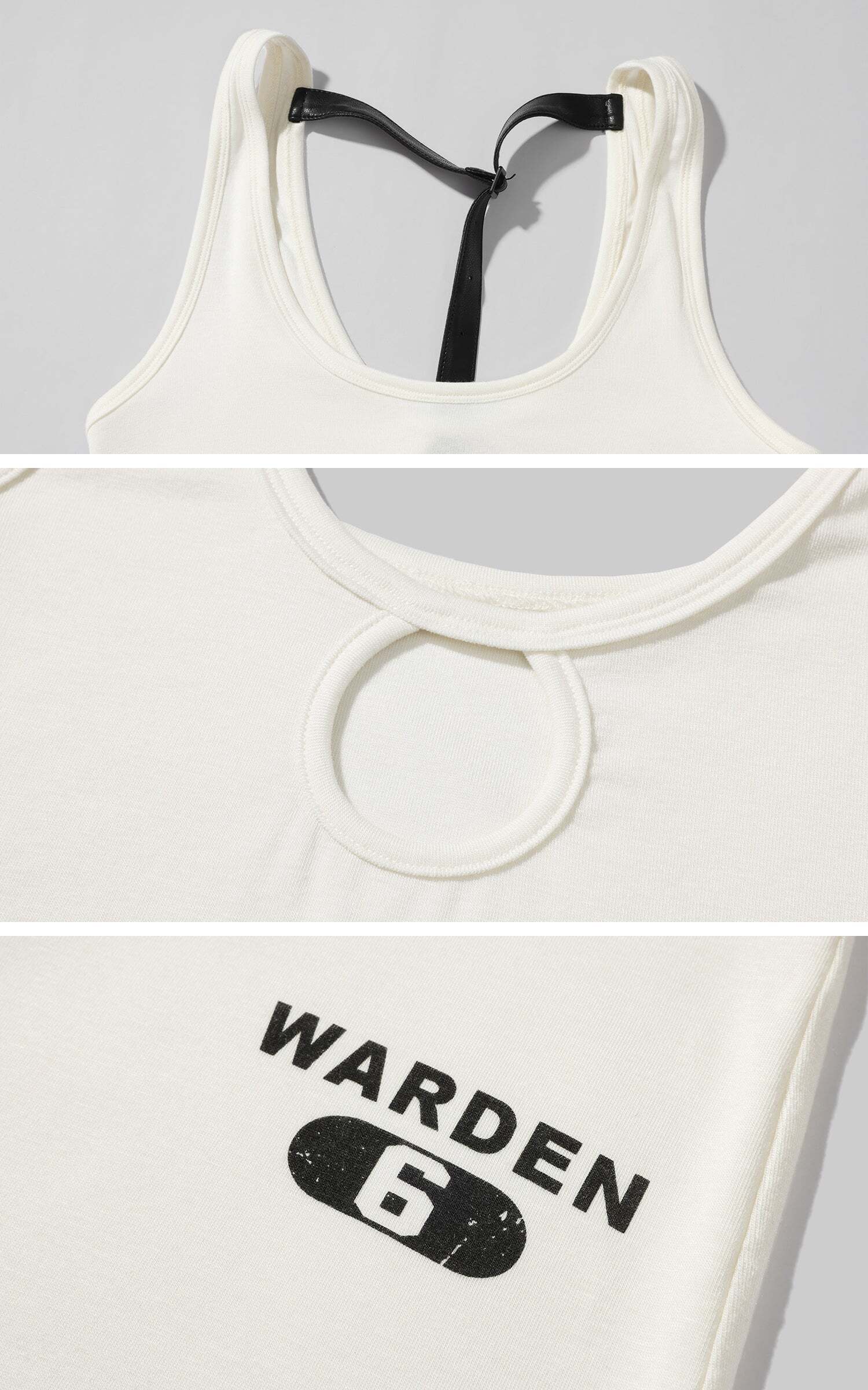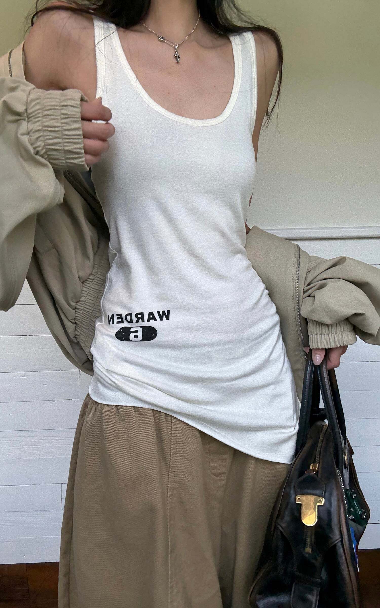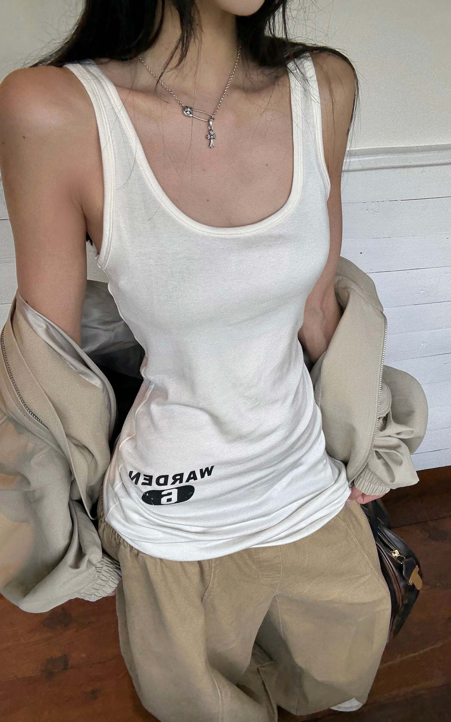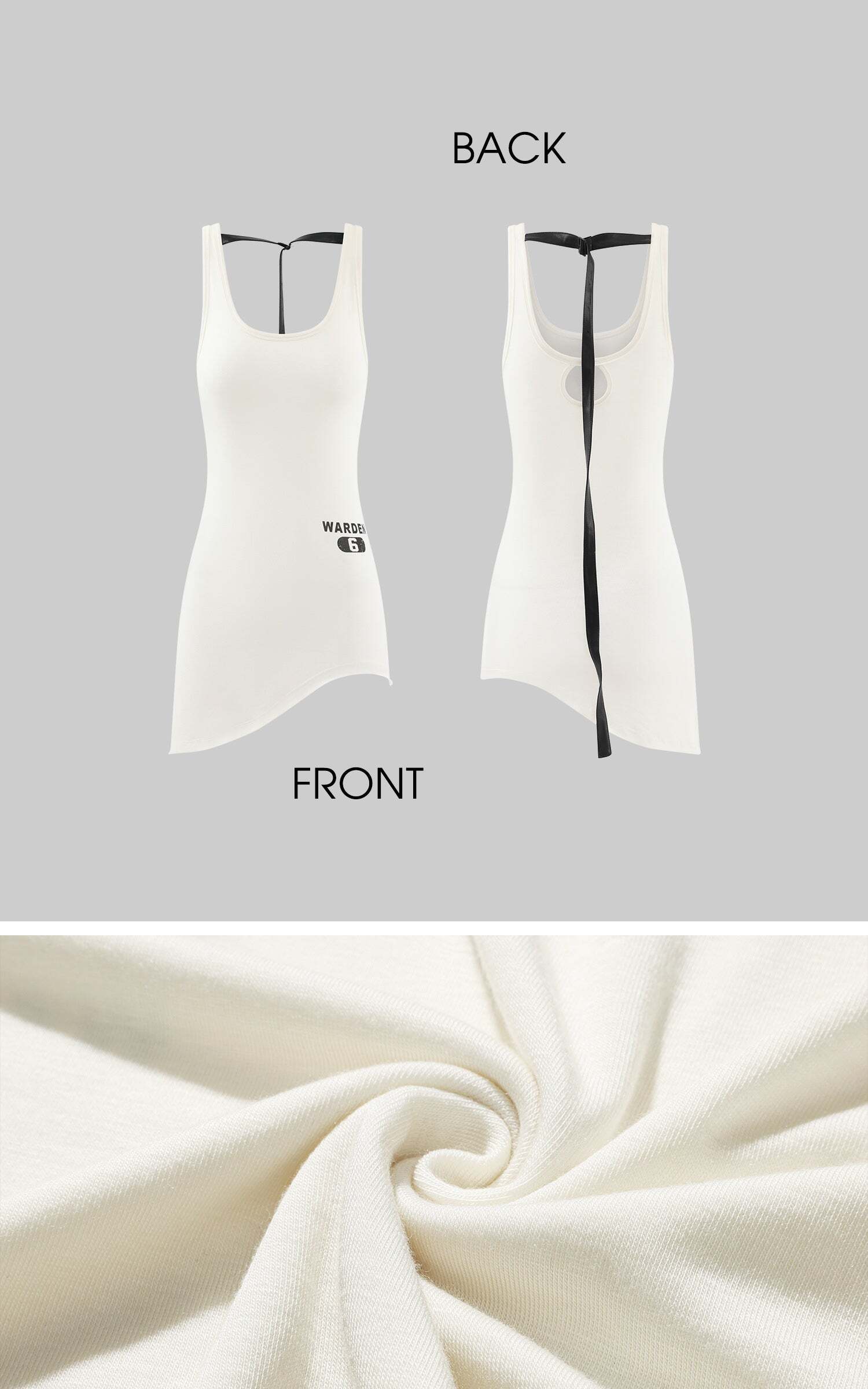 Cut close to the body with a directional edge, this asymmetric tank features a curved hemline and a back strap detail that shifts its attitude from basic to statement. Crafted from stretch cotton jersey, the piece balances comfort with bold shape. The minimalist print at the waist adds a raw, graphic touch, keeping the silhouette sharp and urban.