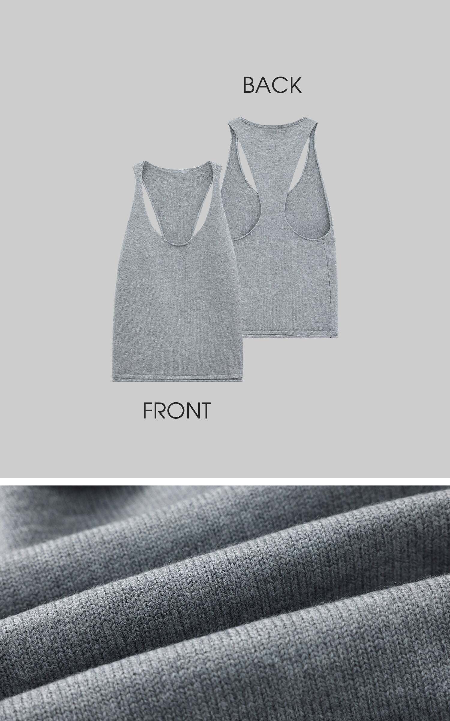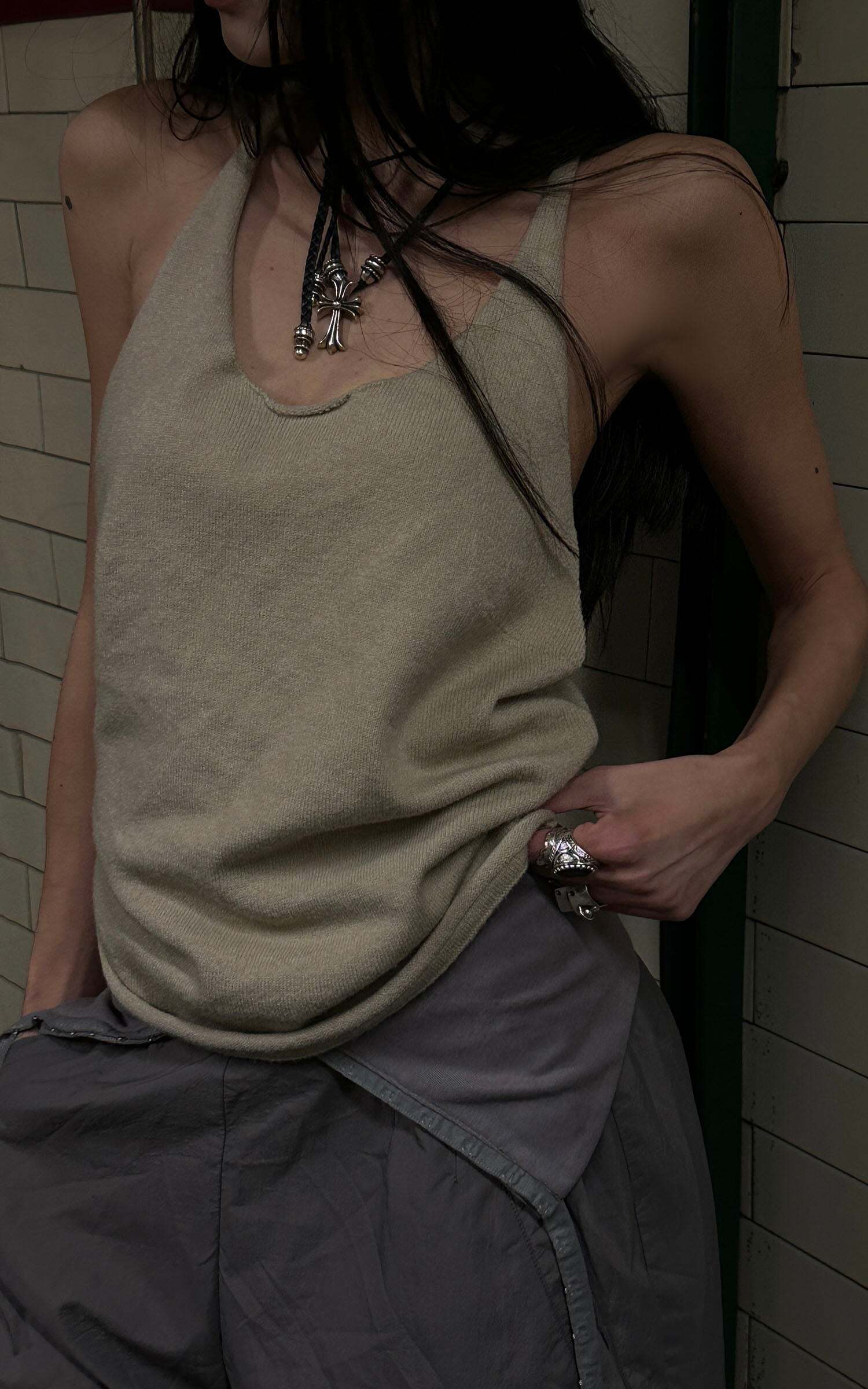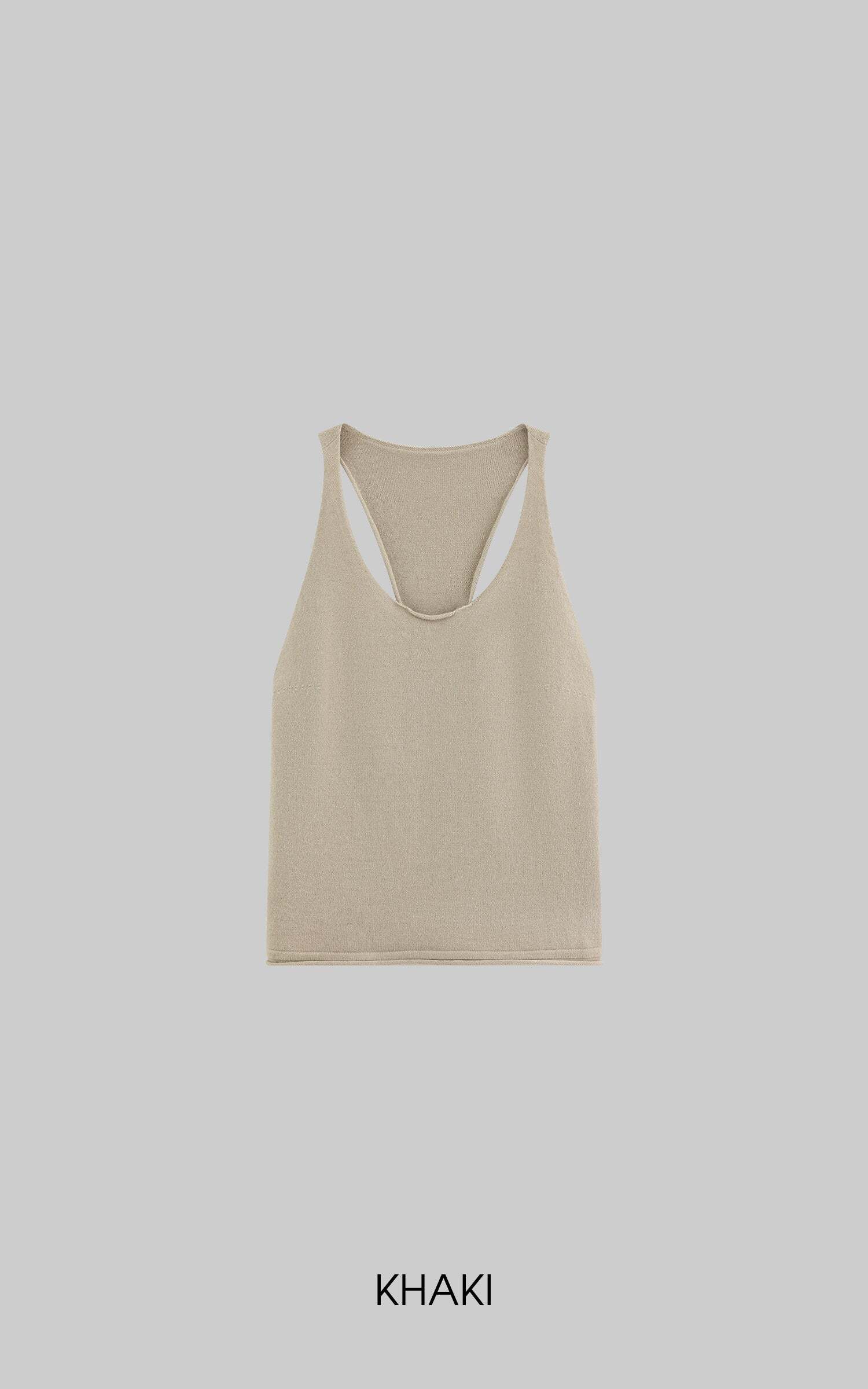 Elevate your wardrobe essentials with this backless knit tank top. Crafted with a focus on minimalism and texture, its racerback design and soft knit material redefine casual elegance. The lightweight fabric offers a relaxed fit, perfect for layering or wearing solo on warmer days. Pair it with wide-leg pants or a structured jacket for a seamless fusion of comfort and street style.