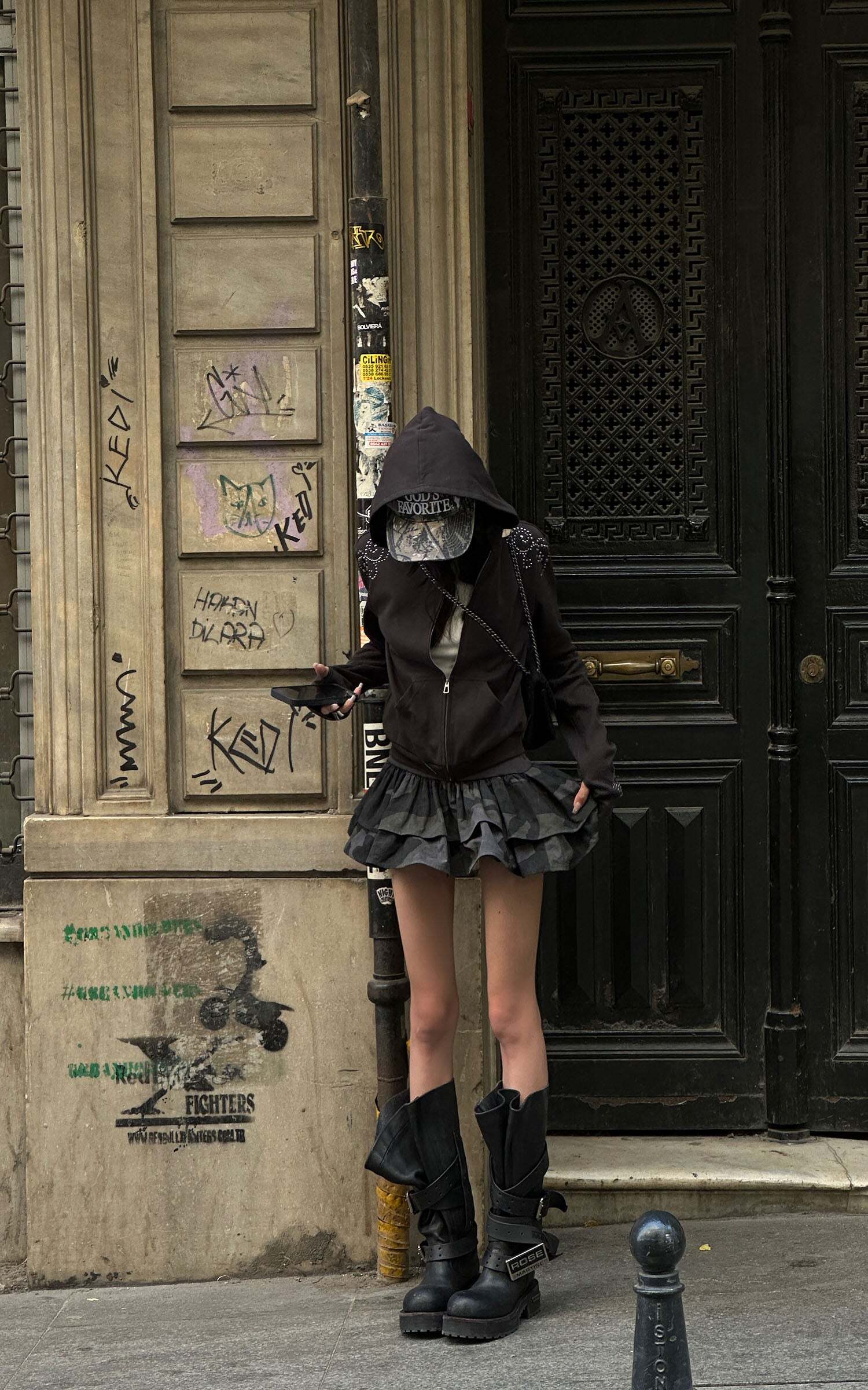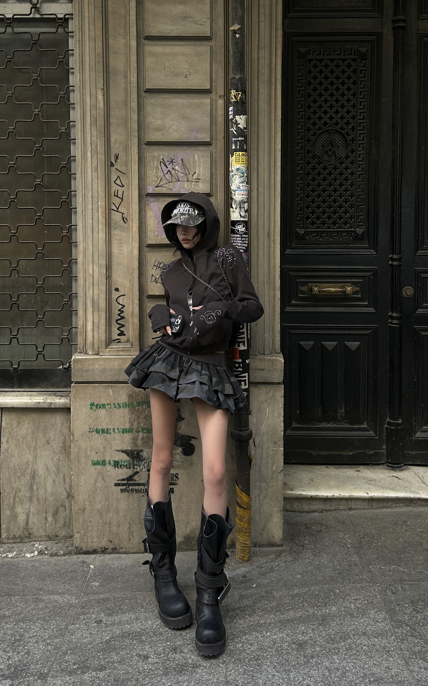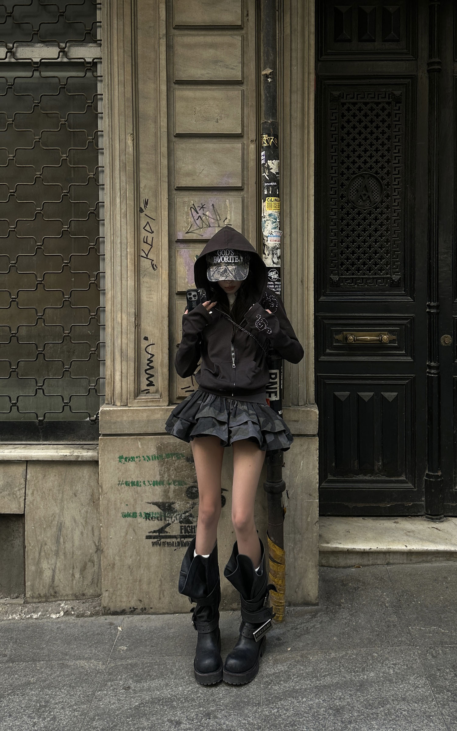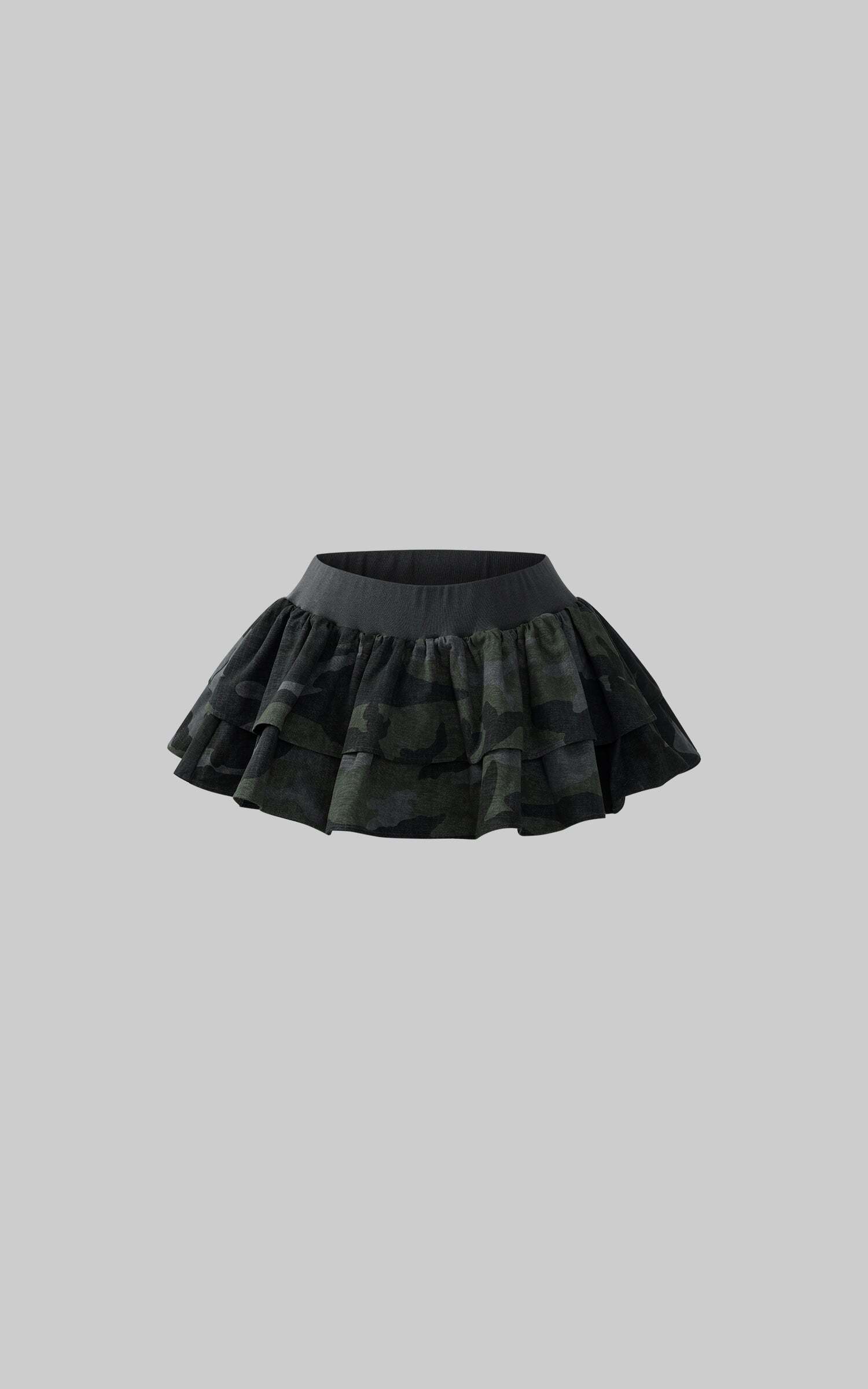 Urban edge meets rebellious detail in this layered camouflage mini skirt. Crafted with sharp pleats and a raw finish, the soft mesh structure floats with movement while staying grounded in utilitarian grit. Built-in shorts add effortless function beneath the tiered ruffles. Styled for the street but built for control—pair it with oversized boots or deconstructed hoodies to anchor the look. Bold, disruptive, and unapologetically off-code.