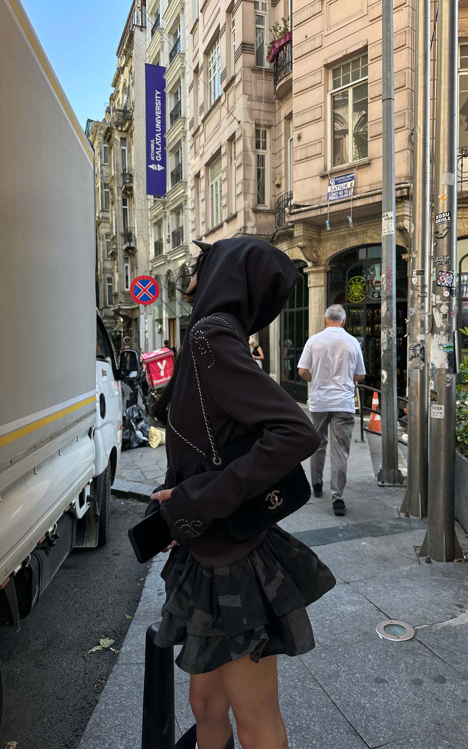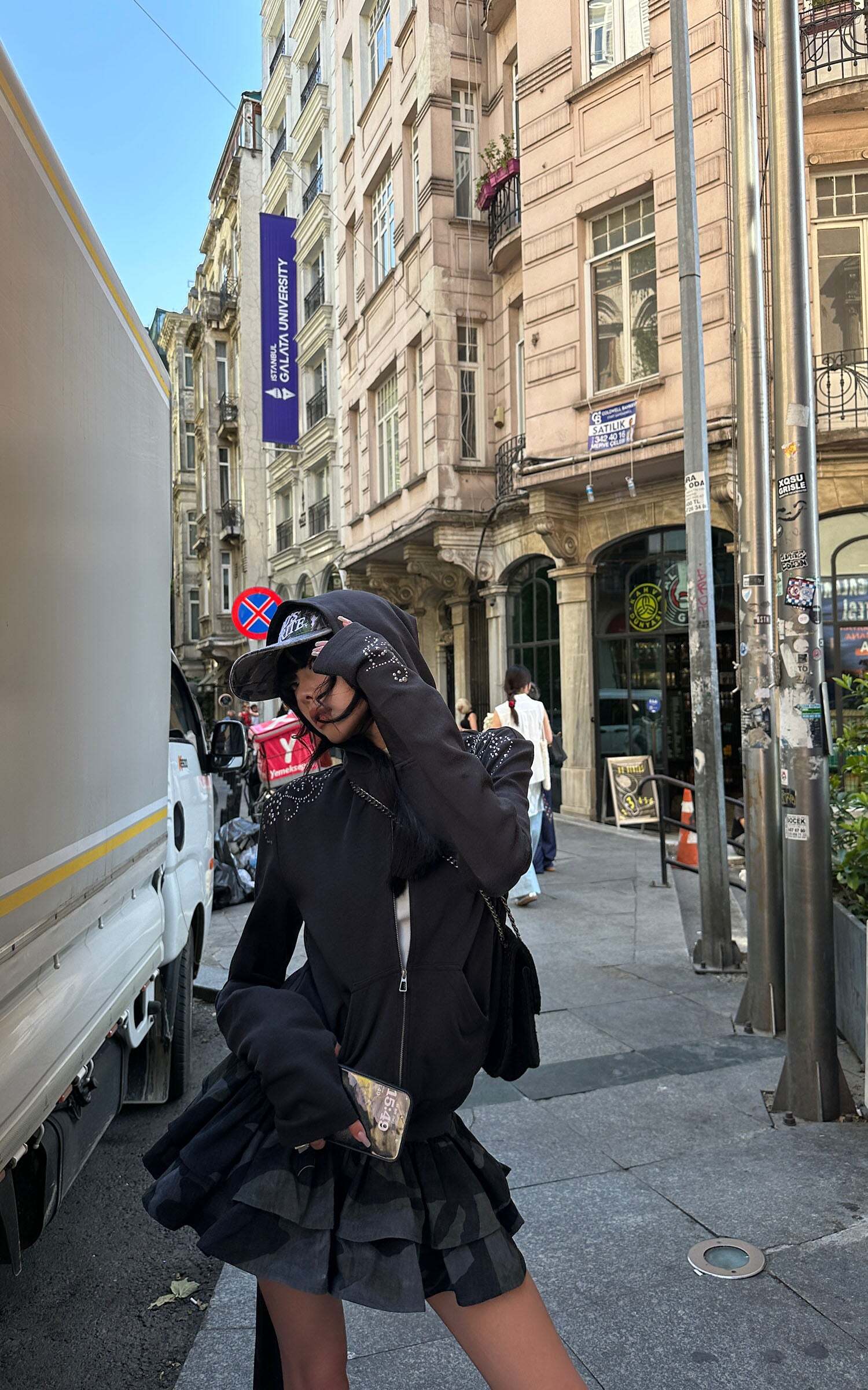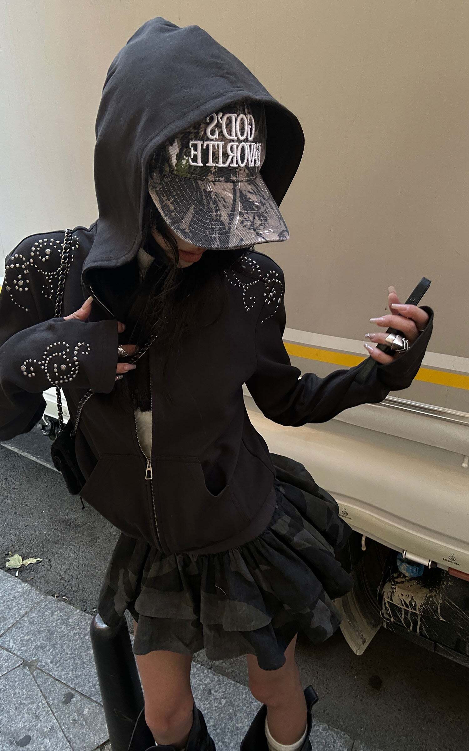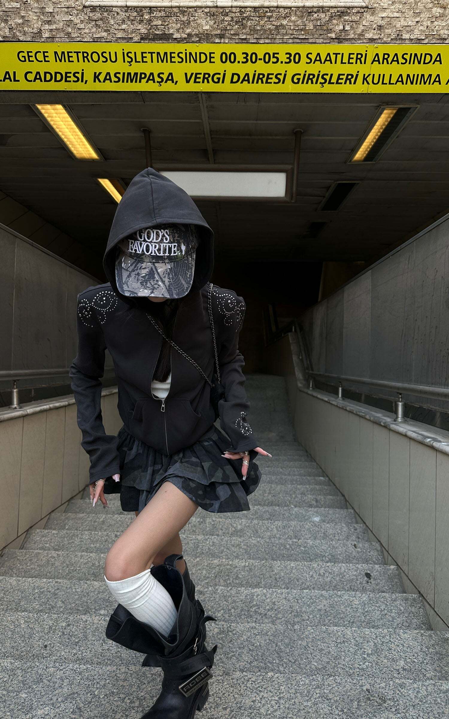 Urban edge meets rebellious detail in this layered camouflage mini skirt. Crafted with sharp pleats and a raw finish, the soft mesh structure floats with movement while staying grounded in utilitarian grit. Built-in shorts add effortless function beneath the tiered ruffles. Styled for the street but built for control—pair it with oversized boots or deconstructed hoodies to anchor the look. Bold, disruptive, and unapologetically off-code.