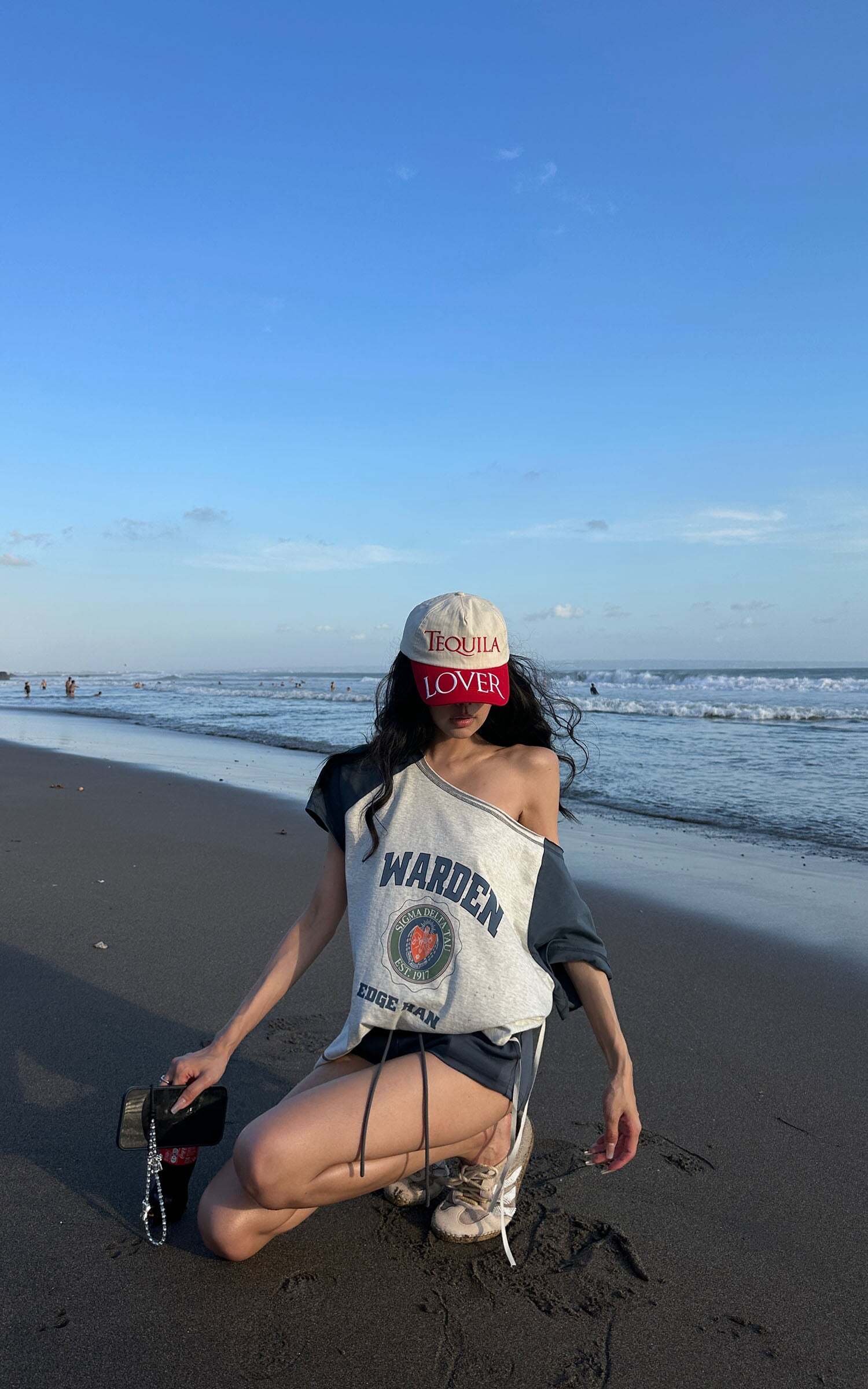 Loose fit, raw seams, off-the-shoulder fall—like you stole it from a college locker. Contrast sleeves and exaggerated stitching build sharp outlines. The emblem print on the chest taps into varsity nostalgia, reworked with street precision. Adjustable back tie lets the neckline slip, adding nonchalant shape to a deliberately undone silhouette.