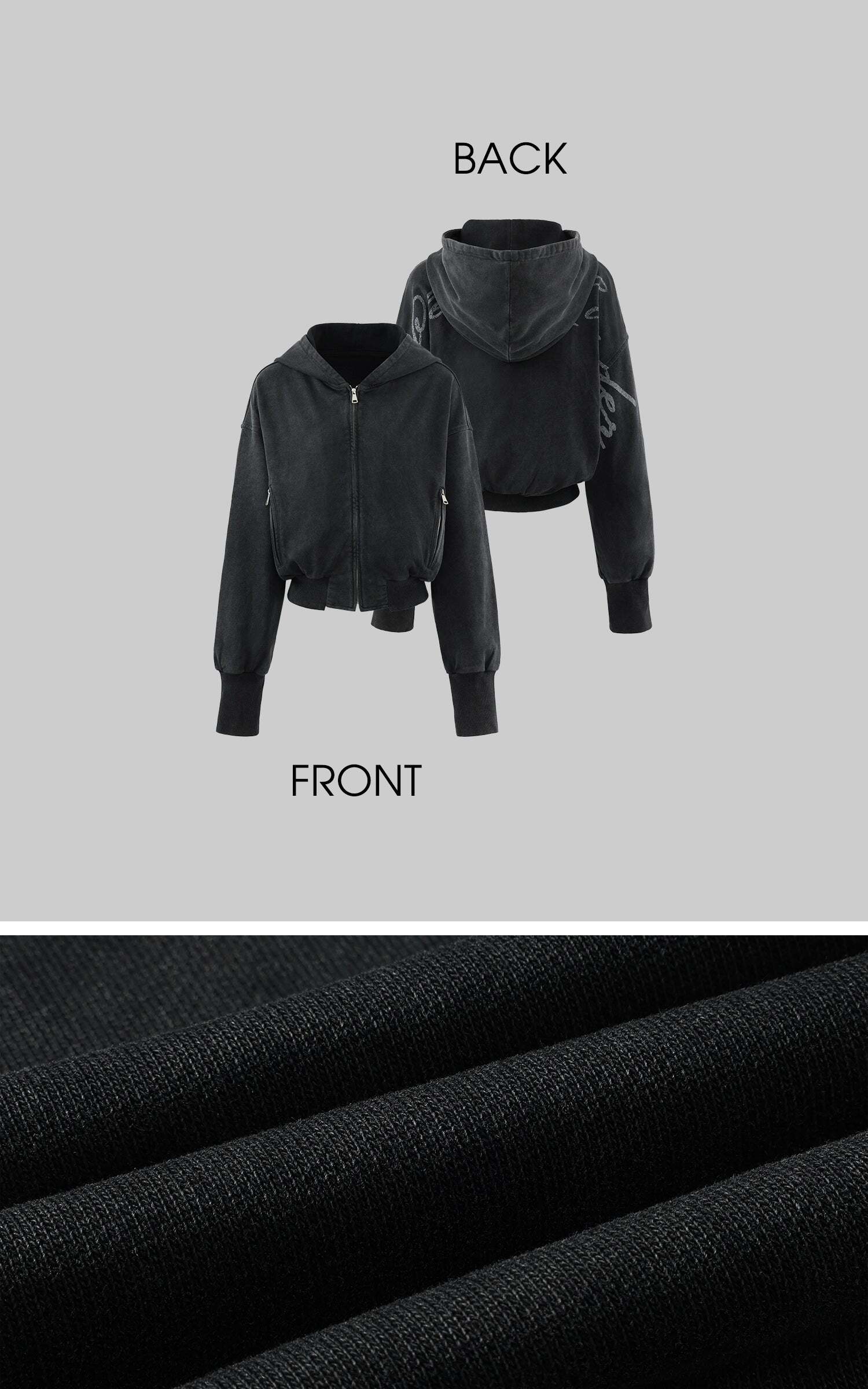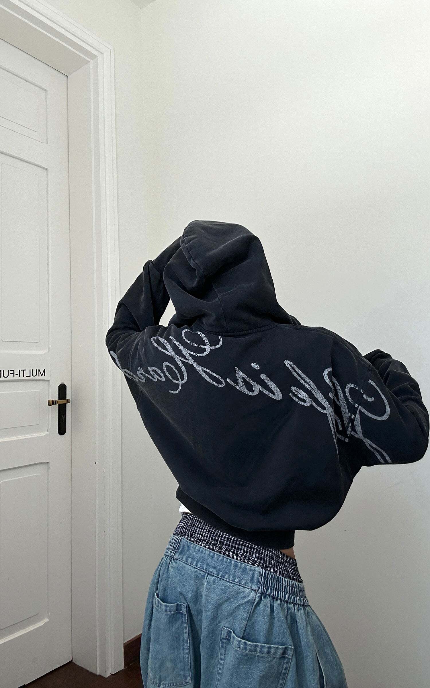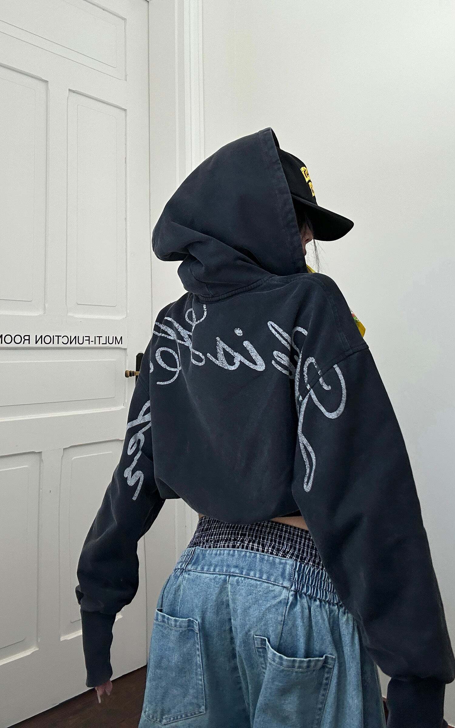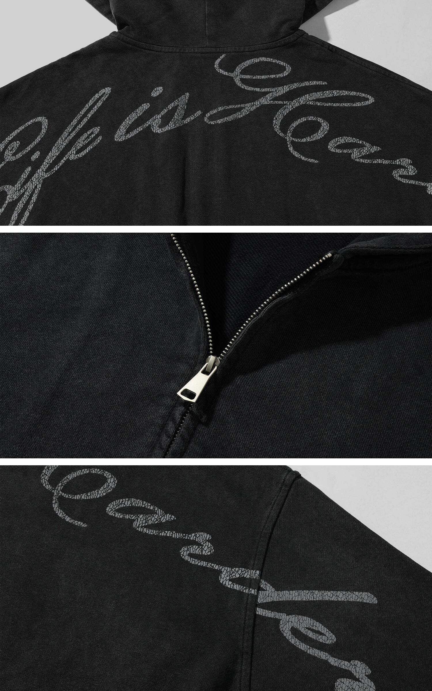 A cropped silhouette built for edge. This hoodie features an oversized fit with structured rib hems, subtle zip details, and a cracked-effect back print reading Life is Hard. Washed black cotton gives it a worn-in, lived look. Wear it loose for nonchalant layering or style it sharp with wide-leg pants—either way, it defines street uniform with quiet defiance.