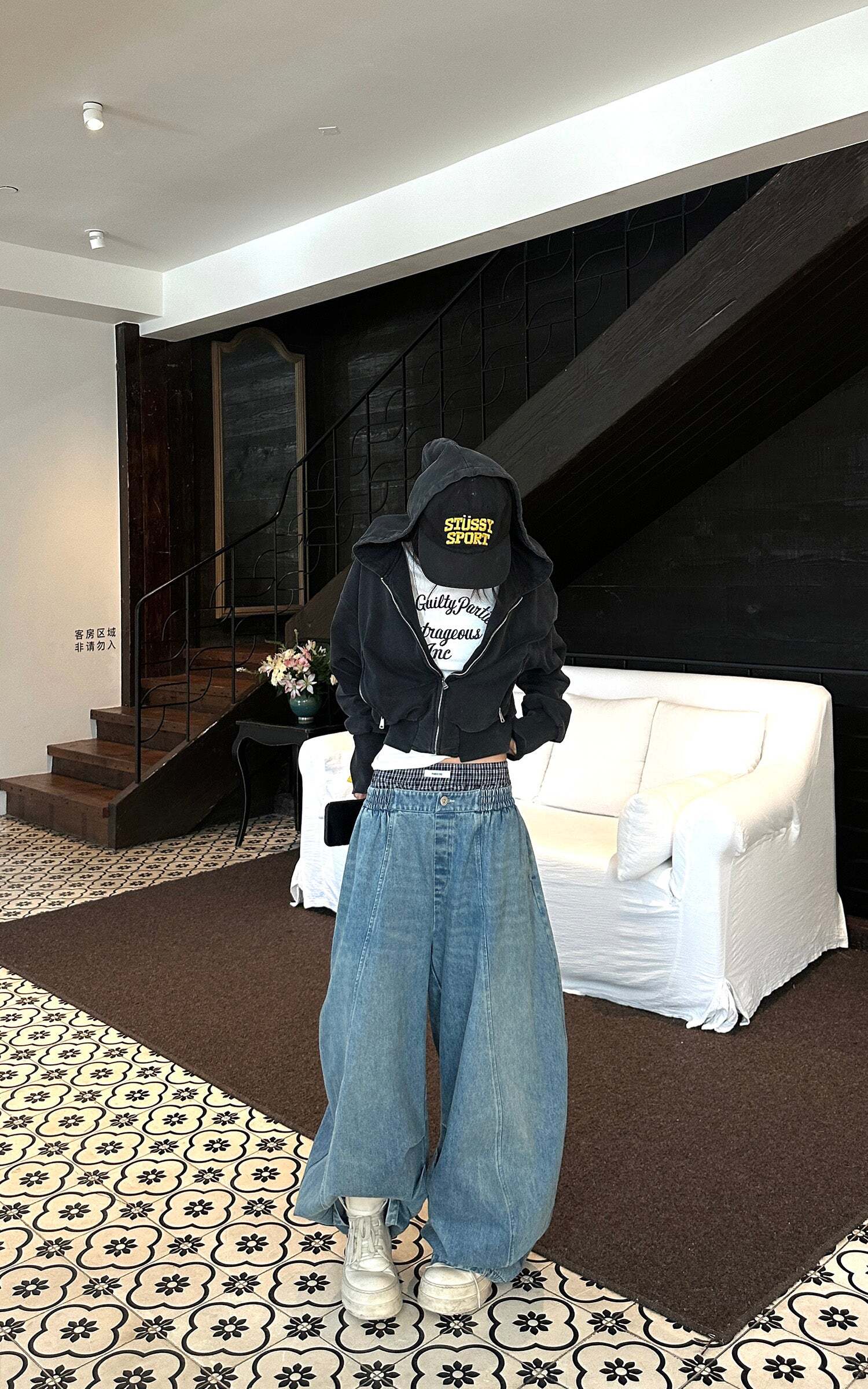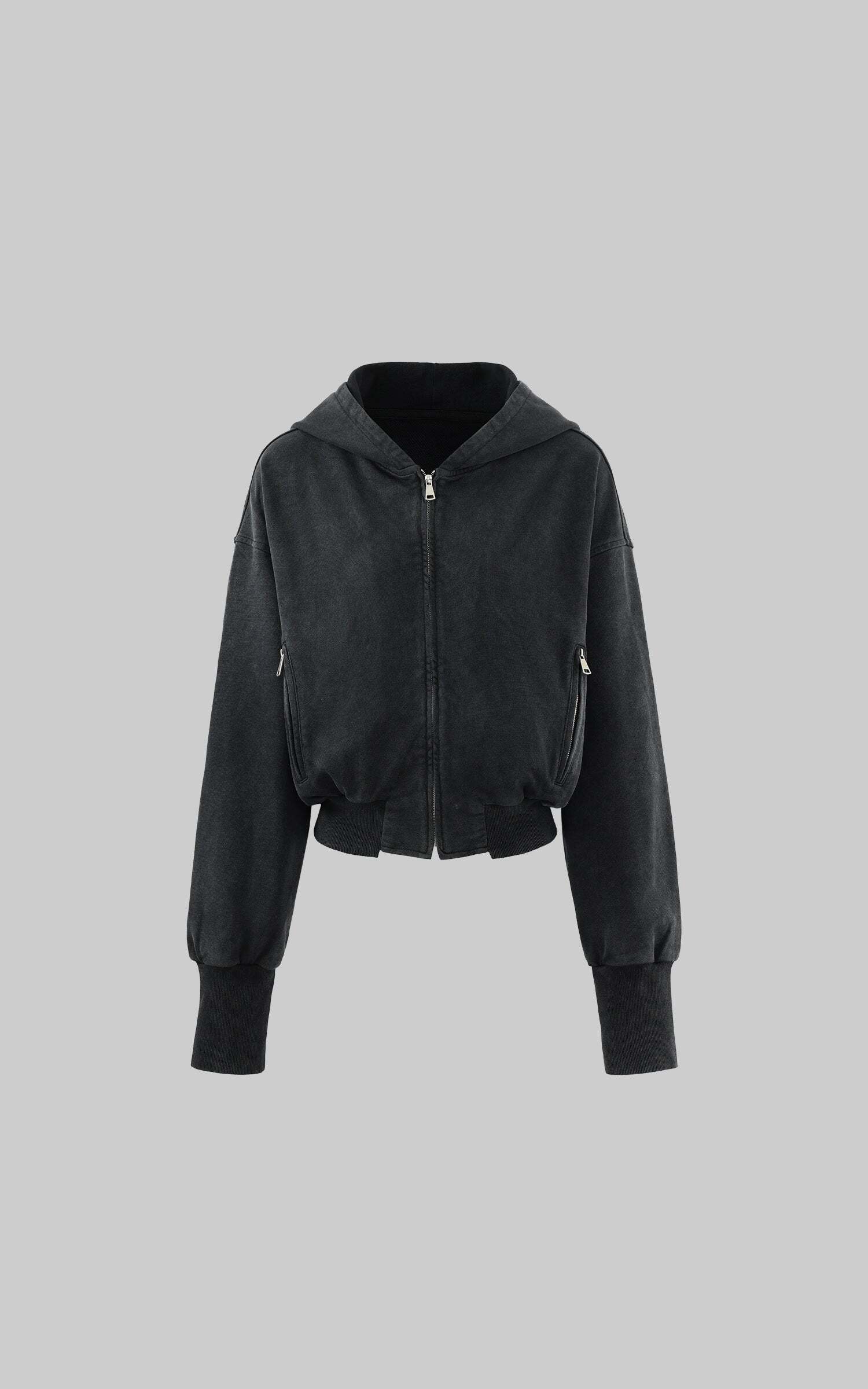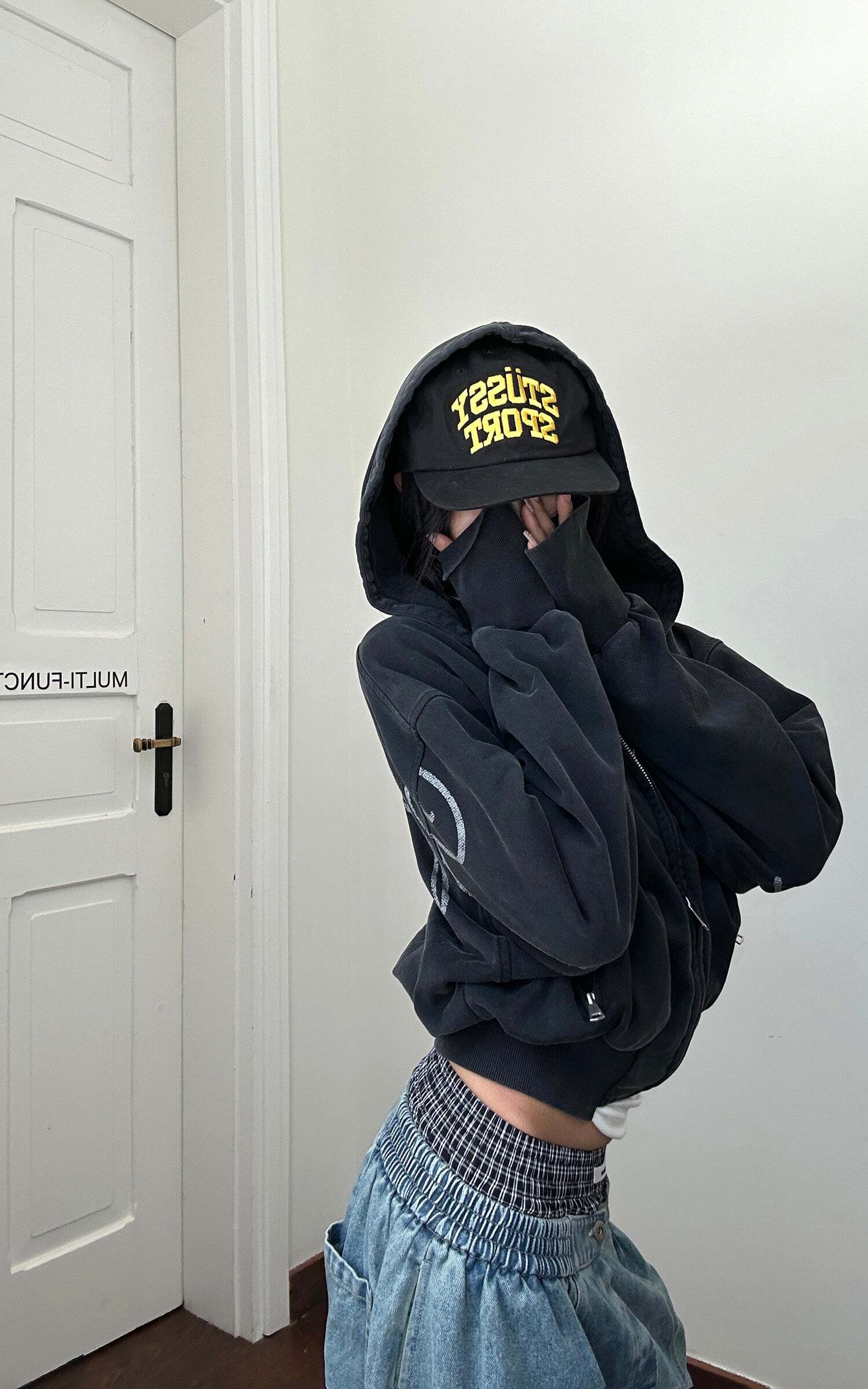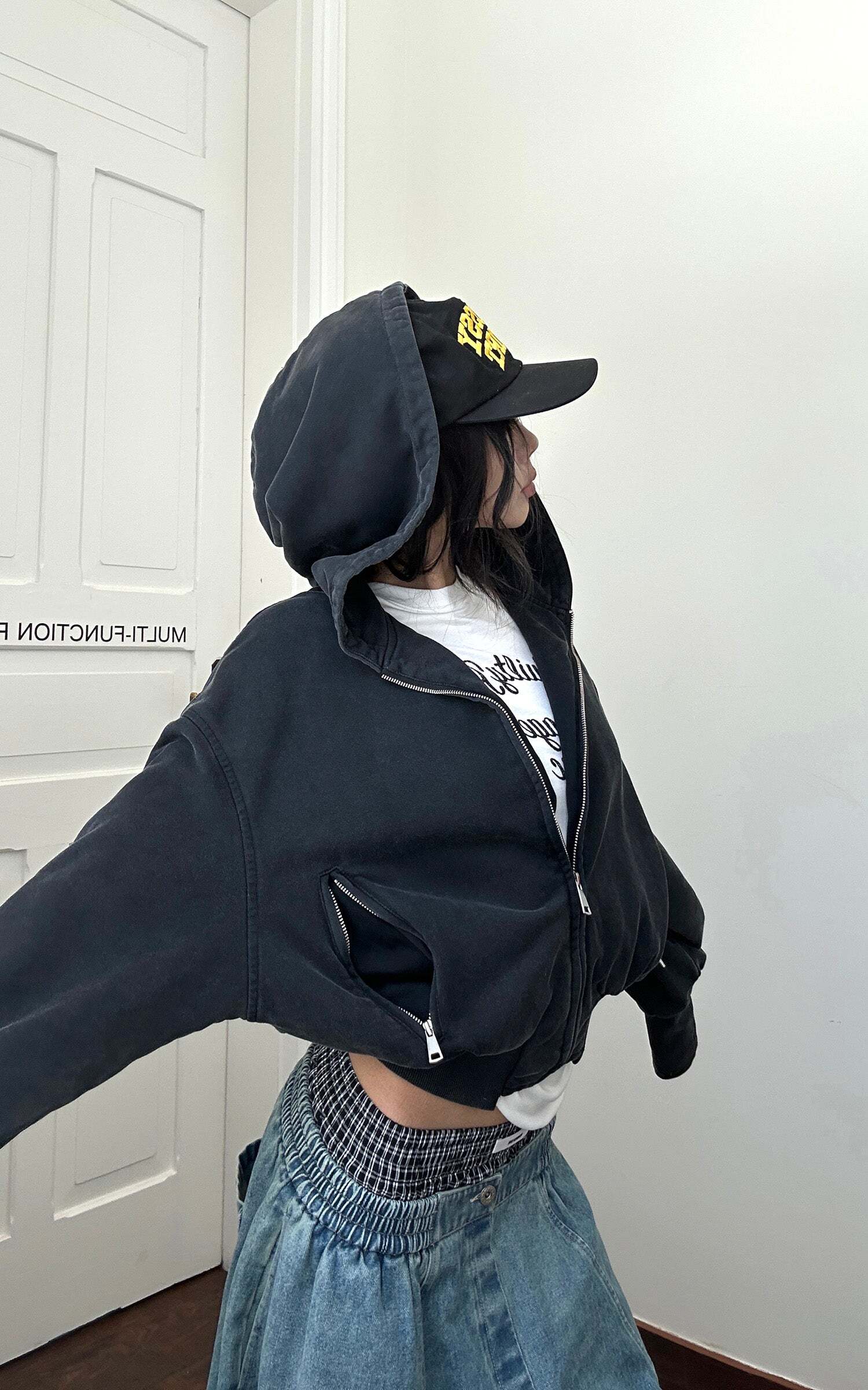 A cropped silhouette built for edge. This hoodie features an oversized fit with structured rib hems, subtle zip details, and a cracked-effect back print reading Life is Hard. Washed black cotton gives it a worn-in, lived look. Wear it loose for nonchalant layering or style it sharp with wide-leg pants—either way, it defines street uniform with quiet defiance.