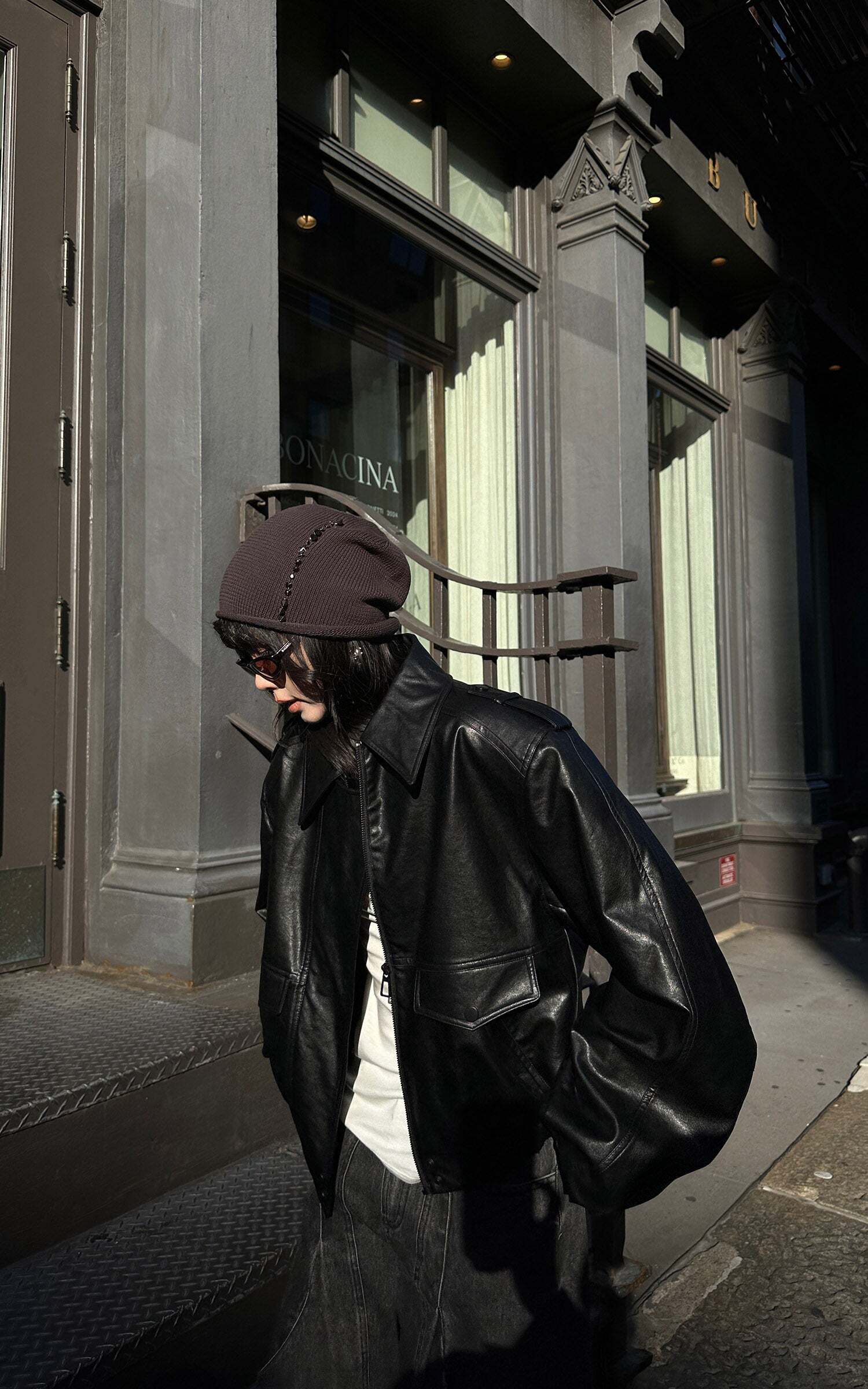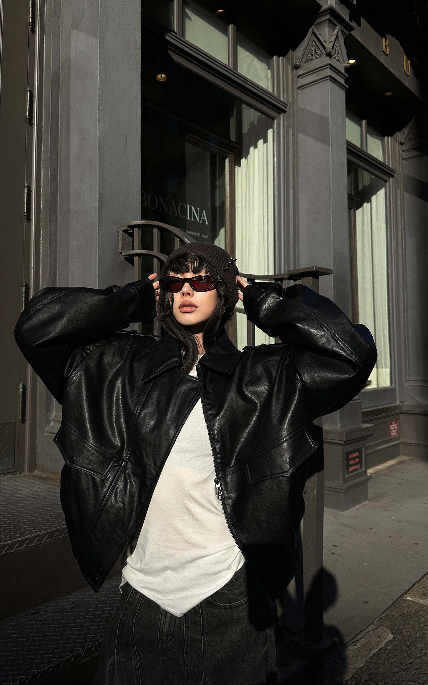 A structured leather jacket with a cropped cut and oversized shoulders, built on a sharp silhouette. Military-inspired epaulettes, flap pockets, and a concealed zip closure balance functionality with urban edge. The elasticated hem adds shape and volume, giving the piece a boxy yet refined proportion. Style it with relaxed denim or tailored bottoms for a statement layering essential.