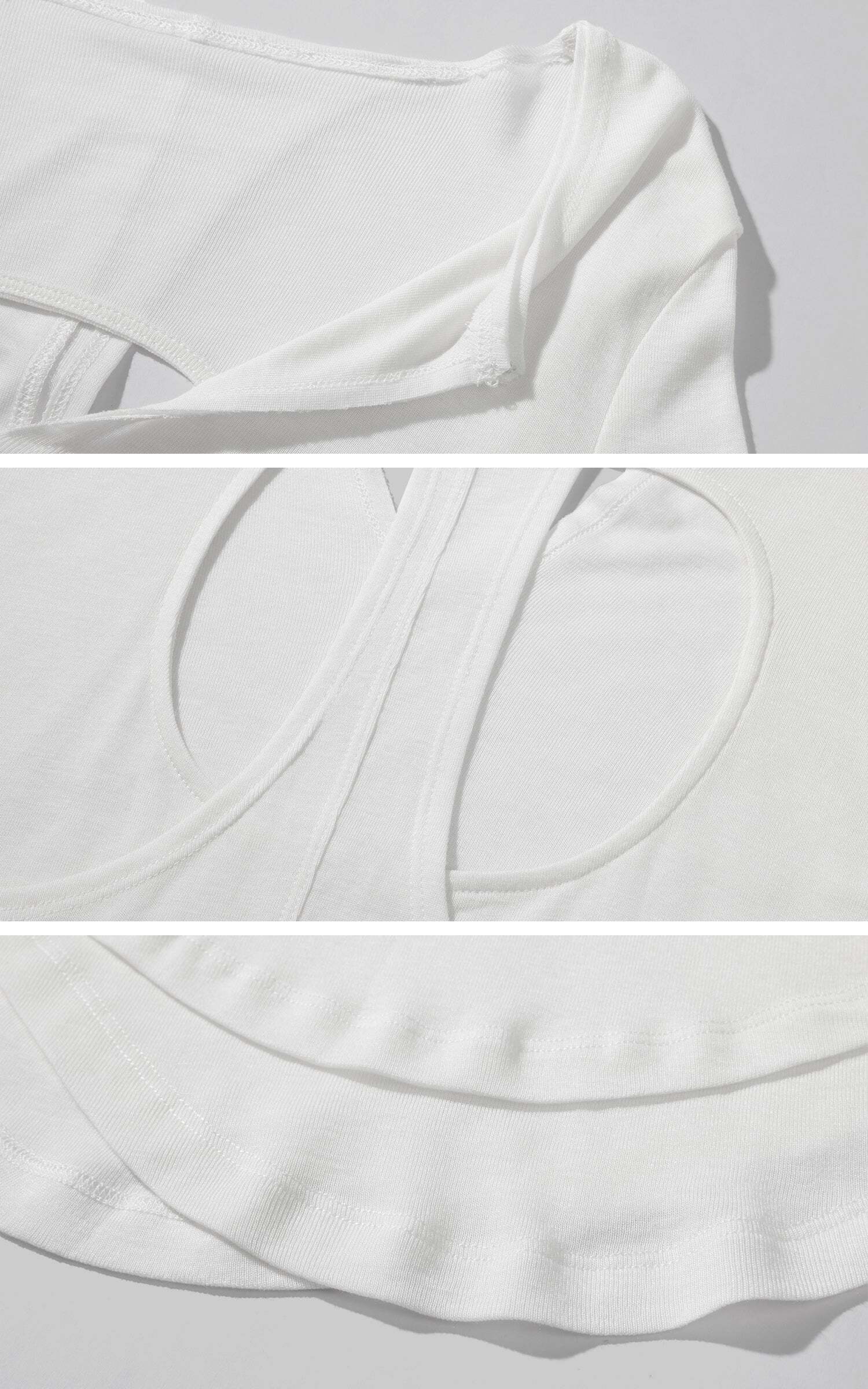 A minimal piece with tension in its cuts. The top features an asymmetrical neckline and a cutout back layered with a racerback tank insert. Slightly sheer, slim-fit, and elongated through the body, it skims the shape without restricting it. Finished with raw edge accents and curved hems—built for solitary movement, not perfection.