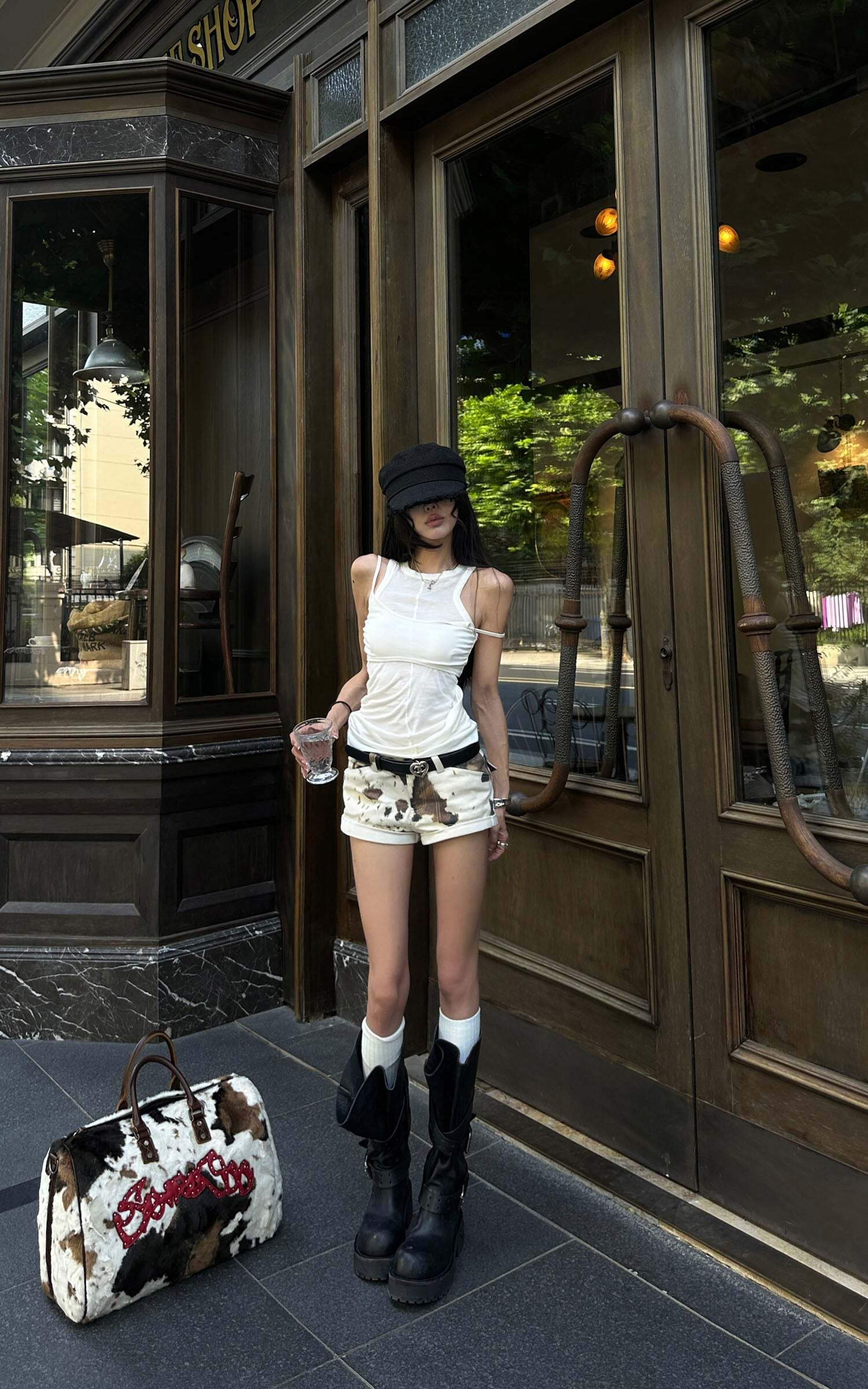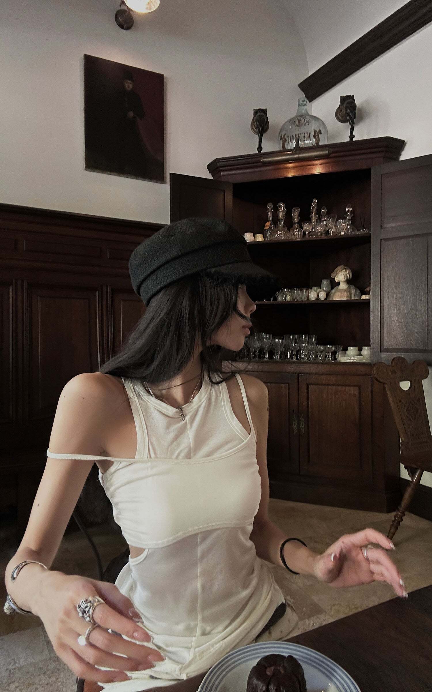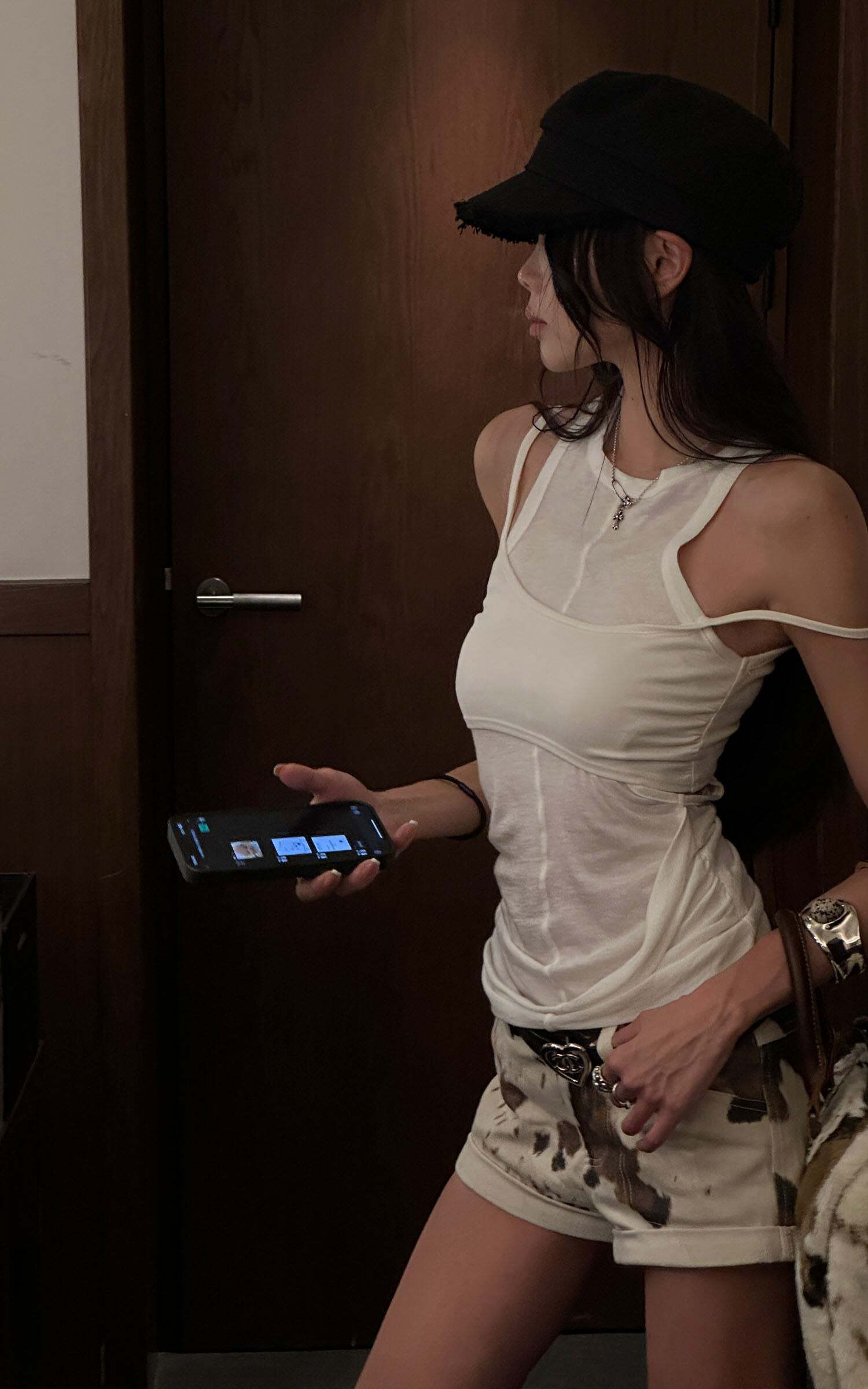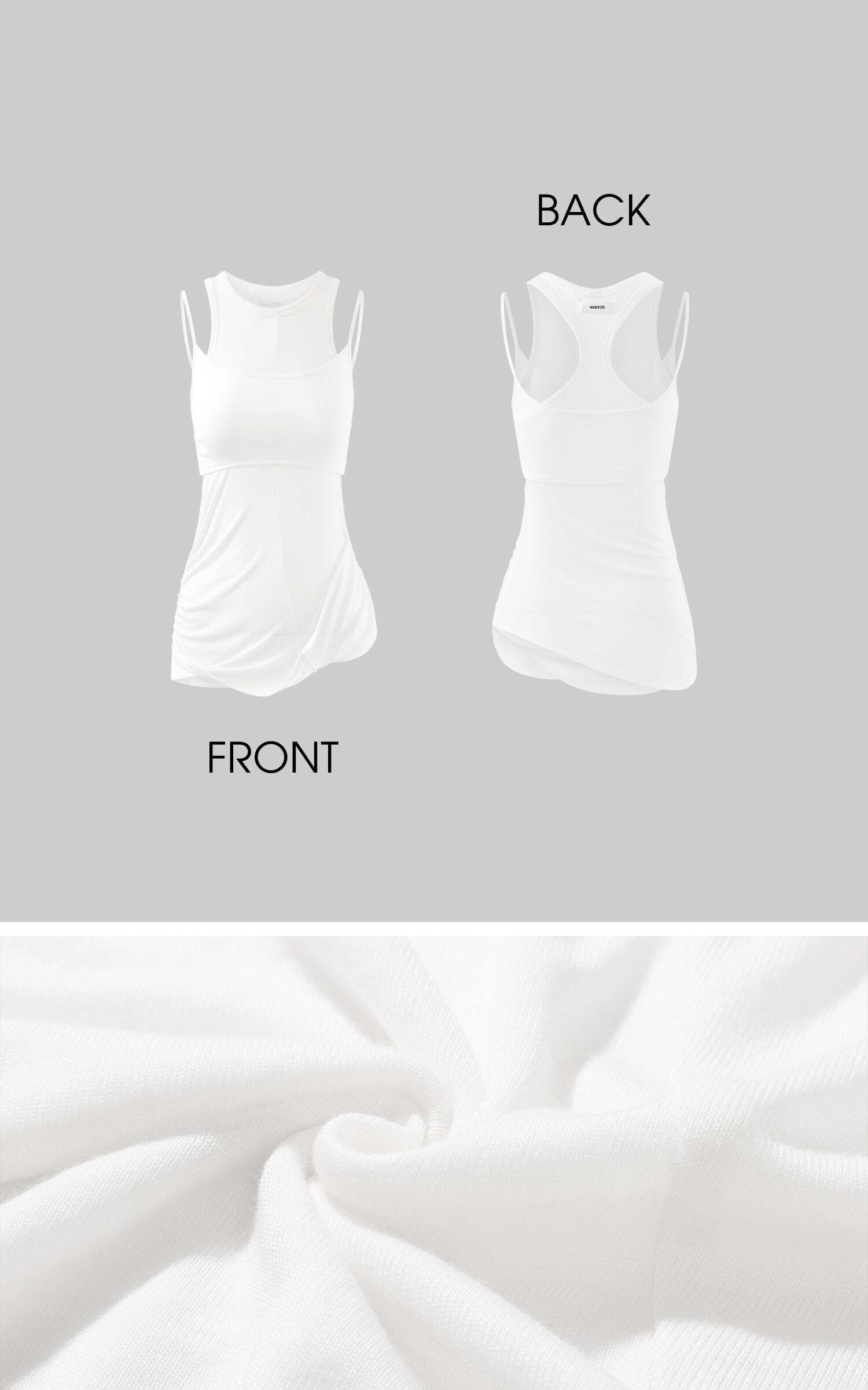 A deconstructed take on the everyday tank, featuring double strap detailing and a layered cutout silhouette. Crafted in a soft, lightweight stretch knit that drapes against the body, the design plays with proportion through its asymmetric hem and subtle side gathers. Perfect for pairing with statement bottoms or worn alone for a directional, street-ready look.